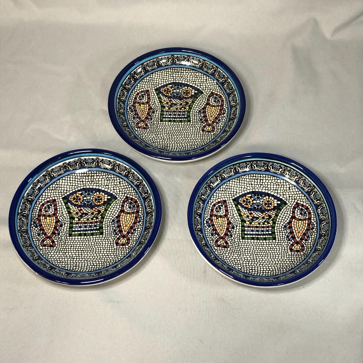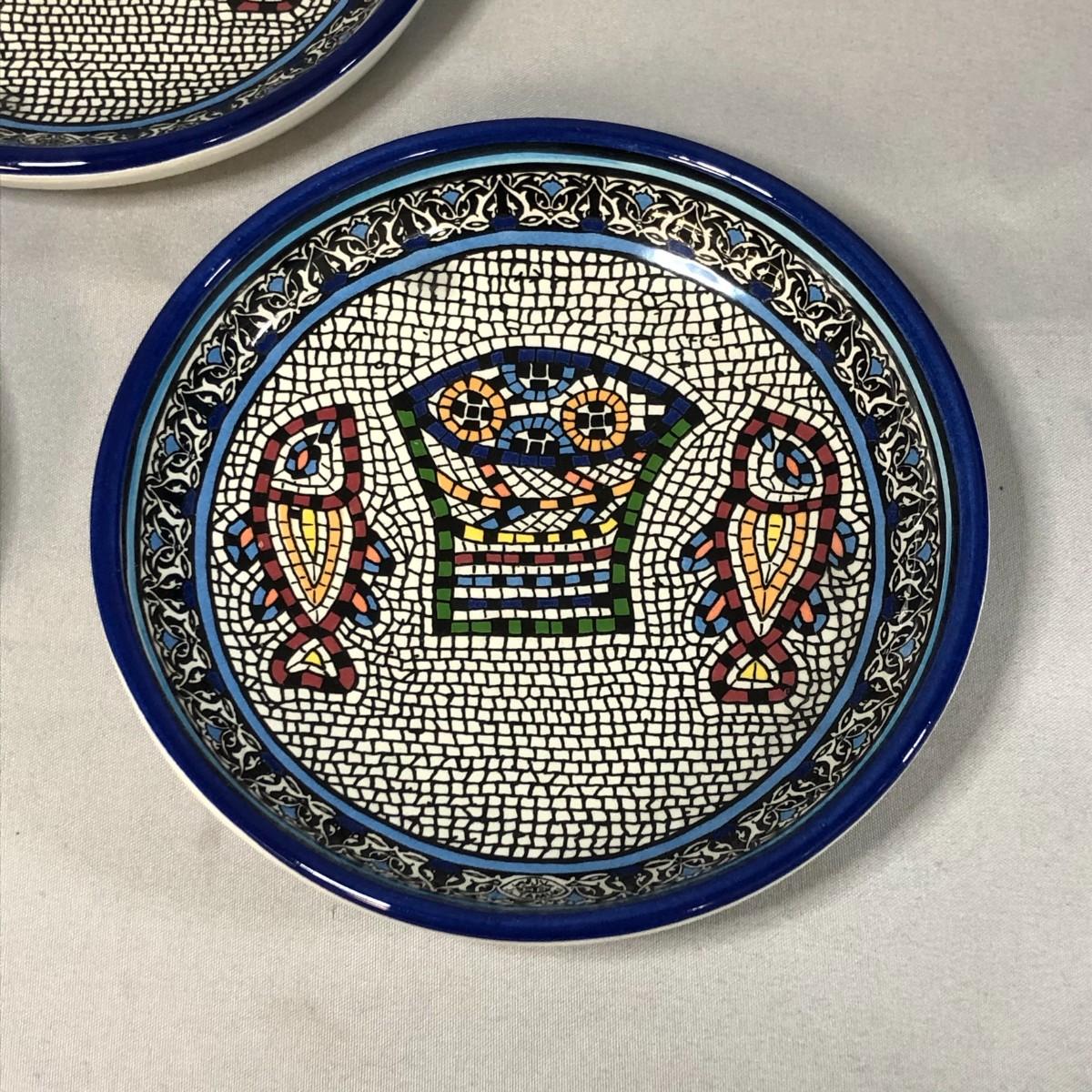 Pretty dish that has a design that looks like loaves and fishes done in mosaic (it's not a real mosaic, it's painted on). Each of these dishes is about 5.25" and in excellent condition.