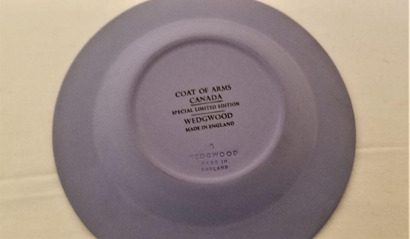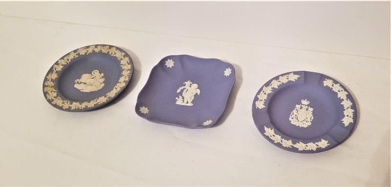 Lot of 3 Wegwood blue Jasperware pieces - one ashtray and two trinket dishes as shown. The ashtray is marked "Limited edition - Coat of Arms Canada". They average 4.25" across. Good used condition.