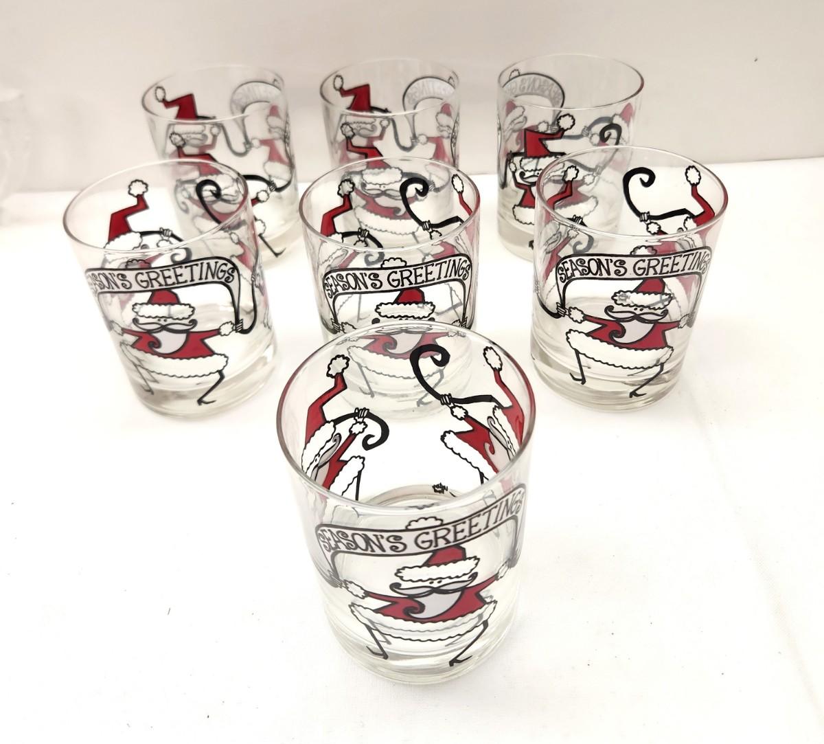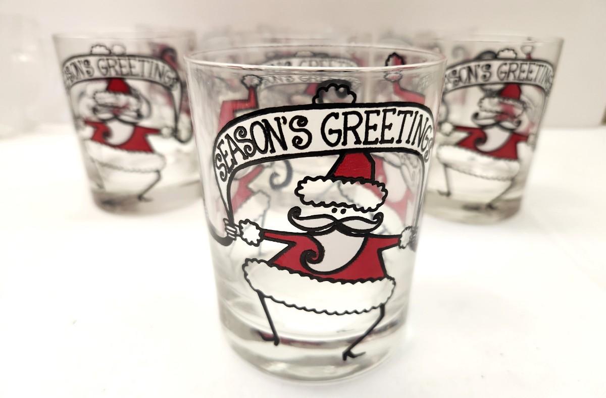 From InterLine (signed) - vintage barware with a groovy Santa - lot of 7 Old Fashion glasses - this pattern is scarce and hard to find. Good condition. Made in the 1970's - each 4.25" tall.