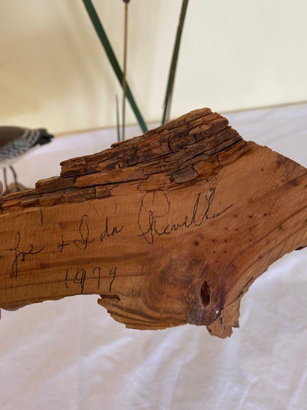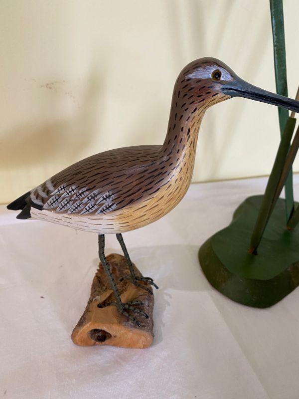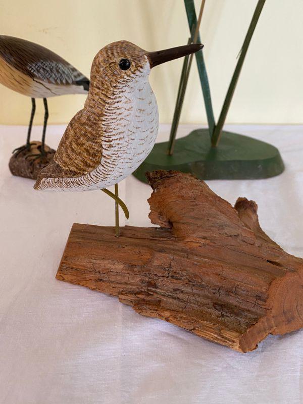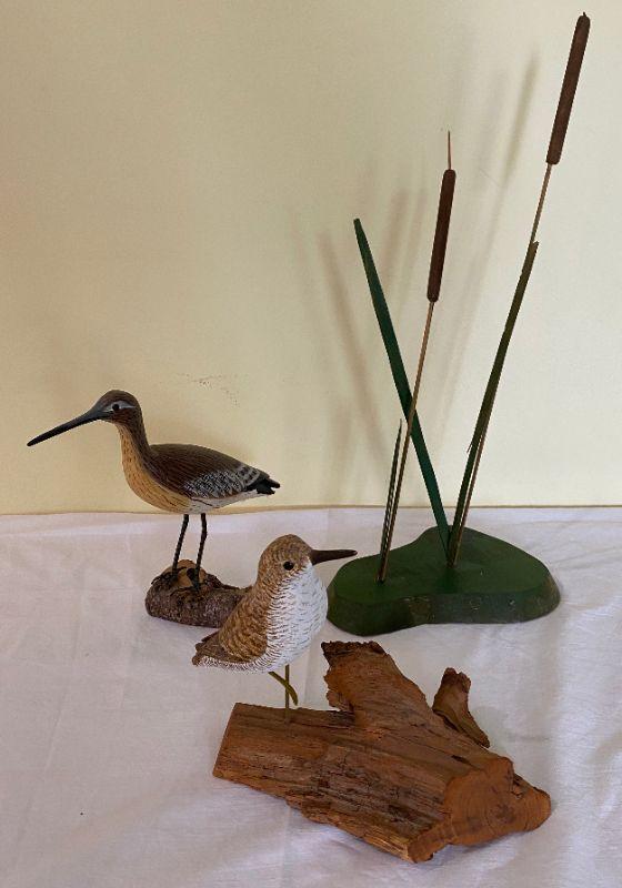 Lot of 3 Signed carved pieces Two small carved birds on wood. The bird with the smaller driftwood appears to be handmade but no signature he measures approximately 7.5" tall , the bird with the larger base is signed and the cattail is signed and measures approximatley 6" tall please see pictures