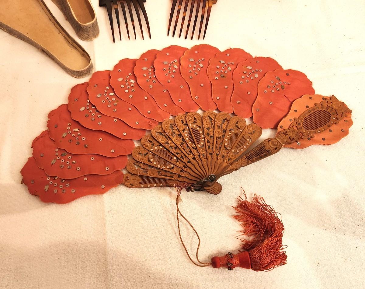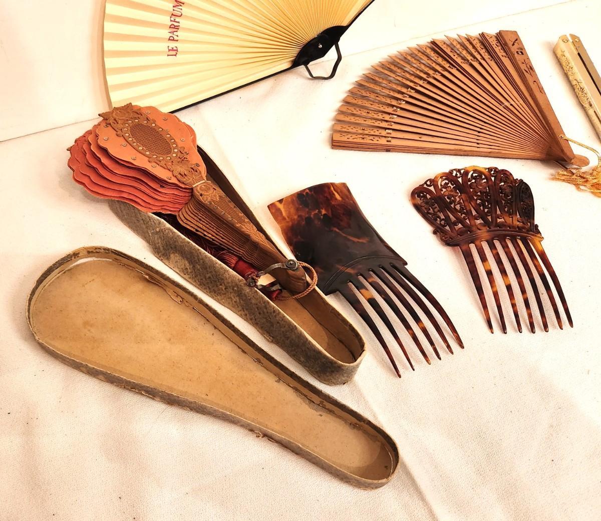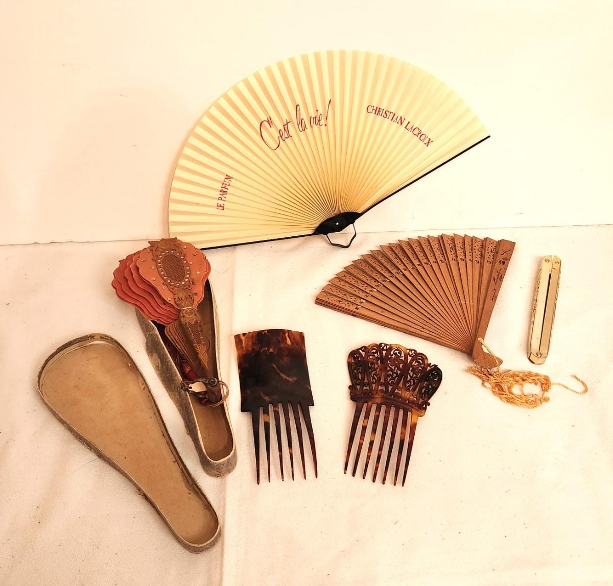 Nice vintage lot here - two faux tortoise shell hair combs, several vintage fans (one in original box). You get all you see here.