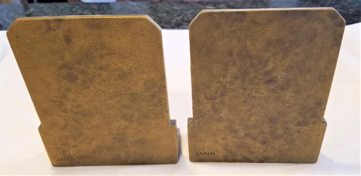 Marked "Japan" on the reverse, probably 1945-1960 - pair of heavy metal Japanesque style bookends. Each measures 4 inches wide at the base and about 5 inches tall. Good condition.