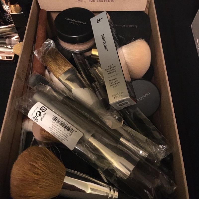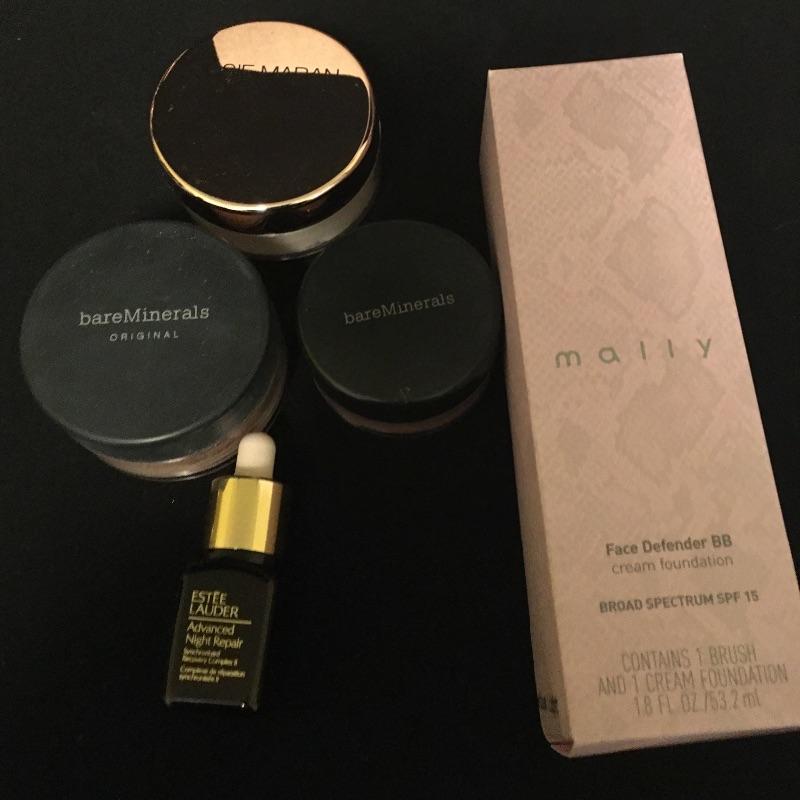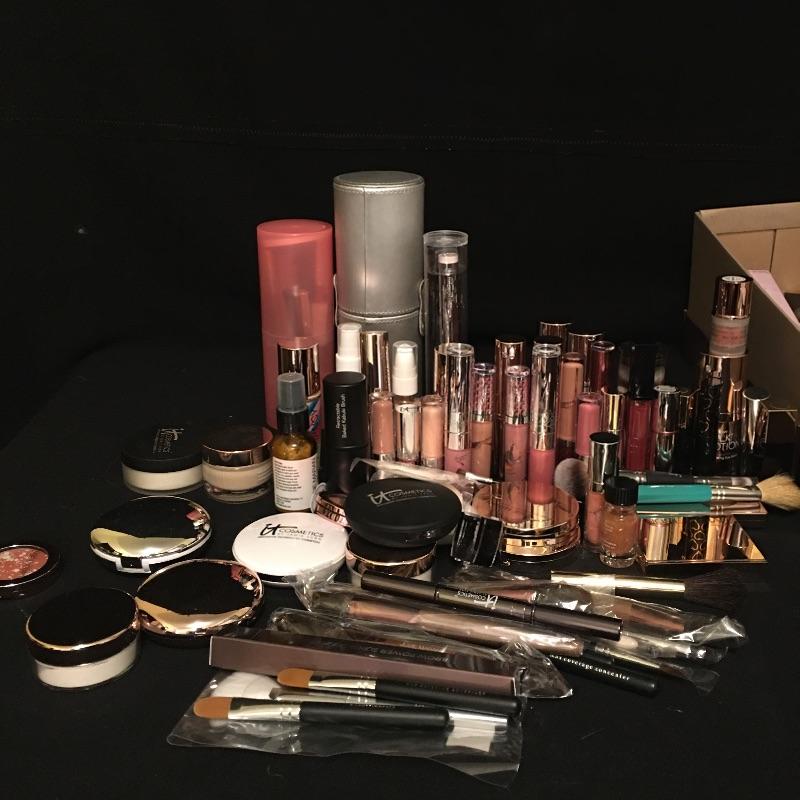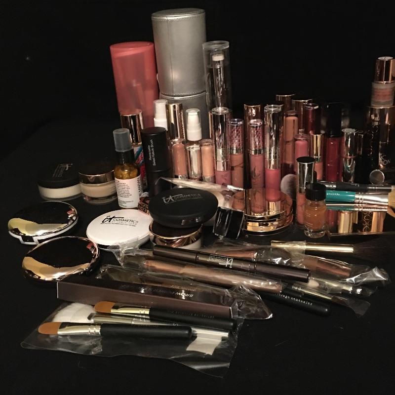 A plethora of makeup includes Bare Mineral, Este Lauder, Mally, Tarte and more in a variety of items including unused brushes, powders, foundations and more.