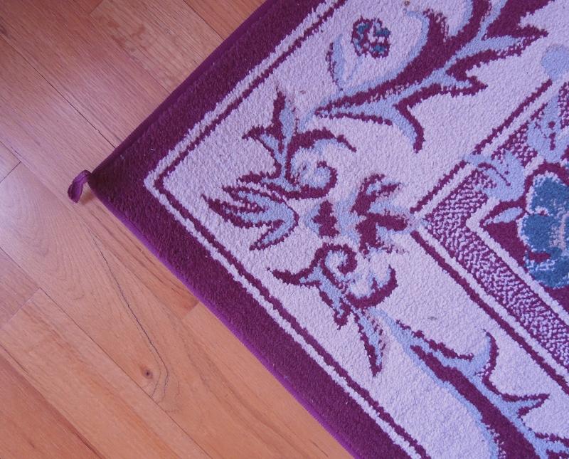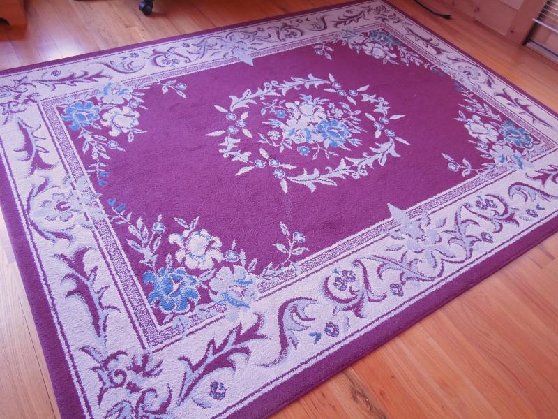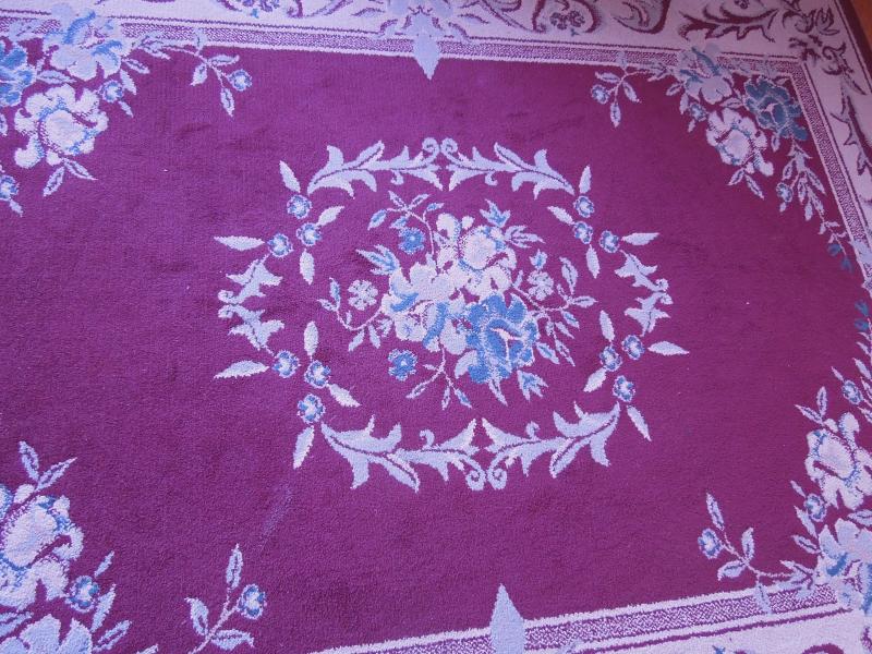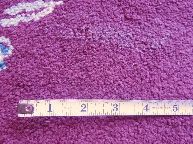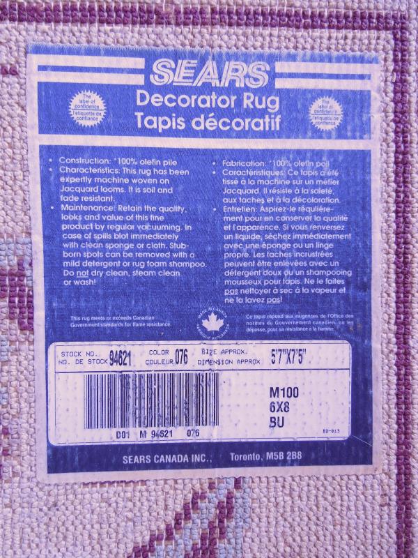 Made of 100% Olefin pile yarn. Manufactured by Sears. Floral wreath center with Fleur de Lis border. color are burgundy, green and off white. 86" x 67". One soiled 4" streak that should wipe clean.