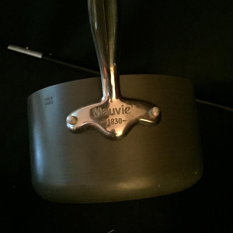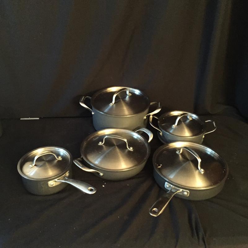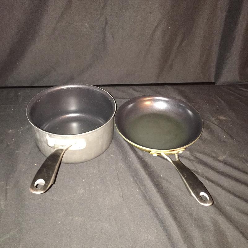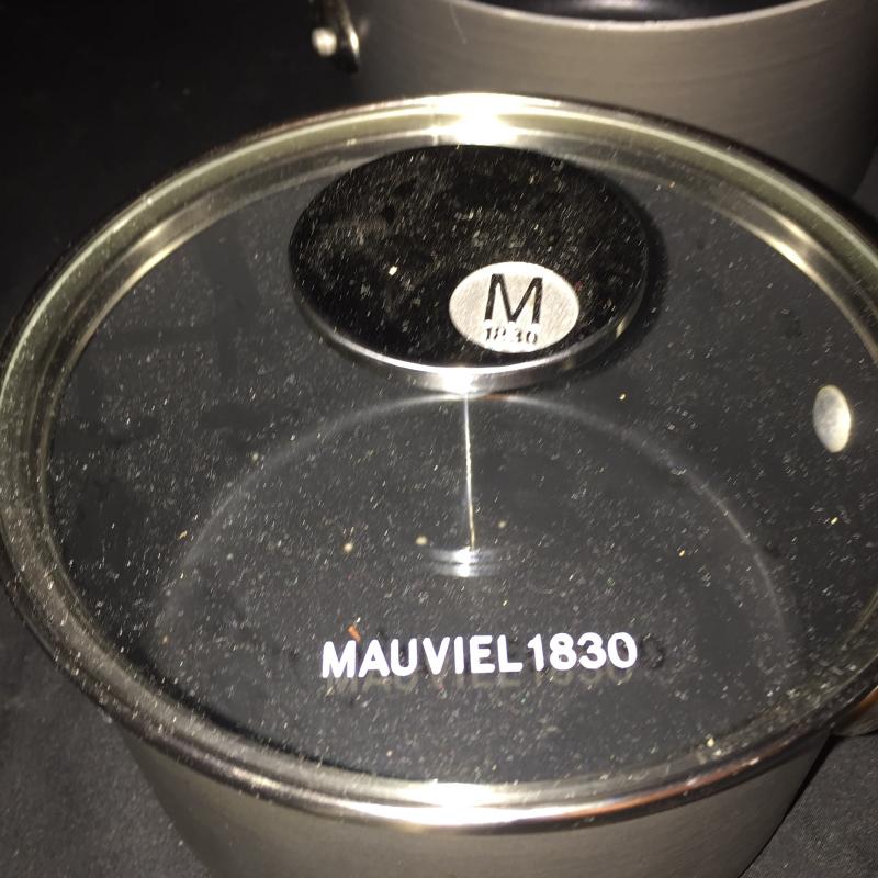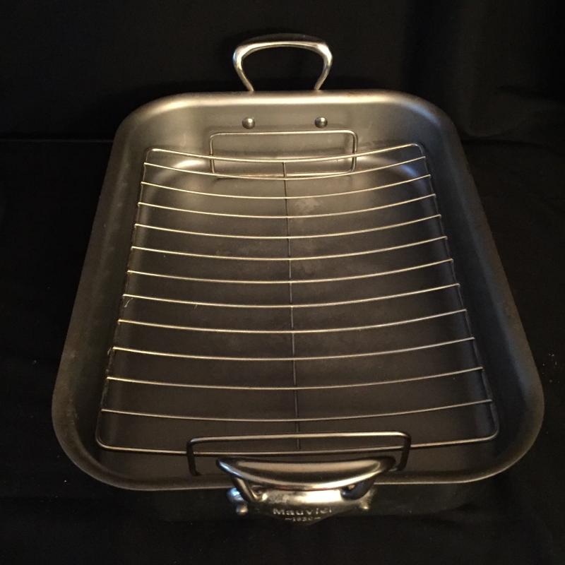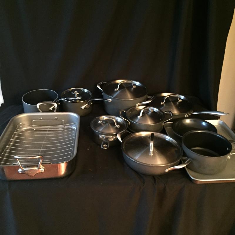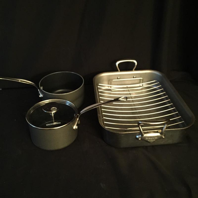 Superb selection of Cuisinart pots and pans twelve pieces and two Mauviel pots with one lid and Mauviel roasting pan wit one Cuisinart baking pan. Channel your inner Rachel Ray with this awesome set of pots and pans. Mauviel roasting pan measures 13” x 17” x 3.25”.