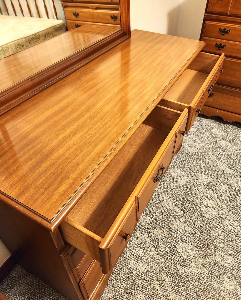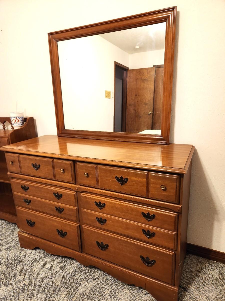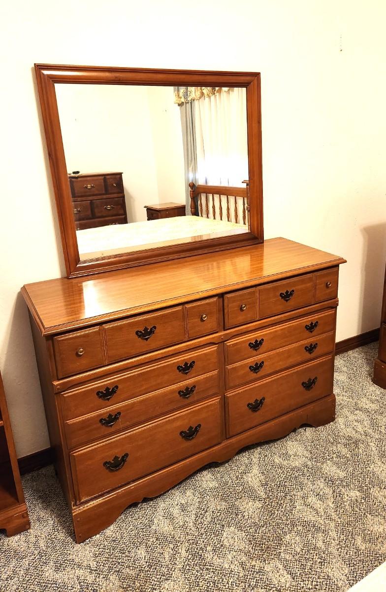 Mid Century Colonial Style Dresser - 6 drawers - mirror comes off for easy moving. 47.5" across, 17.5" deep, 32" tall (not counting mirror). Mirror by itself is 35.5" across, 29.5" tall. No maker noted. A bit of fading to the finish at bottom left, otherwise good.