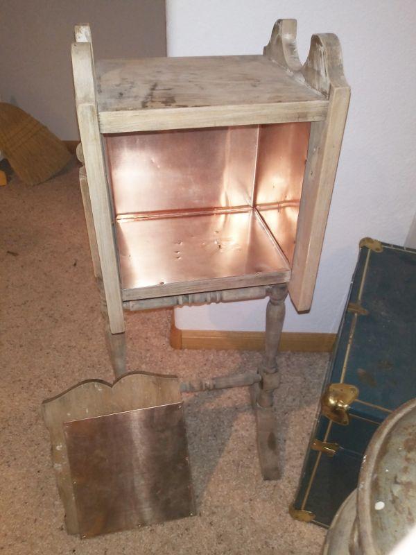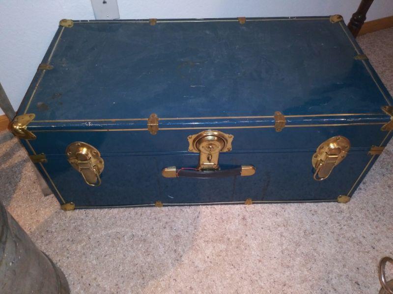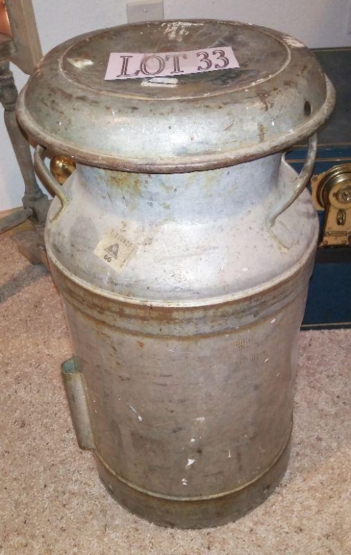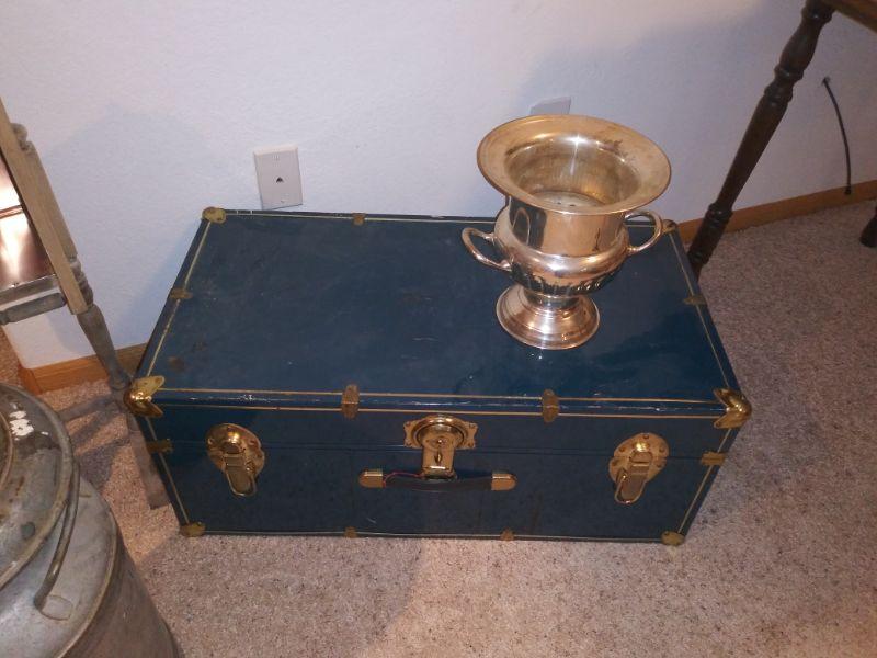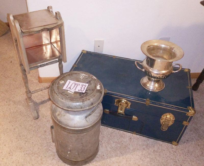 MILK CAN THAT IS HEAVIER THAN USUAL, STORAGE TRUNK, IS LOCKED, IT DOESN'T FEEL OR SOUND LIKE ANYTHING IS IN IT BUT WE DIDN'T WANT TO PRY THE LOCK OPEN. HUMIDOR NEEDS TO BE REFINISHED AND THE DOOR REATTACHED