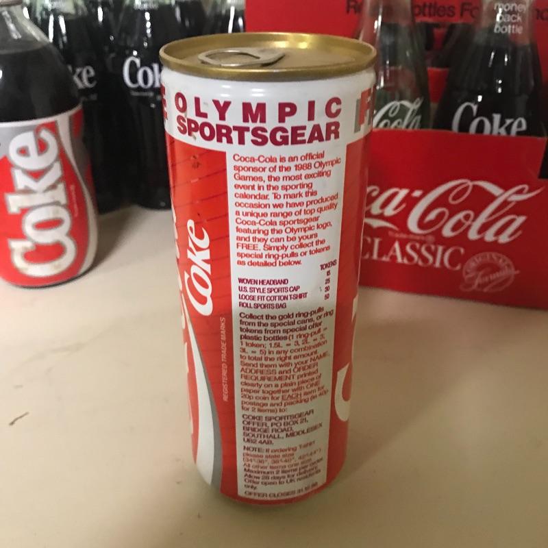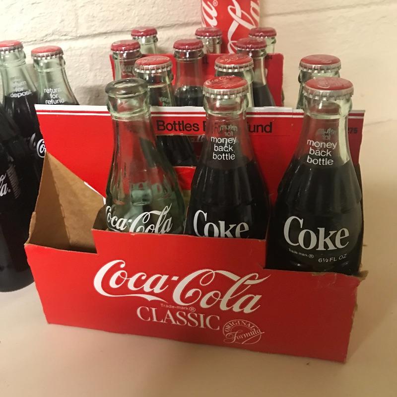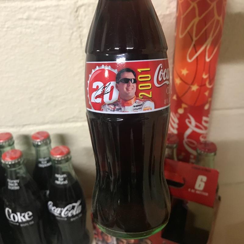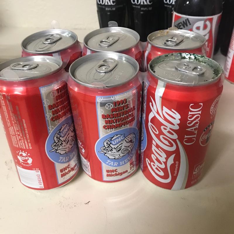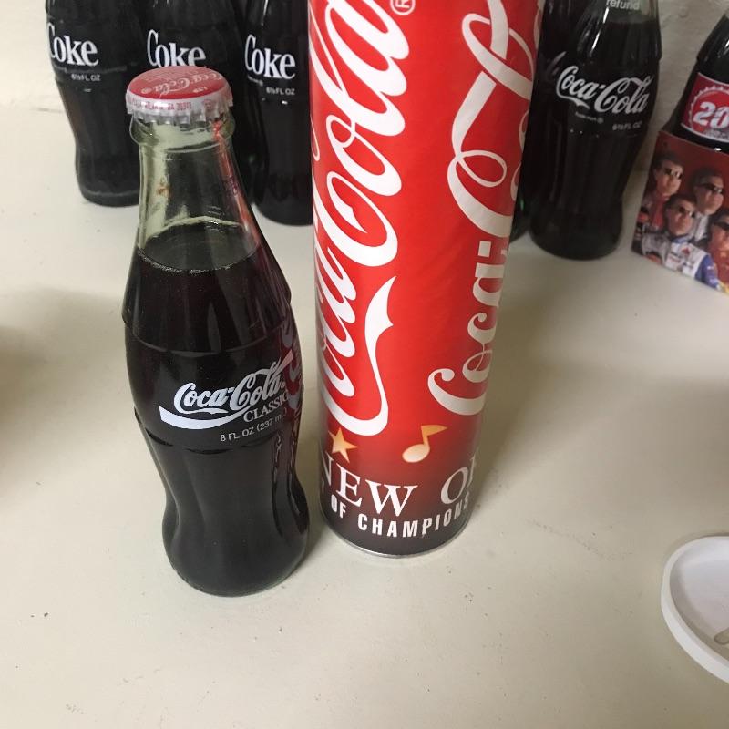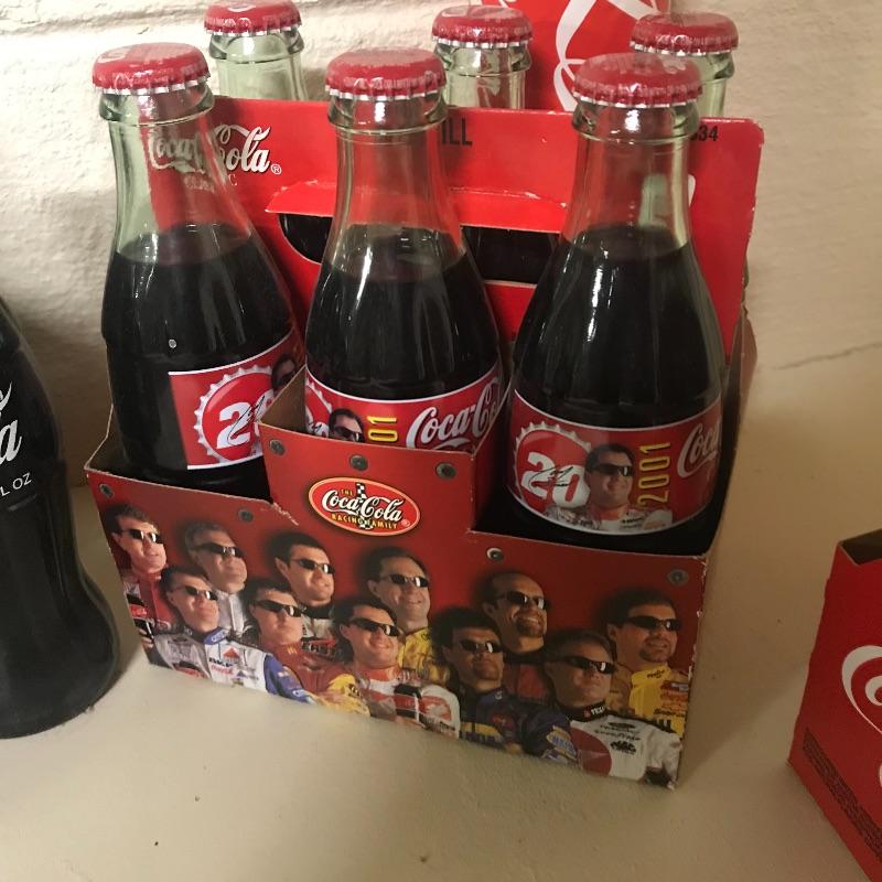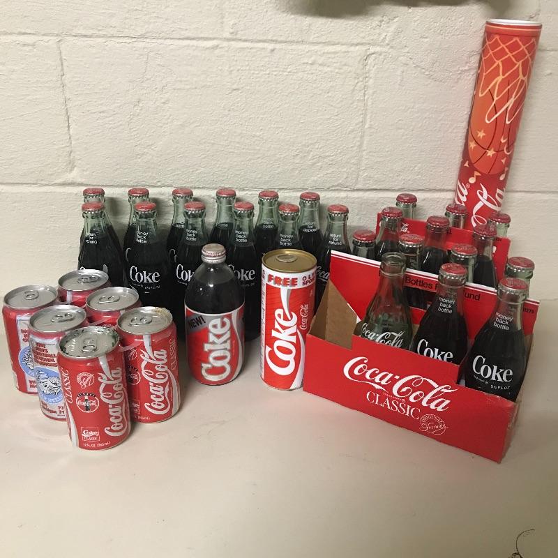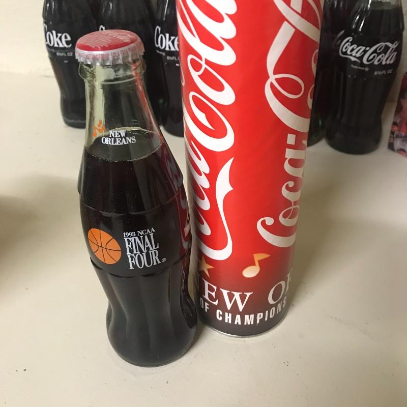Twelve refund 6.5oz coke bottles, six pack Coca-Cola Tar Heels cans, bottle of New Coke, tall boy Coke can with Olympic gear offer from 1988, six pack of 2001 #20 NASCAR Driver coke bottles, incomplete eight pack of 8.5oz coke bottles and New Orleans 1993 Final Four cardboard bank with coke bottle. See pix for details. Local pick up only.
