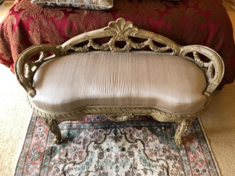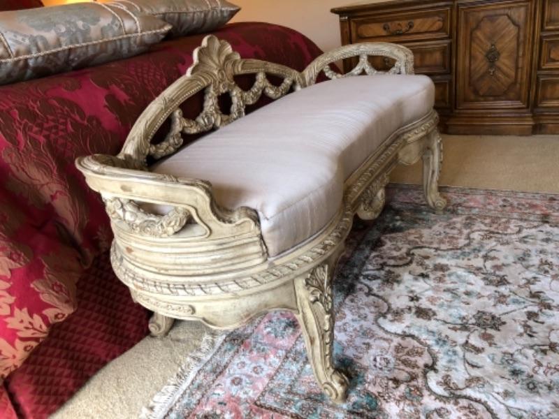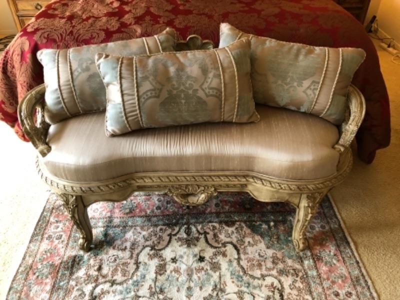 Lot 33. Ornate French provincial bedside bench with 3 pillows (58”L x 23D x 31”H)--WAS $195““NOW $146.25