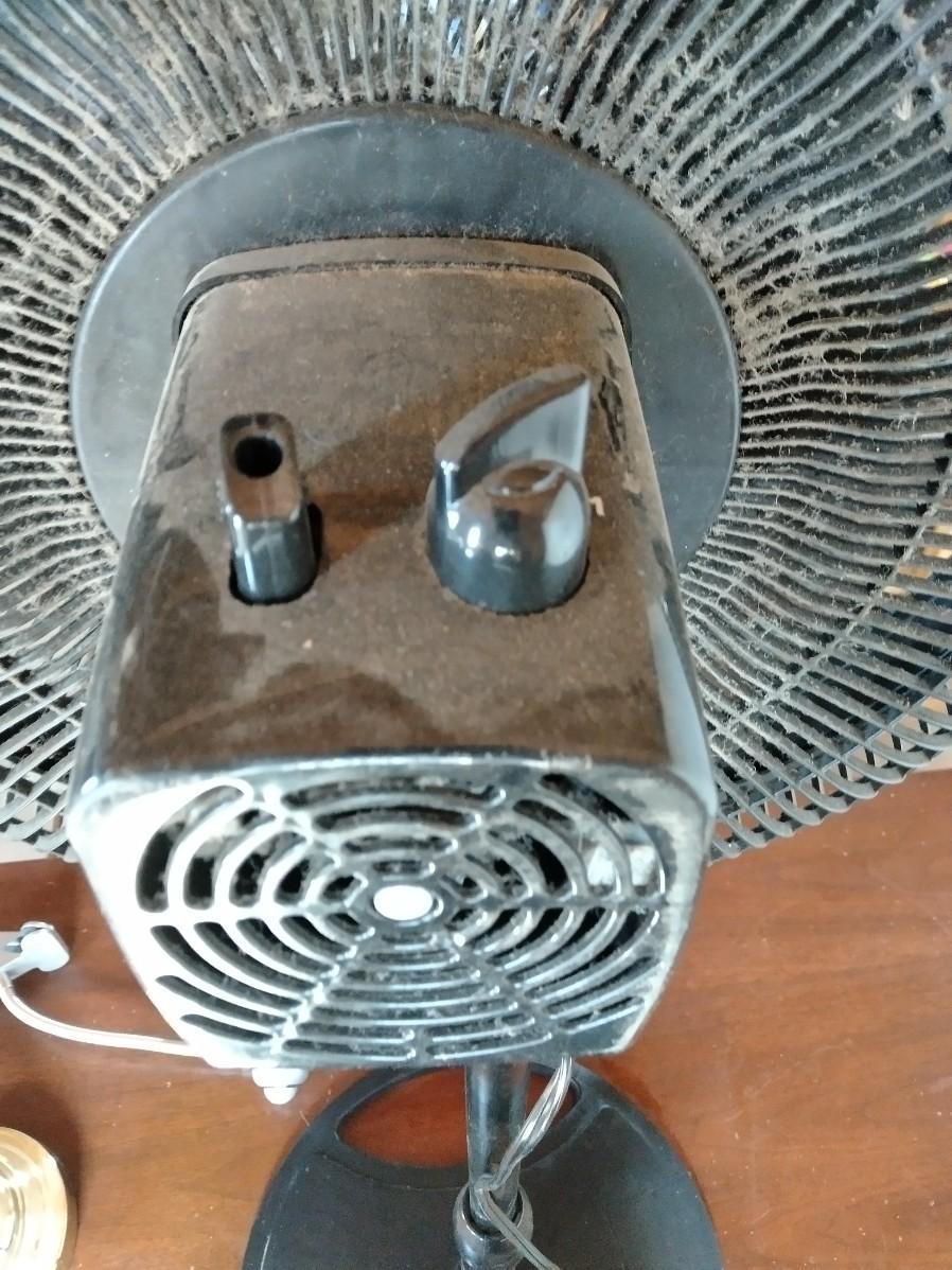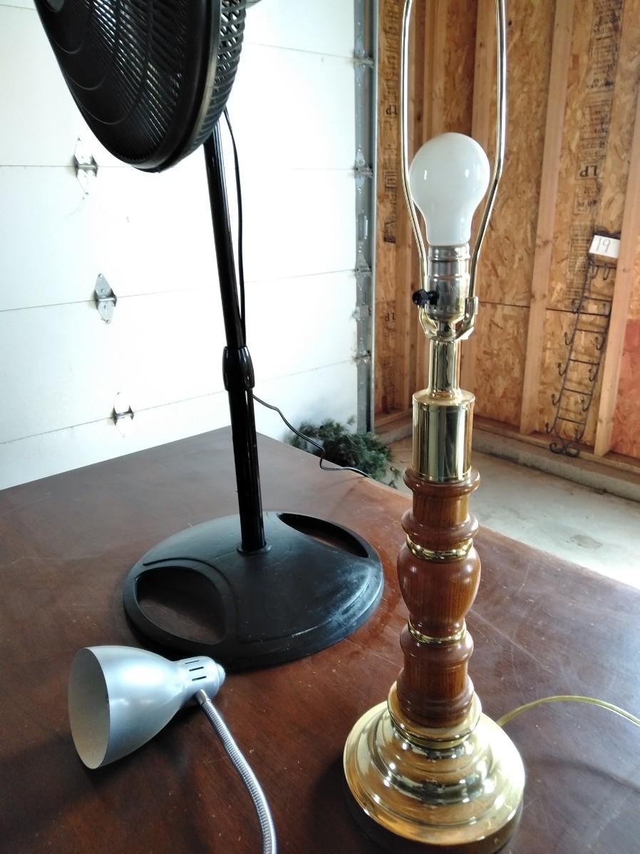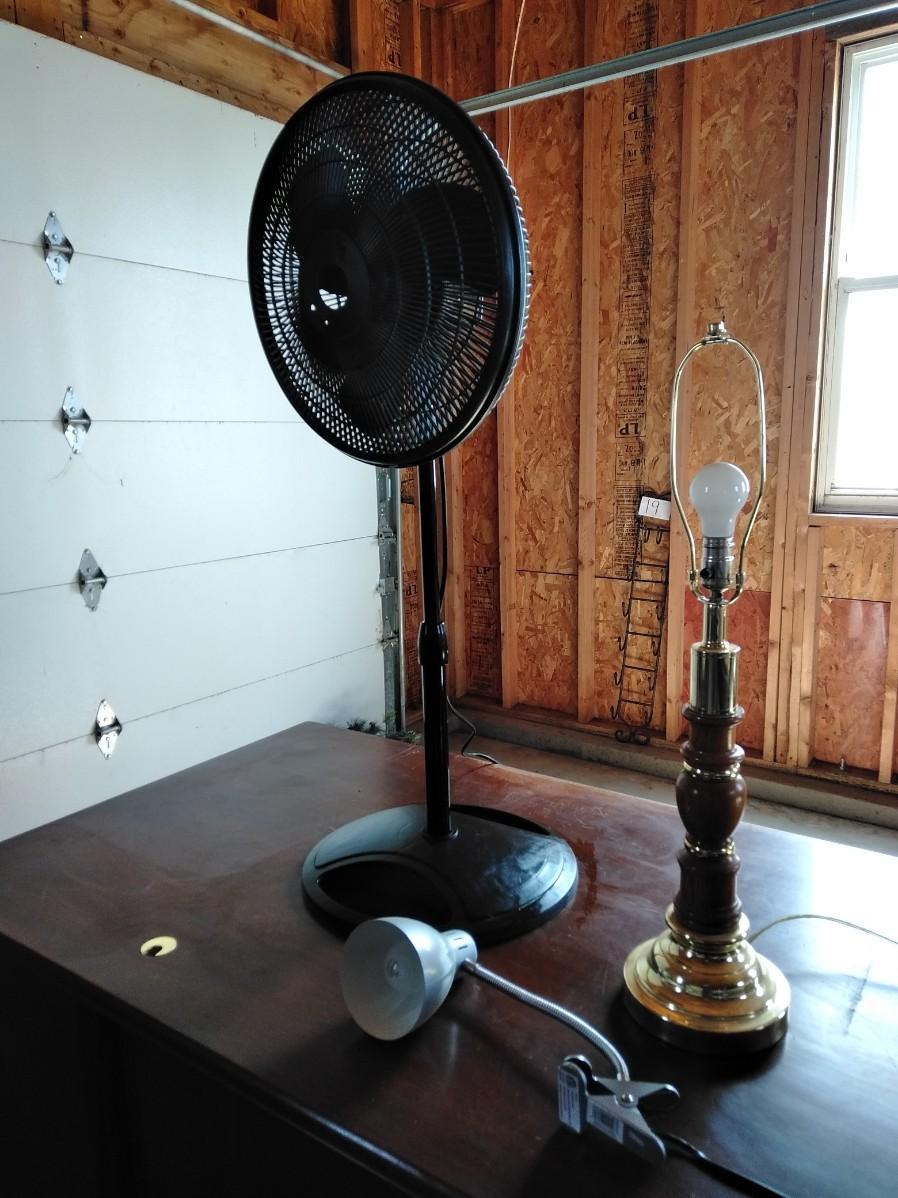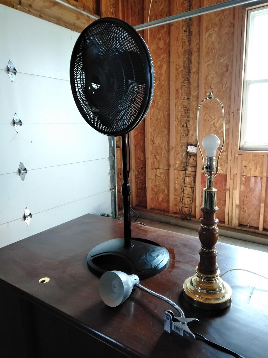 BLACK OSCILLATING FAN (missing center emblem), CLIP ON DESK LAMP, AND FREE-STANDING WOOD LAMP (no shade)