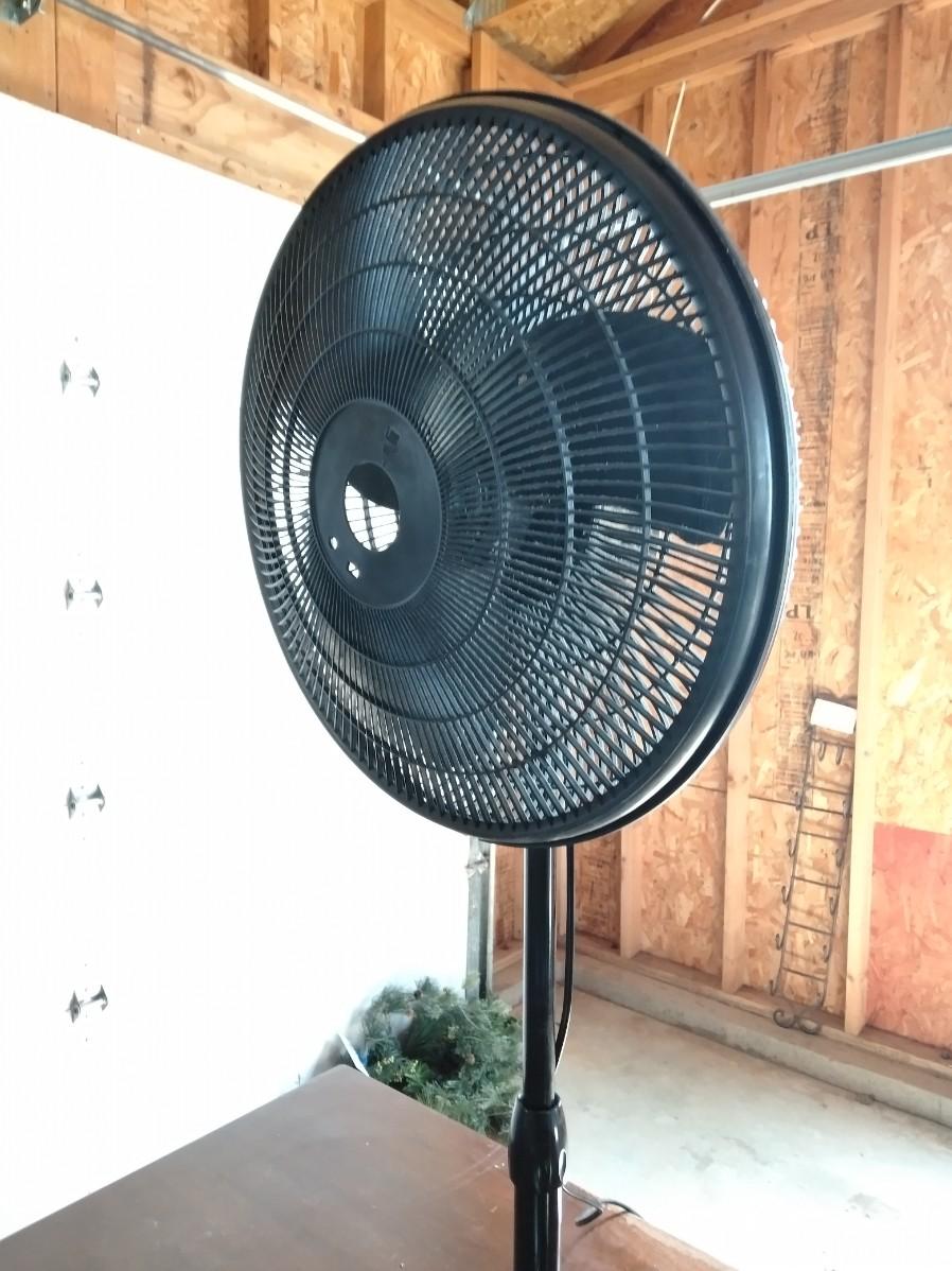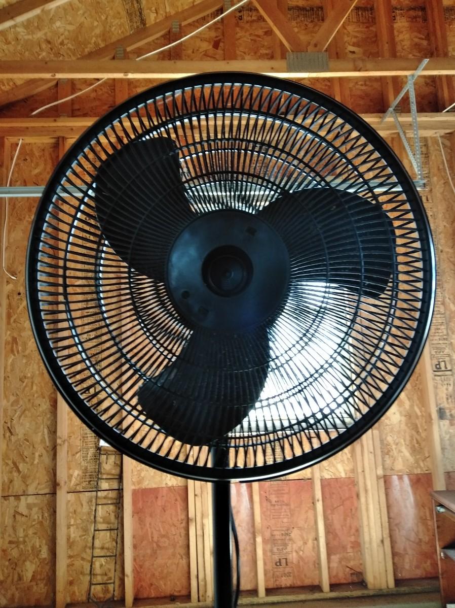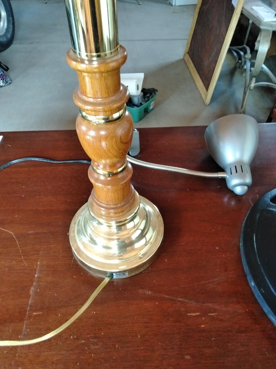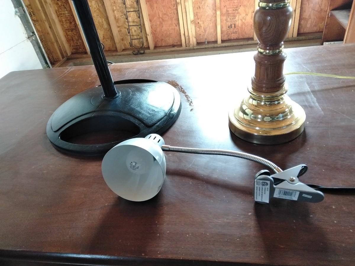 BLACK OSCILLATING FAN (missing center emblem), CLIP ON DESK LAMP, AND FREE-STANDING WOOD LAMP (no shade)