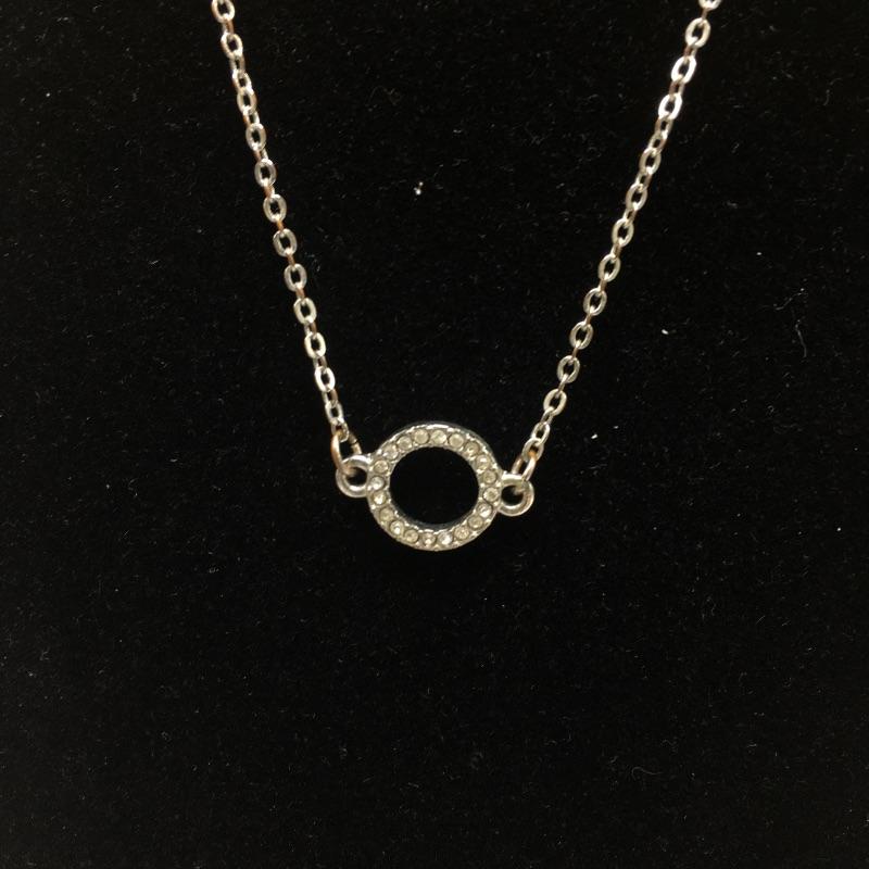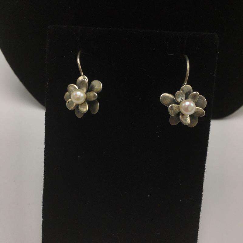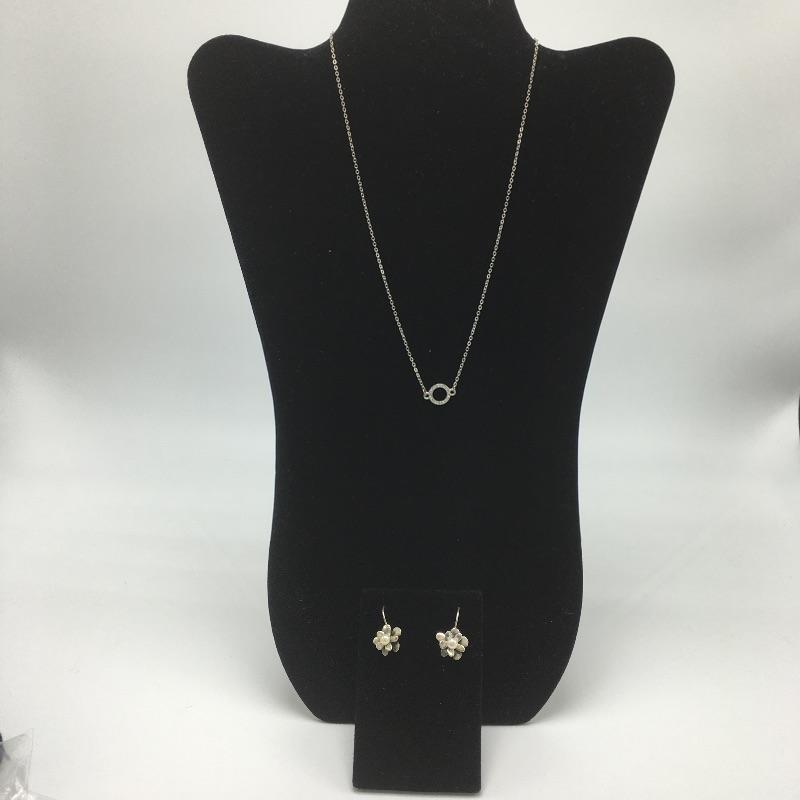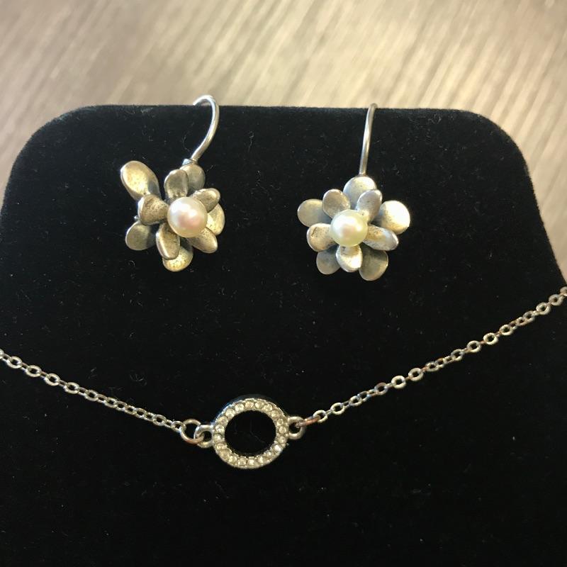 Pair of French wire silver earrings marked 925 with a pearl center and a silver colored necklace with a small circular crystal encrusted centerpiece.