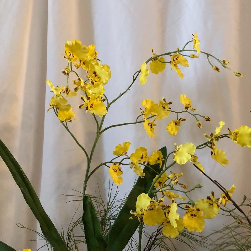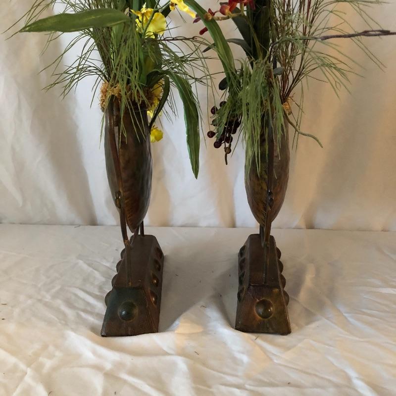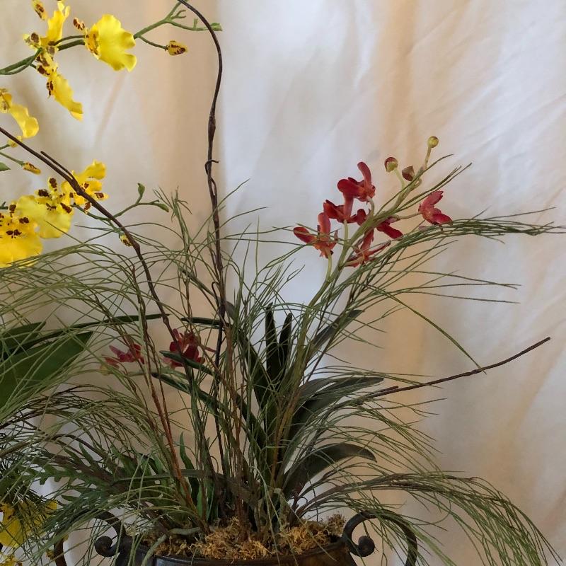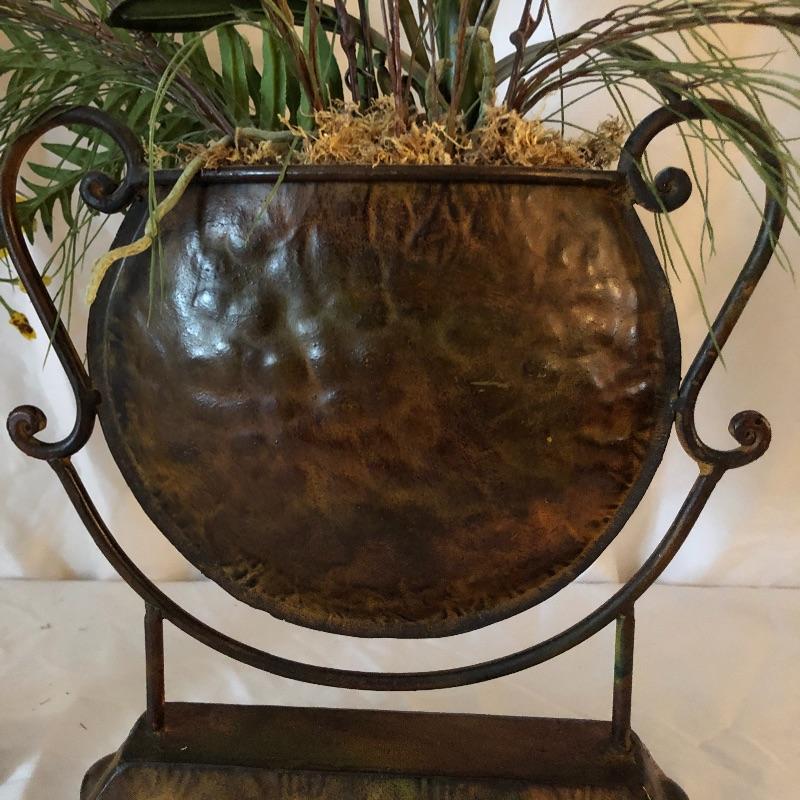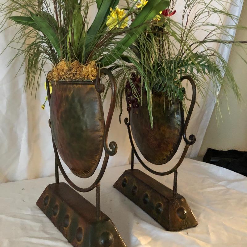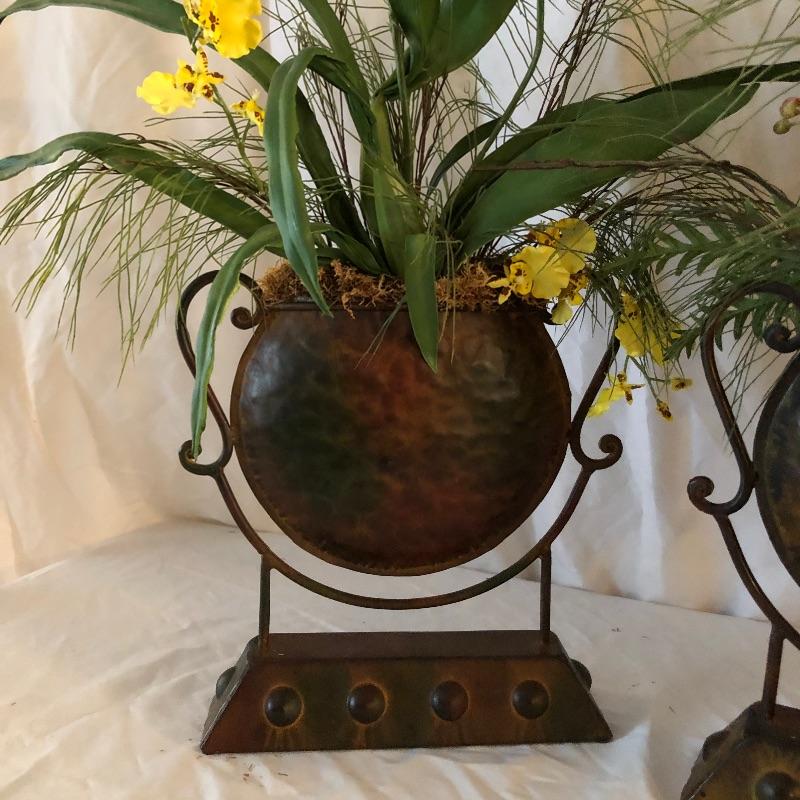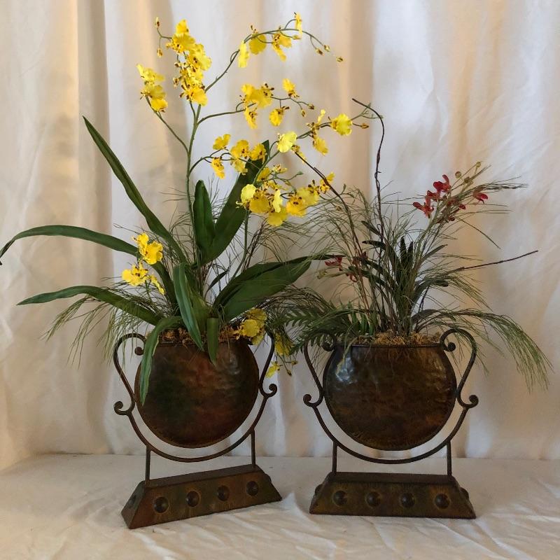 This eye catching pair of faux orchids come in matching narrow tin containers that are an aged copper color. They are deceivingly lifelike and will add year round elegant color to your space.