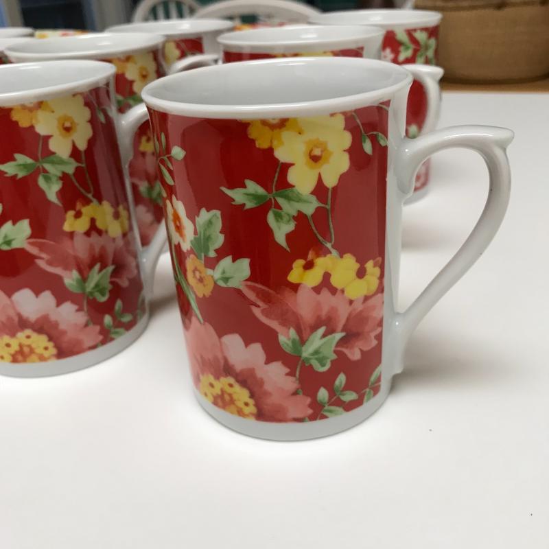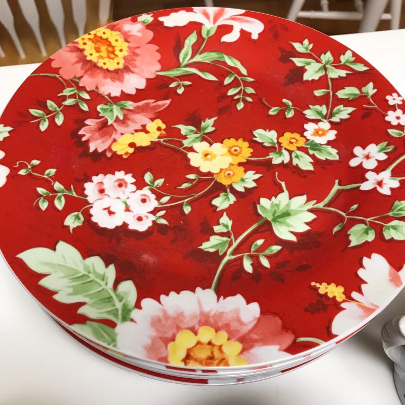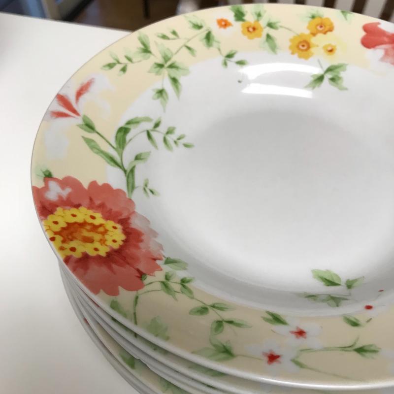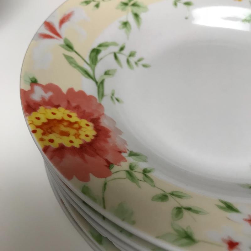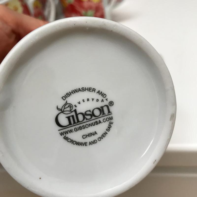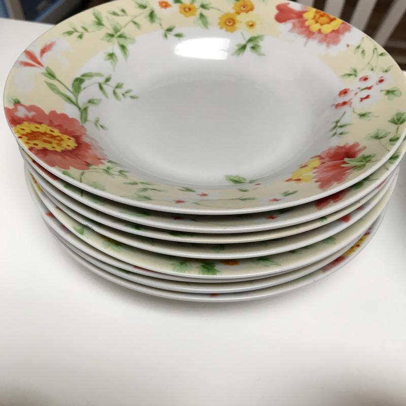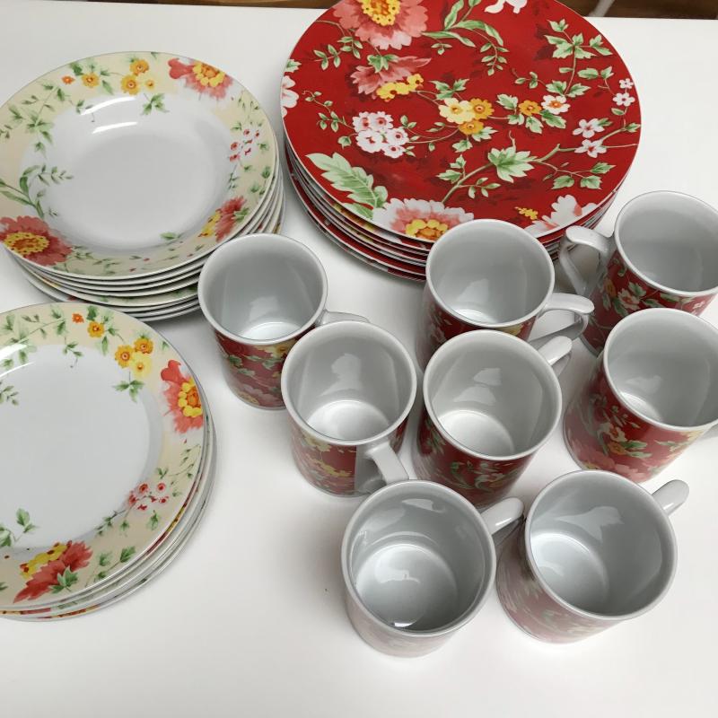 This sweet floral china dish set by Gibson includes 7 dinner plates, 7 salad plates, 8 bowls, and 8 mugs. See photos for details.