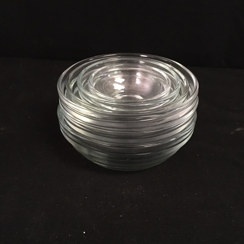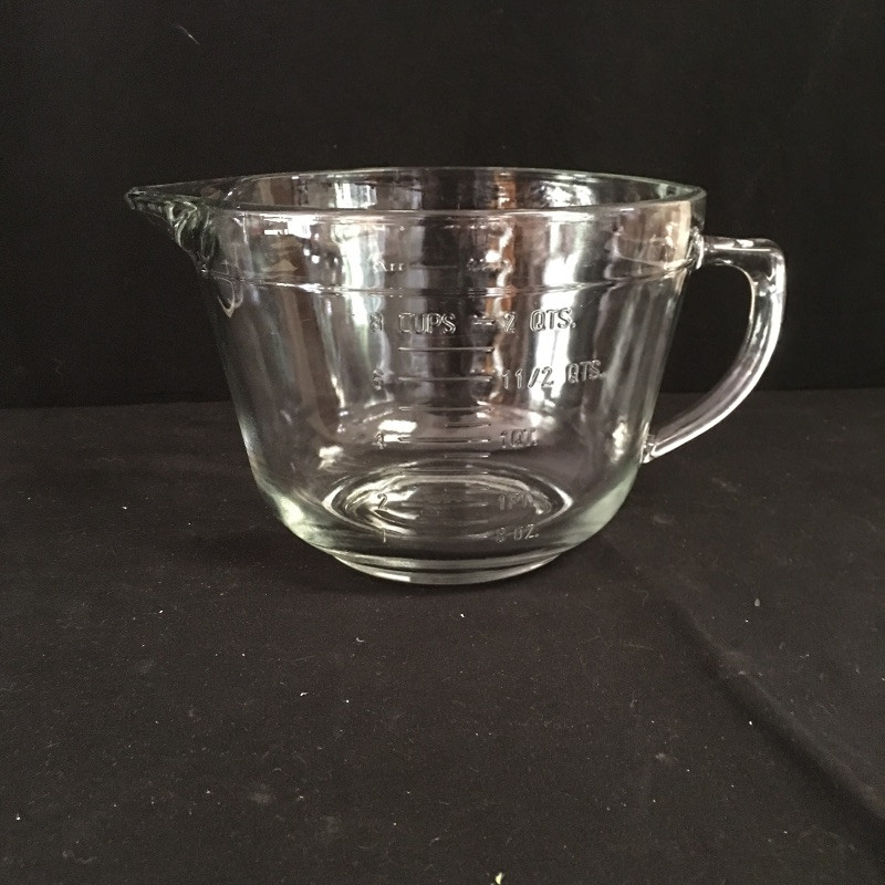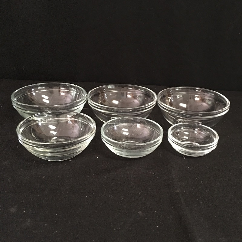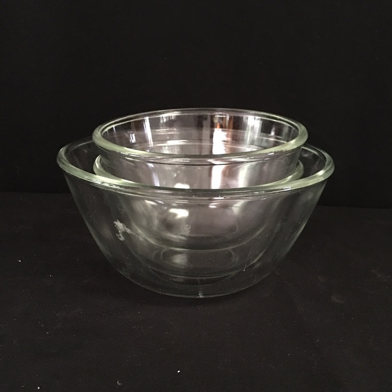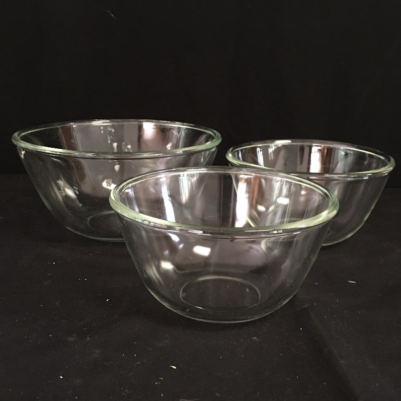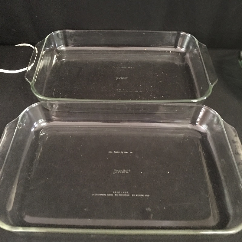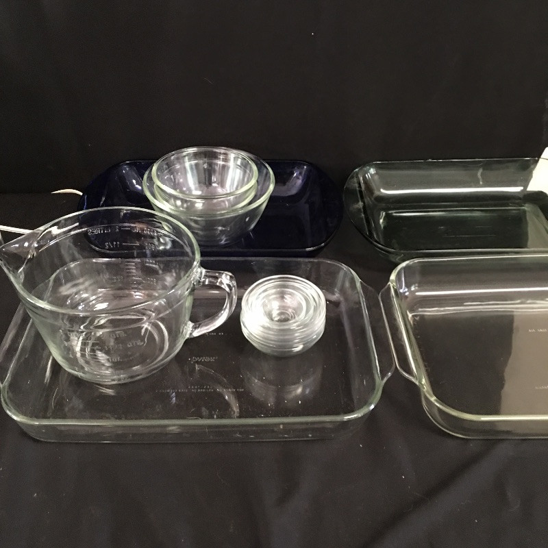 Pyrex and Anchor Ware includes two Pyrex casserole dishes, two Anchor casserole dishes, small and medium sized nesting bowls and a large measuring cup.
