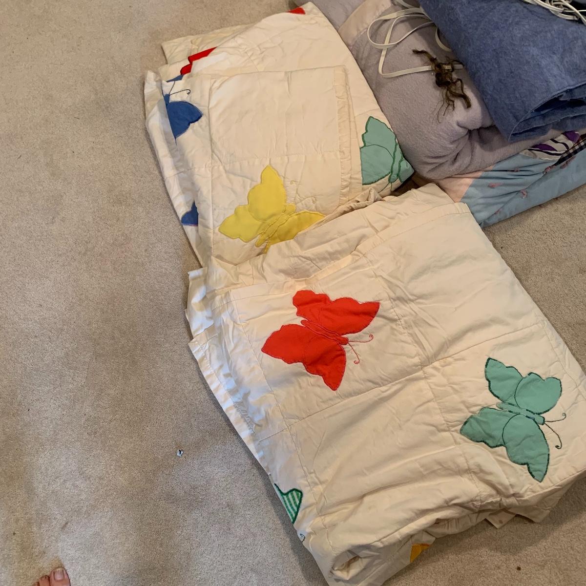 This lot covers your bedding needs! Included are two electric blankets, a cute quilted pillow, assorted linens, four quilts, two of which are decorated with adorable butterflies. See pics for lot content and condition.