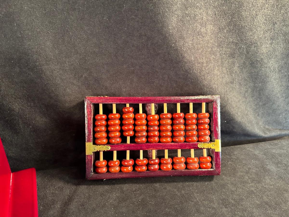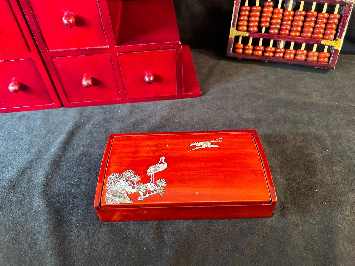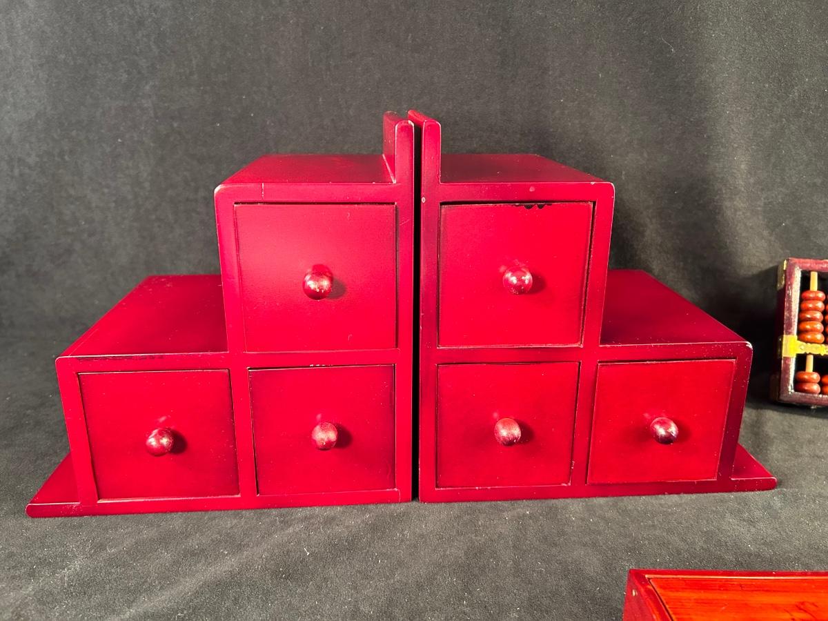 Includes pair of drawer bookends, inlaid wooden box with Asian motif and a wood abacus