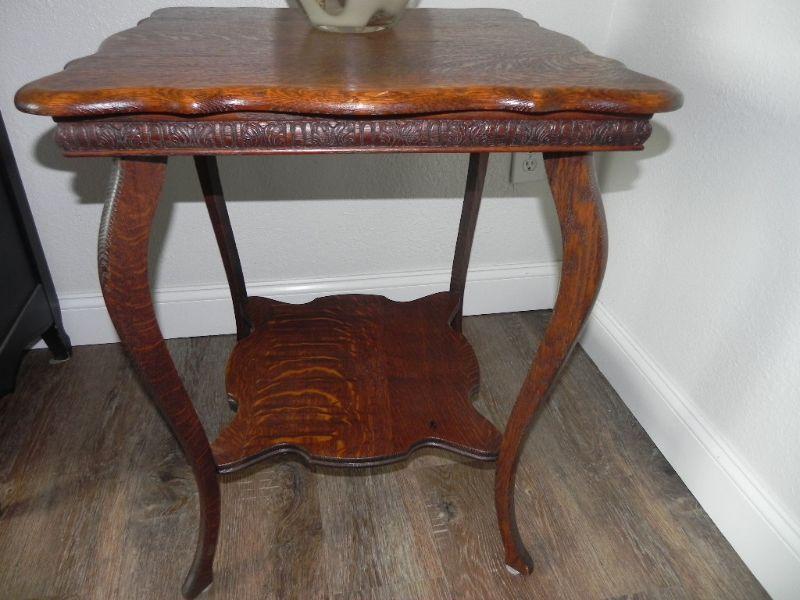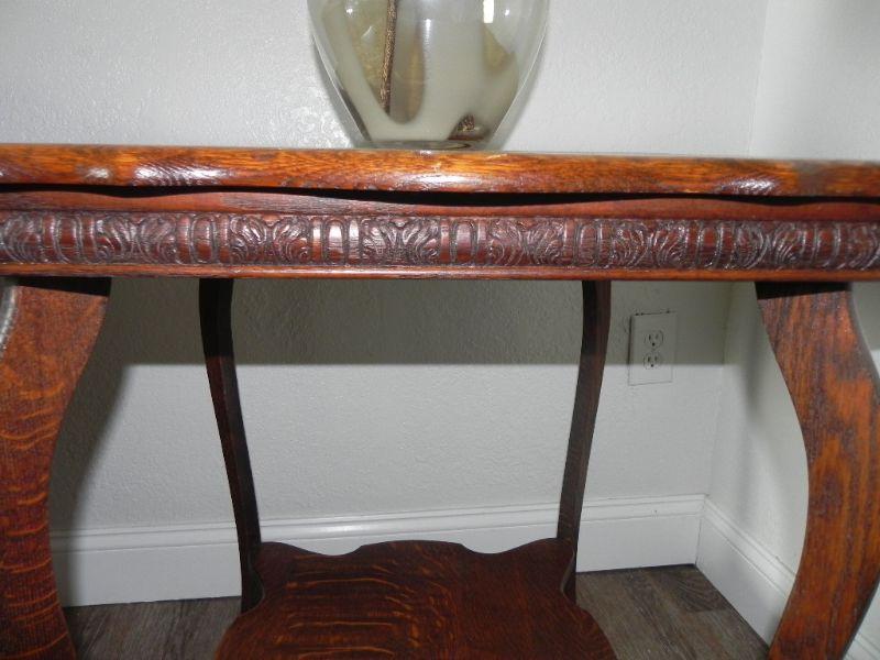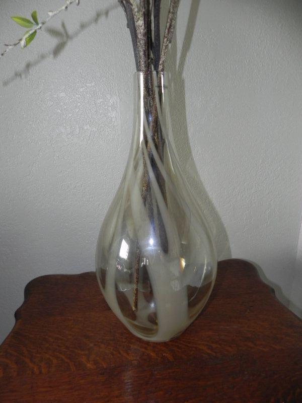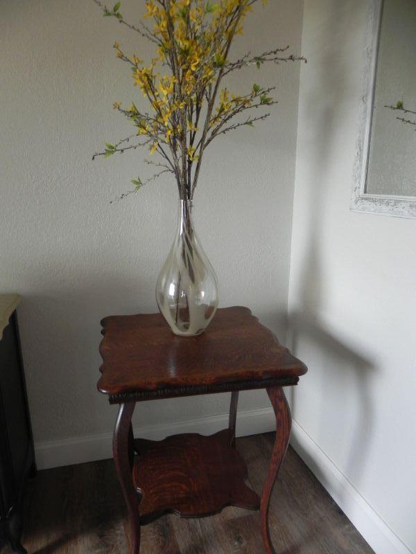 CARVED WOODEN TABLE MEASURES 23"X23"X29", VASE IS 19" TALL WITH ETCHED SWIRLS