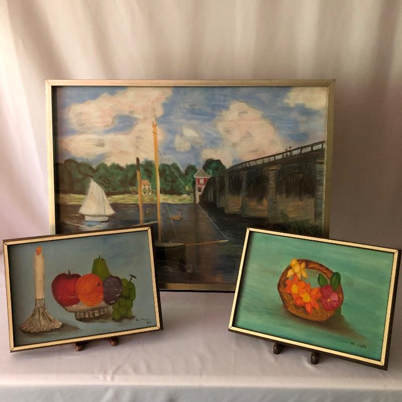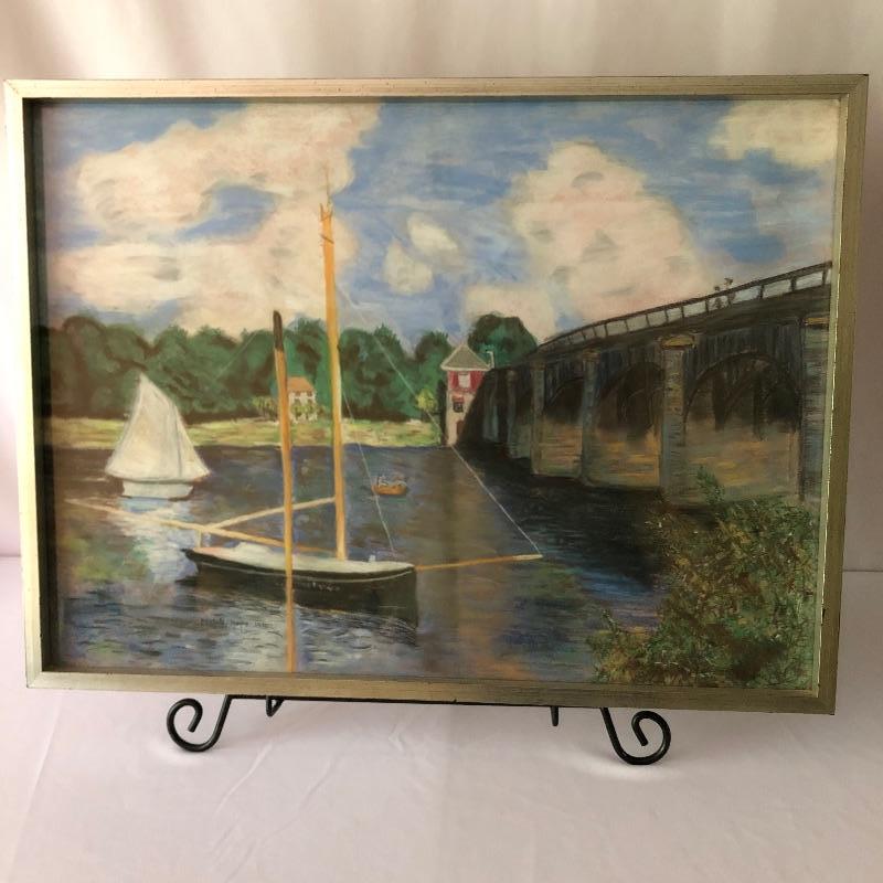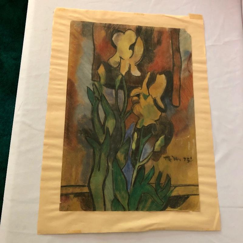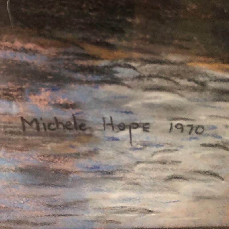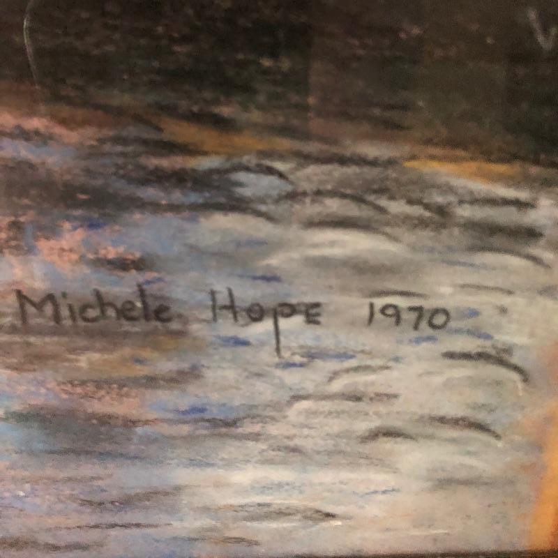 An eclectic mix of pastel artwork here with these four pieces by Michele Hope. The largest which measures 23” x 30” is a bucolic harbor scene with sail boats and is mounted in an attractive metallic frame. The two smaller pieces are in matching frames that measure 11” x 15”. Last but certainly not least is a beautiful unframed piece depicting graceful Bearded Irises also in pastels.