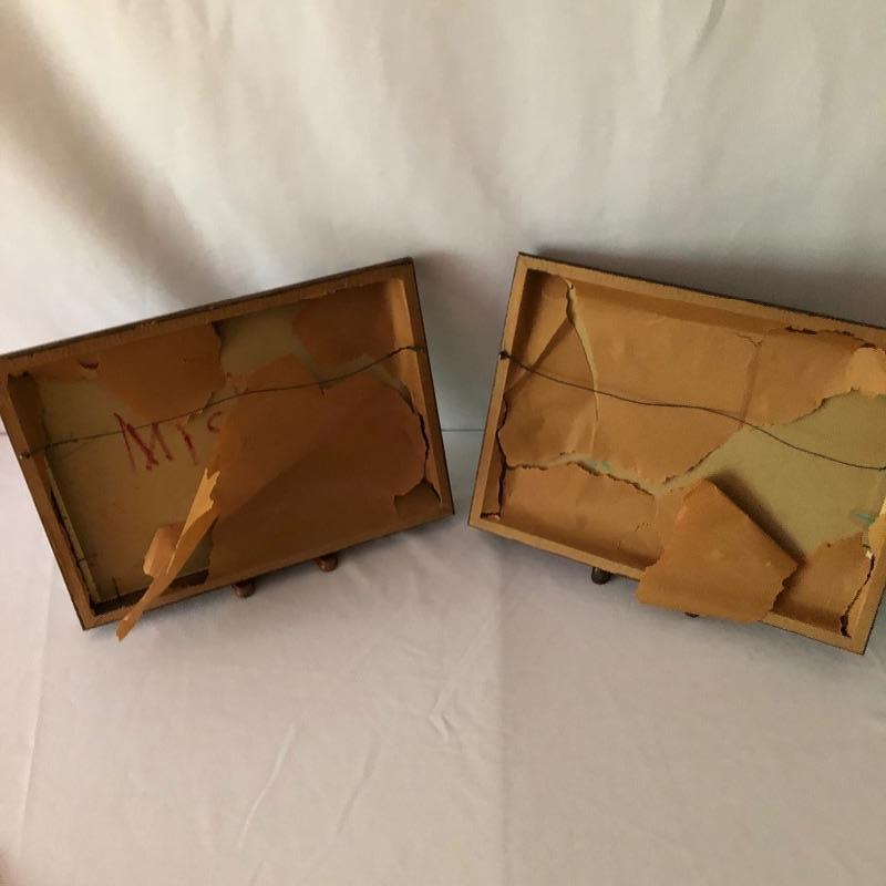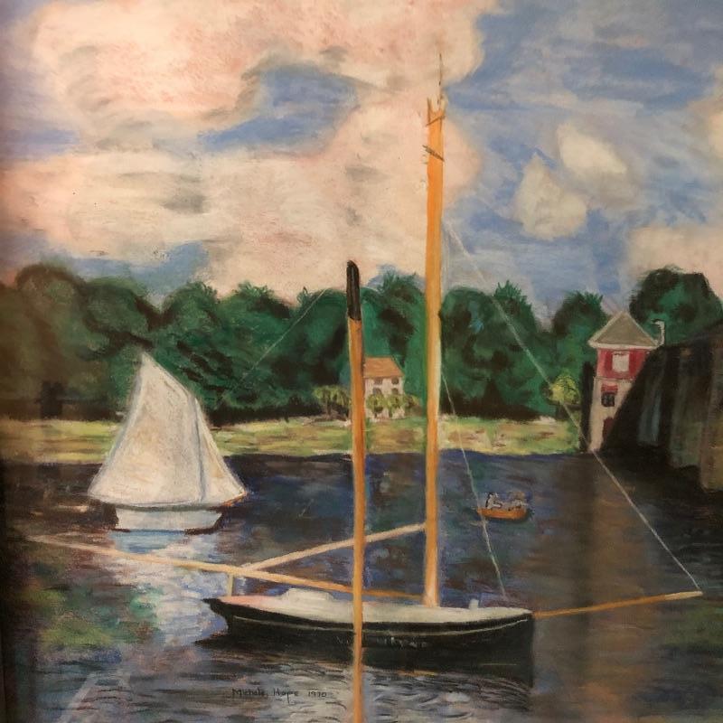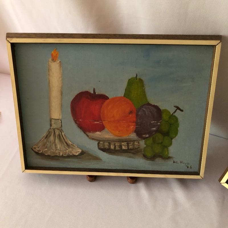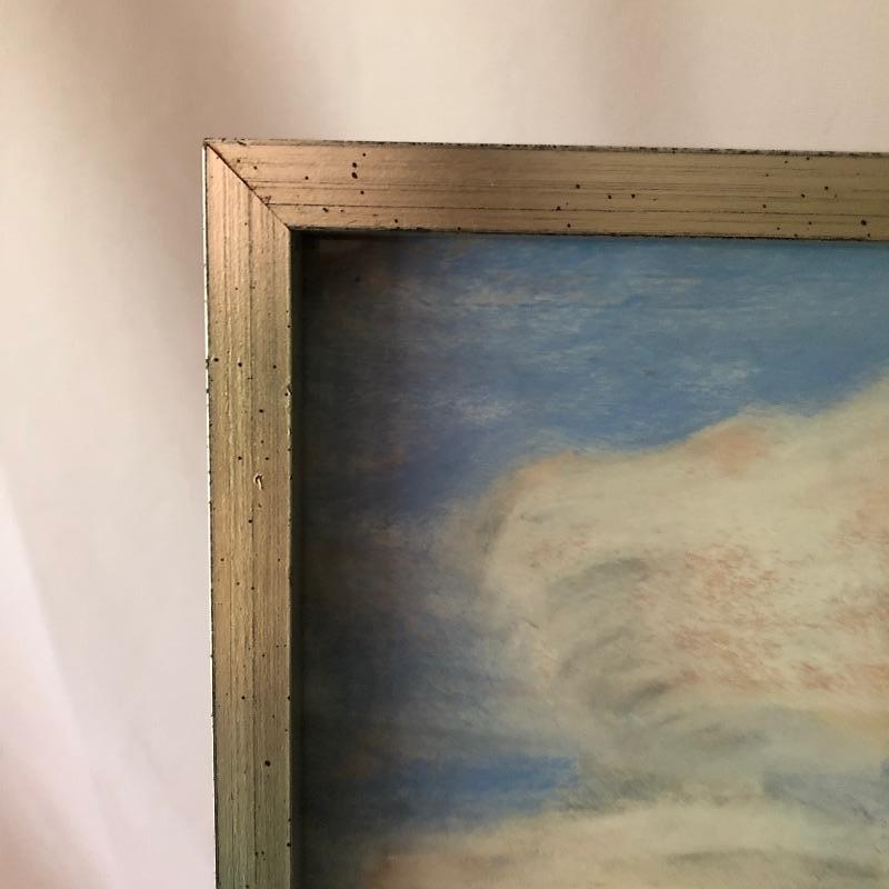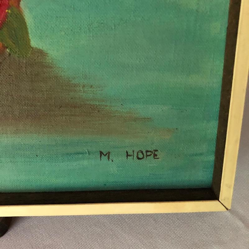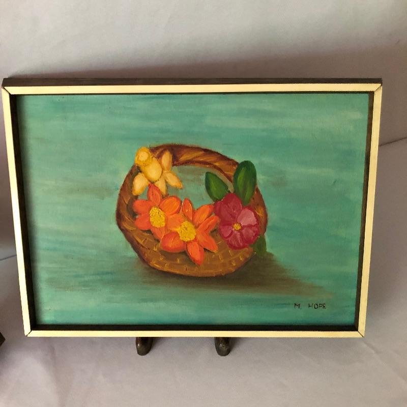 An eclectic mix of pastel artwork here with these four pieces by Michele Hope. The largest which measures 23” x 30” is a bucolic harbor scene with sail boats and is mounted in an attractive metallic frame. The two smaller pieces are in matching frames that measure 11” x 15”. Last but certainly not least is a beautiful unframed piece depicting graceful Bearded Irises also in pastels.