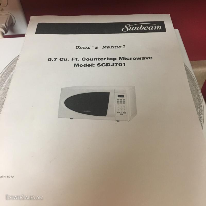 7 cu. ft. countertop microwave by Sunbeam. Model #SGDJ701, 700 watts. This lot is available for local pick up in Asheville, NC only.