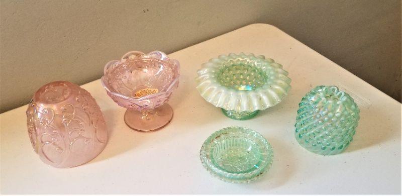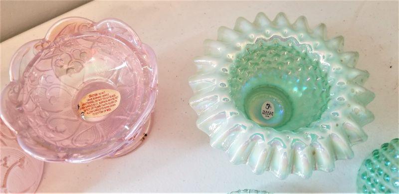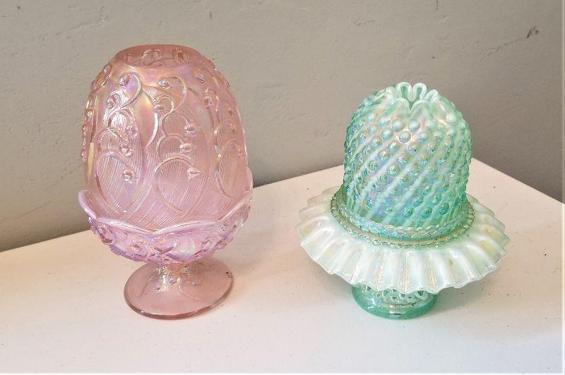 Both of these fairy lights were made by the Fenton Glass Company - they have the labels - good condition. Pink is 7" tall and Green is 6" tall. The Fenton factory closed several years ago.