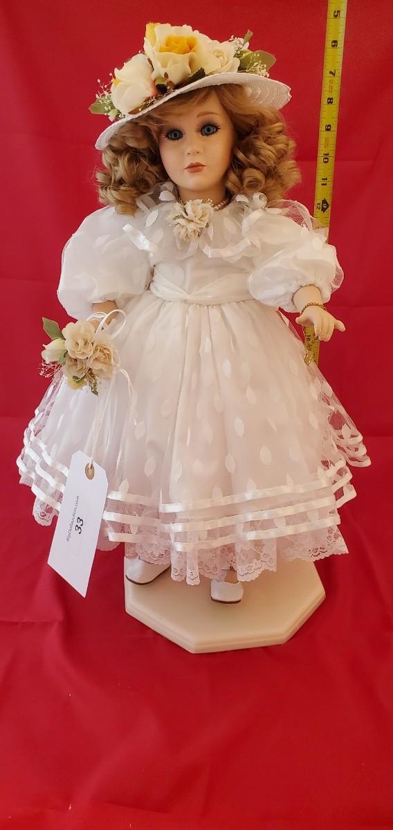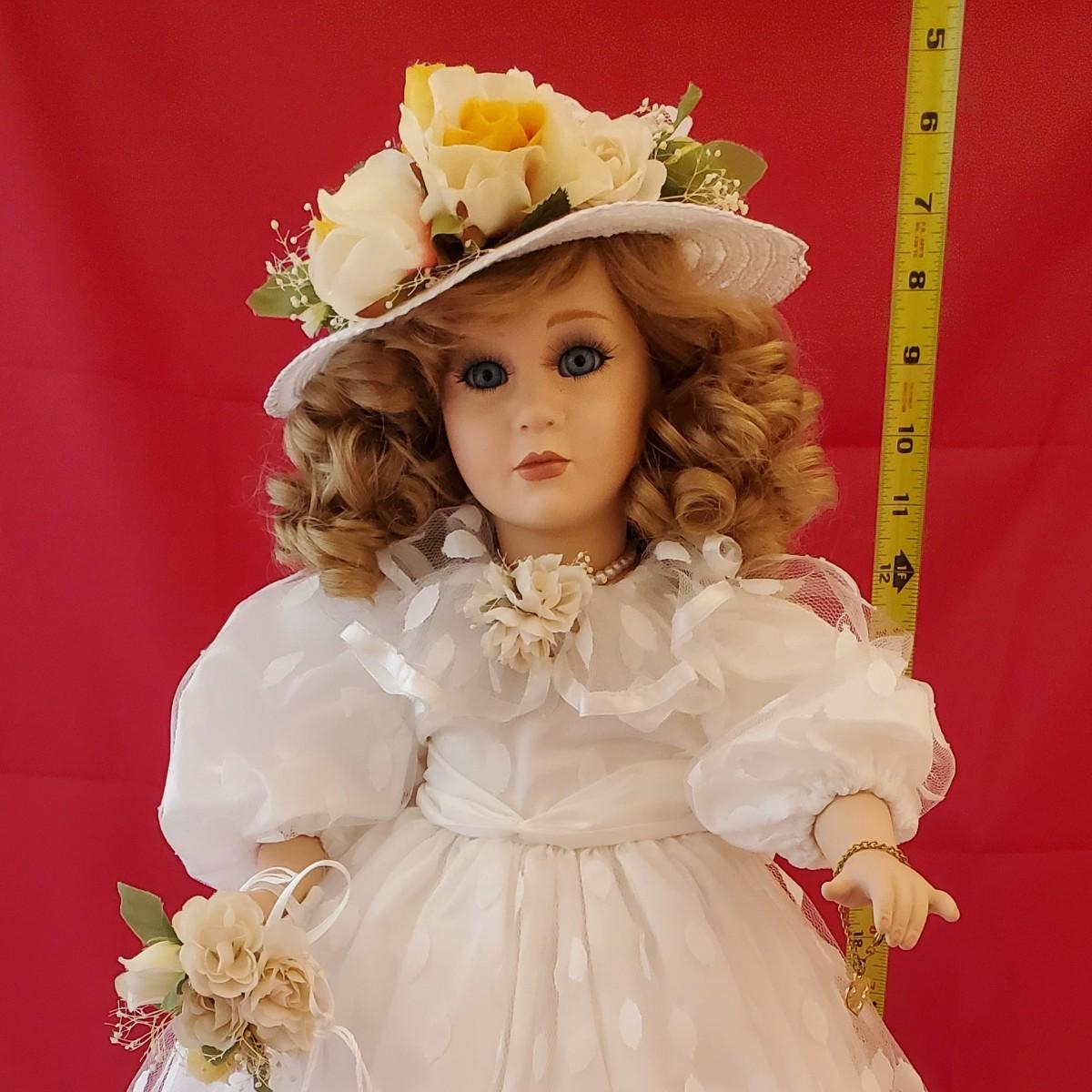 Doll Named "Tatiana" By Jan Garnett with White Bonnet and White Dress With Flower Basket