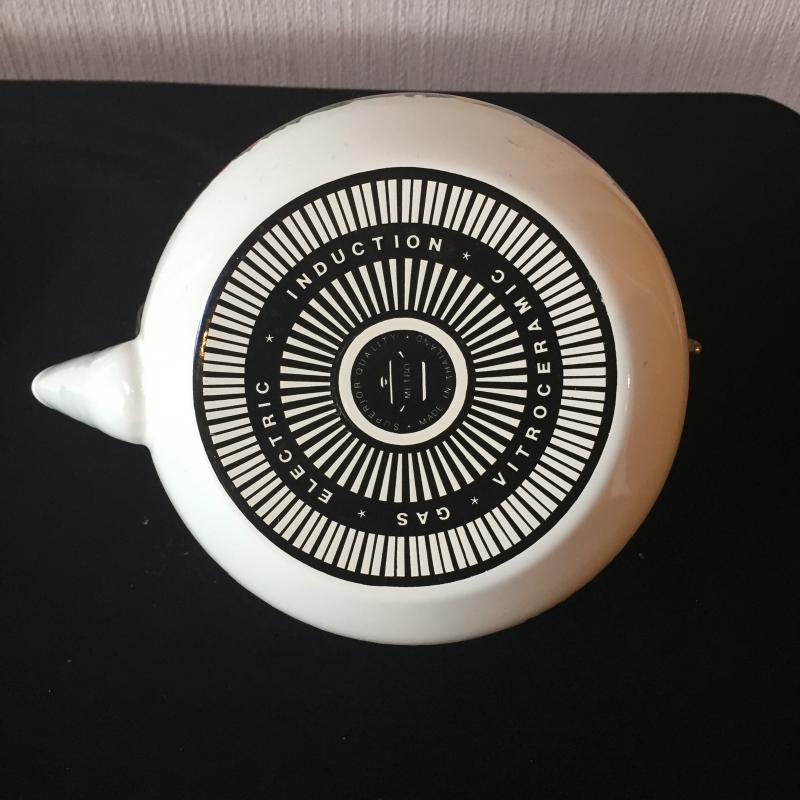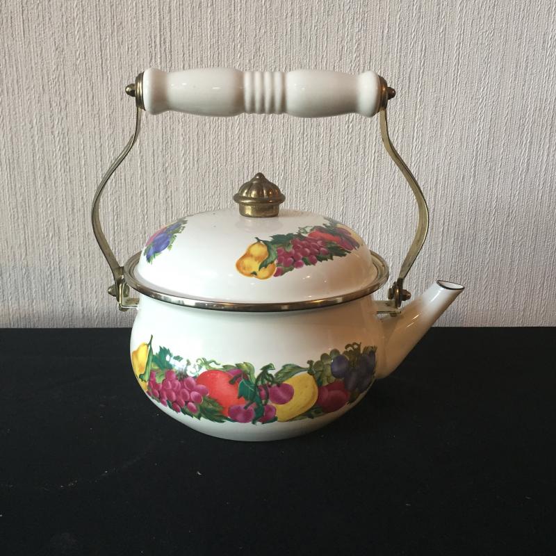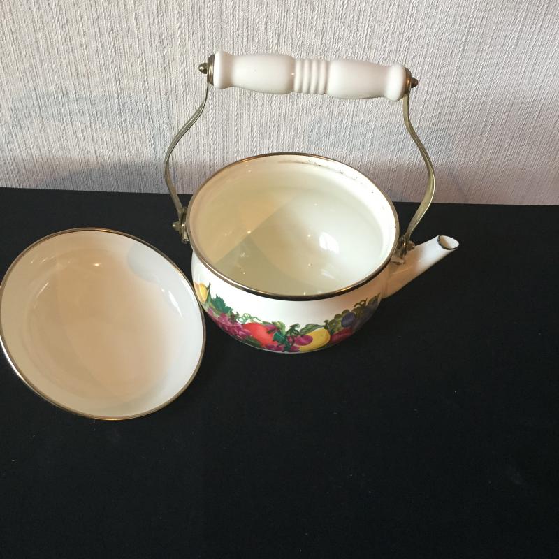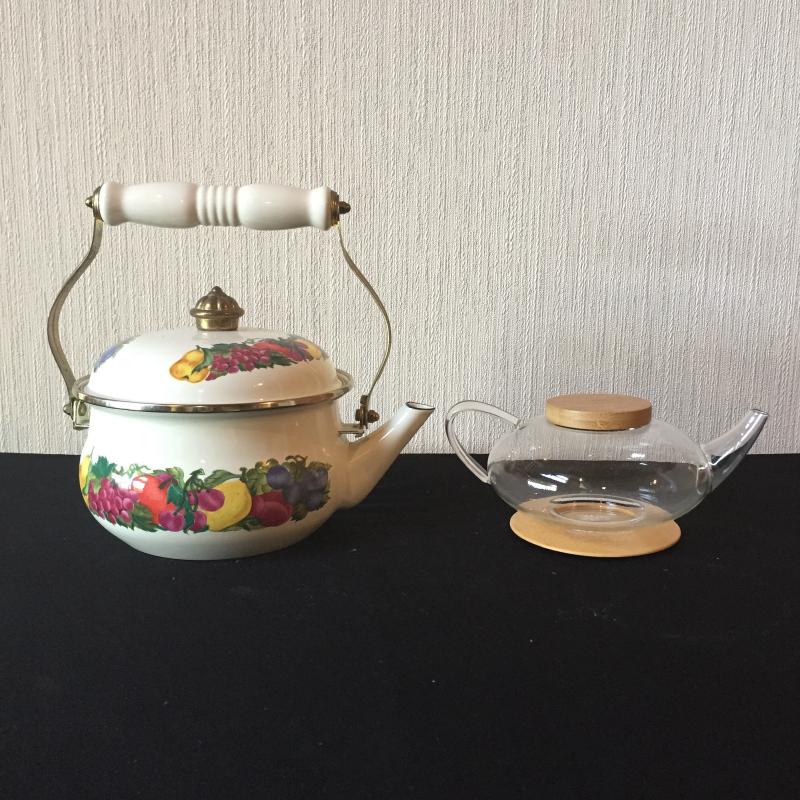 Pair of Teapots One Glass and One with White Enamel With Floral Design. Have a Tea Party. White teapot Measures 7”D.