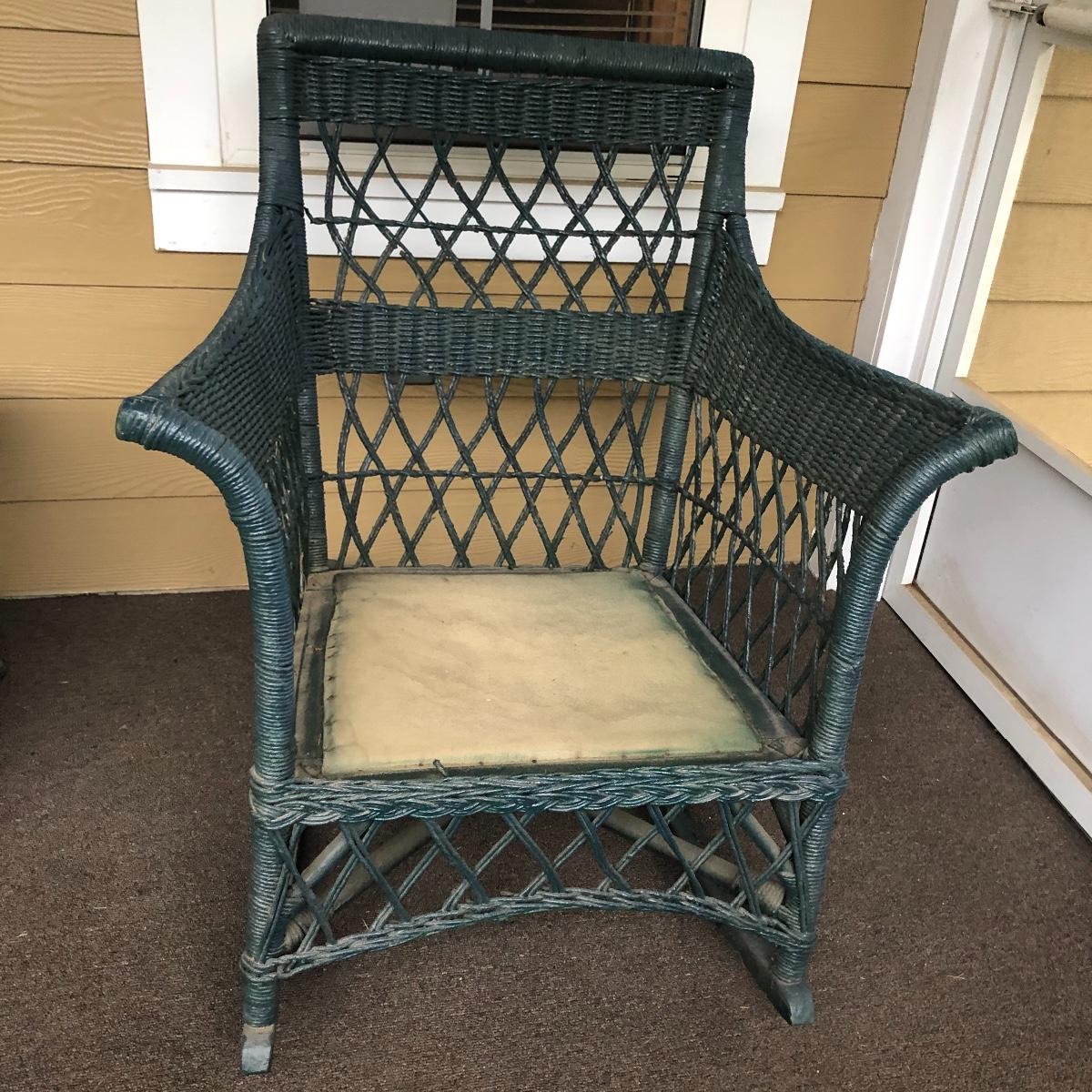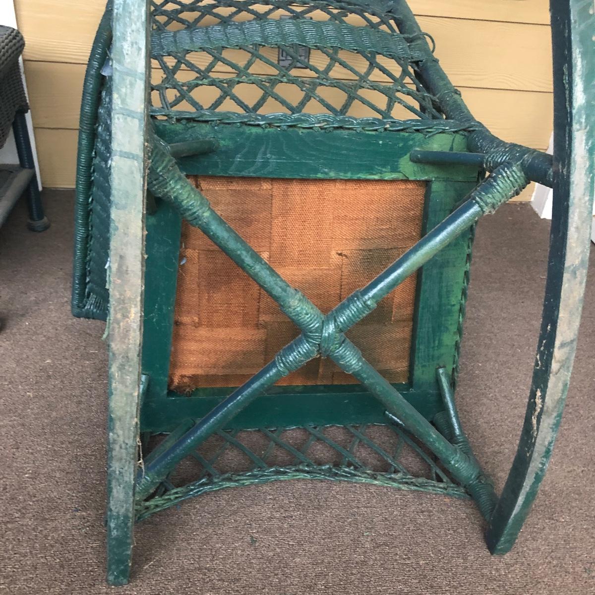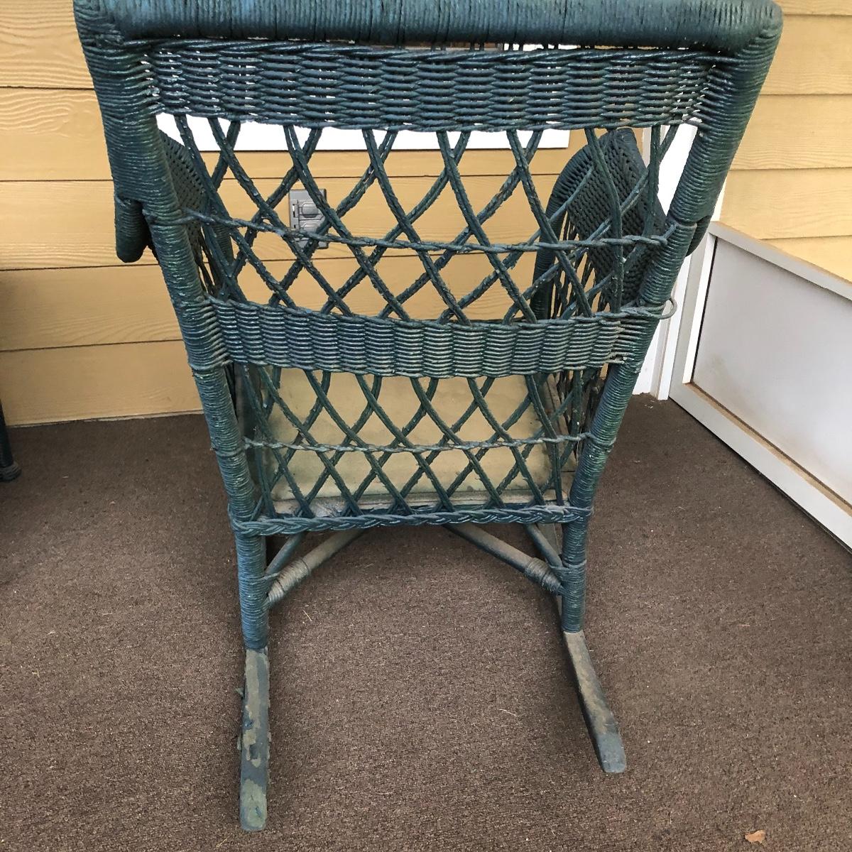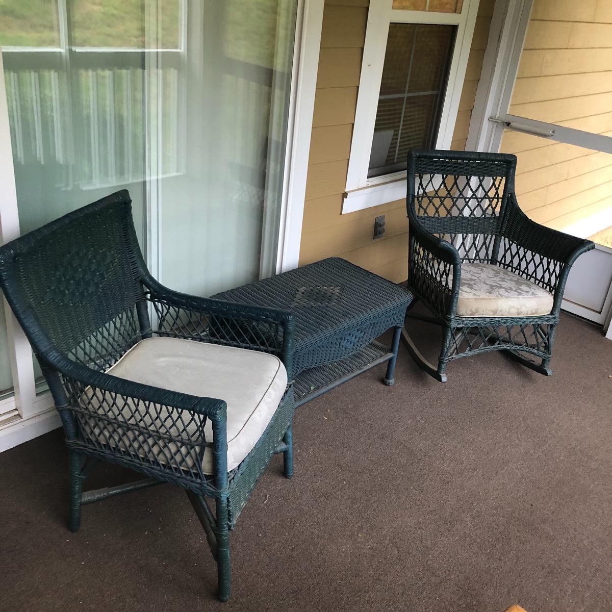 This will be a great set for you to relax on your patio. Lot includes wicker rocker and chair and a faux wicker table. The chairs and table could use a good cleaning and one chair has paint peeling, see pictures. Chair measures 23” x 24” x 35” with a seat height of 19.5” and table measures 18” x 30” x18”.