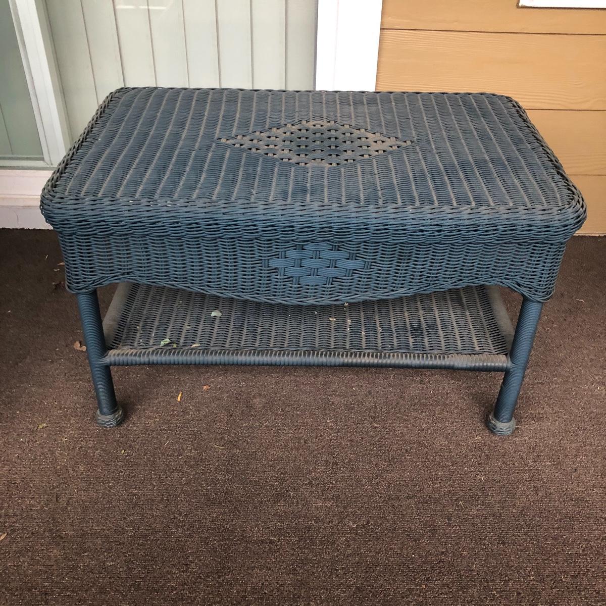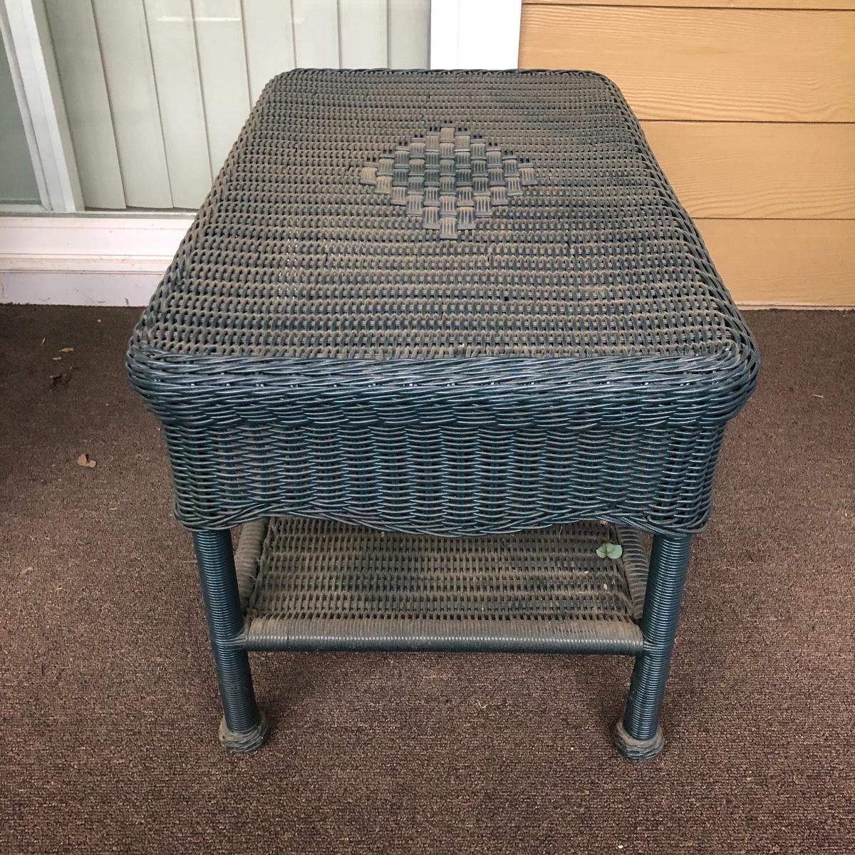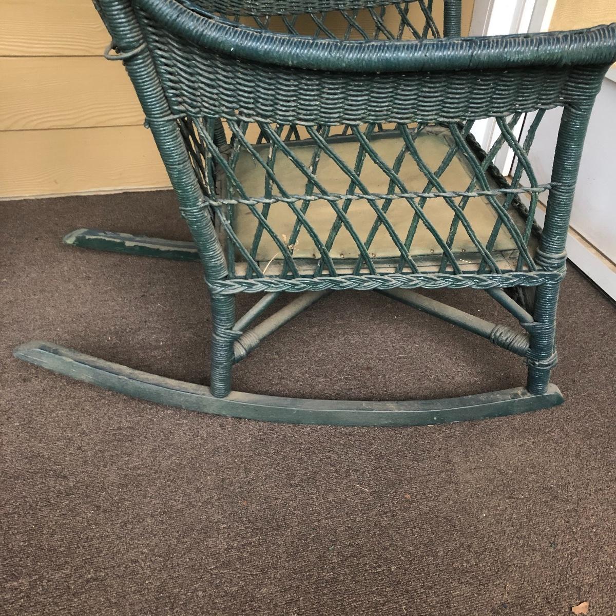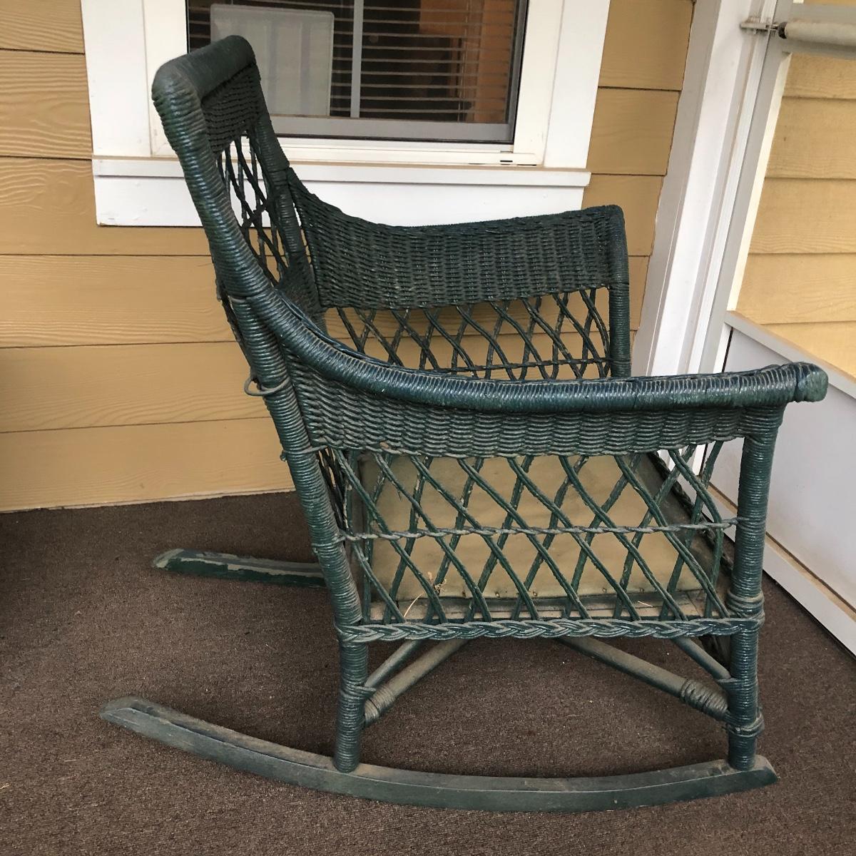 This will be a great set for you to relax on your patio. Lot includes wicker rocker and chair and a faux wicker table. The chairs and table could use a good cleaning and one chair has paint peeling, see pictures. Chair measures 23” x 24” x 35” with a seat height of 19.5” and table measures 18” x 30” x18”.