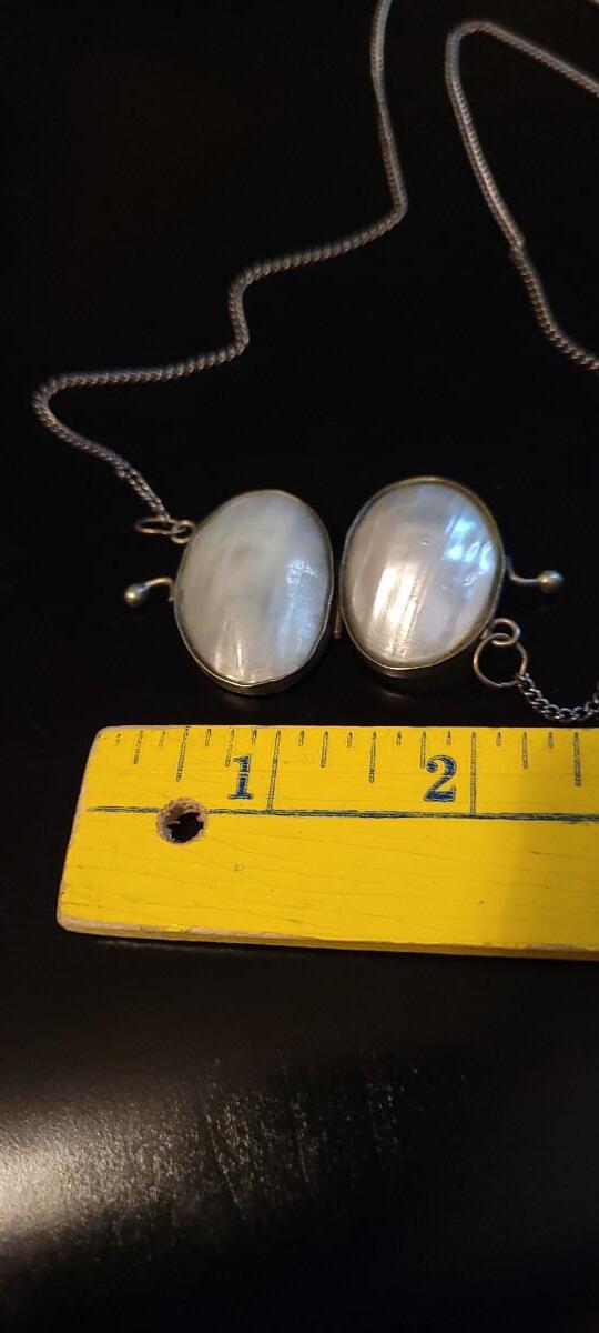 Vintage Clamshell Trinket Box Pendant with Original Necklace Chain that is about 15.5" Drop from top to bottom.
