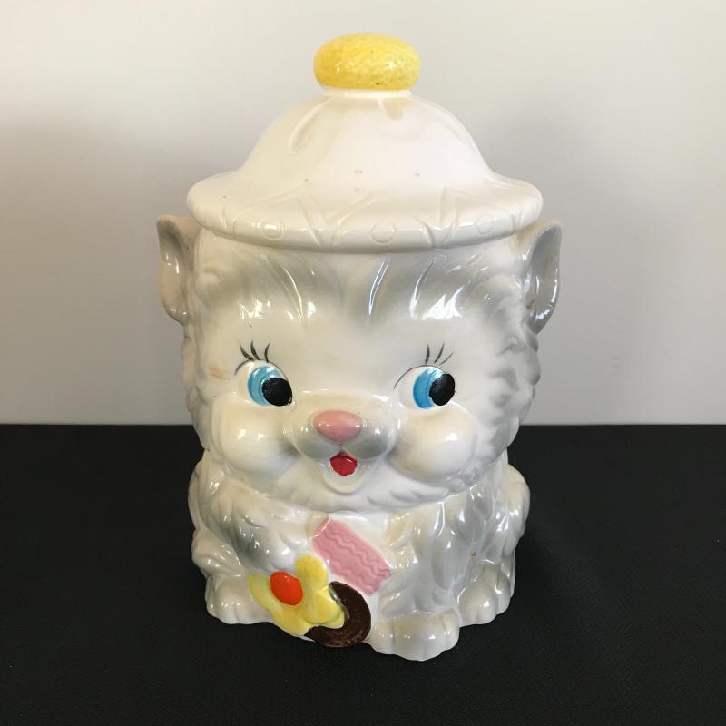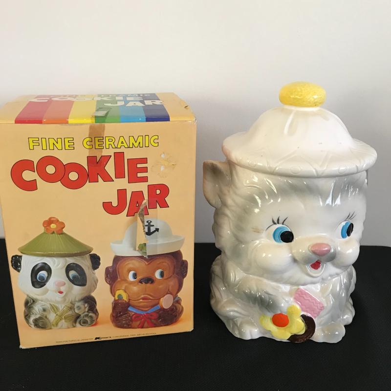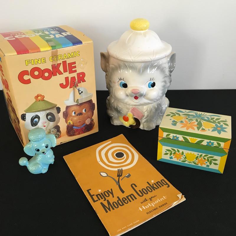This lot includes vintage cookie jar with original box, recipe box, cookbook, and blue poodle figurine. Shipping available or local pickup in Asheville, NC.