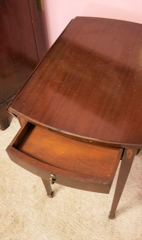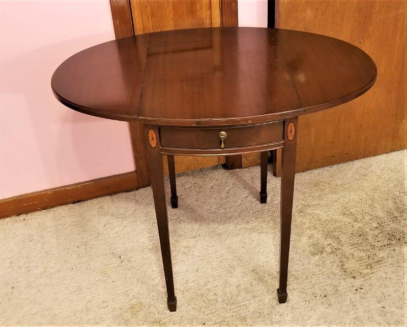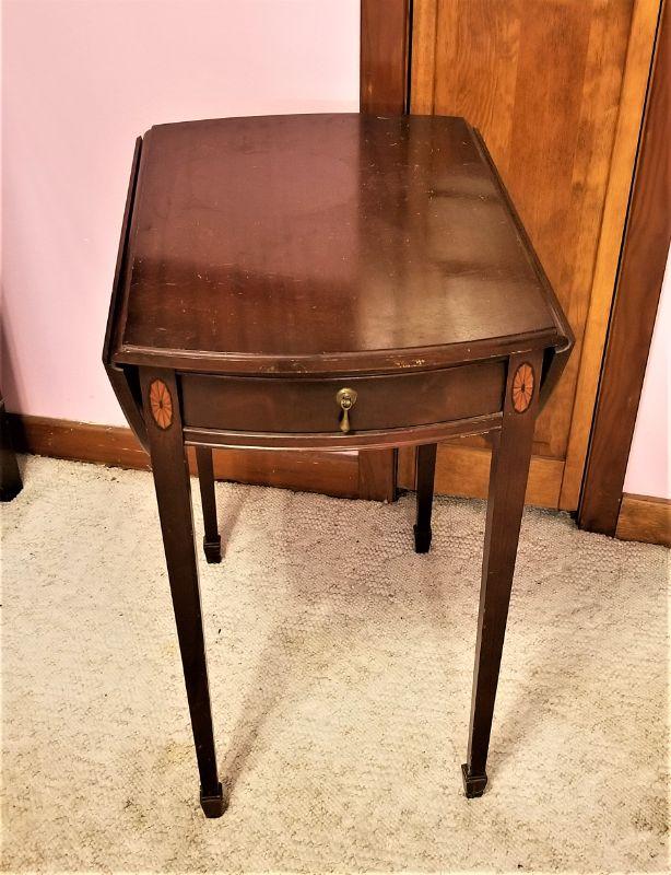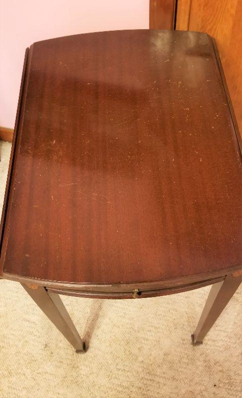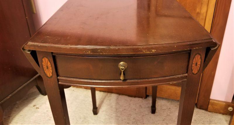 Cute little vintage side table with drawer - drop leaf on each side - tear drop pull on drawer. Measures 26.5" tall, 23" deep. When fully extended 34" across, when not extended 16" across. Vintage condition - see photos.