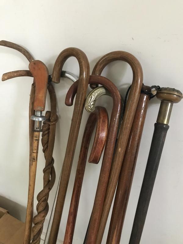 11 walking canes in total including one metal, several wood (from raw twisted wood to smooth) and even a metal-tipped ornate piece with German Silver and brass. One has a plastic gold putter on the end. One looks to be an old golf umbrella. Lot available for shipping or local pick up.