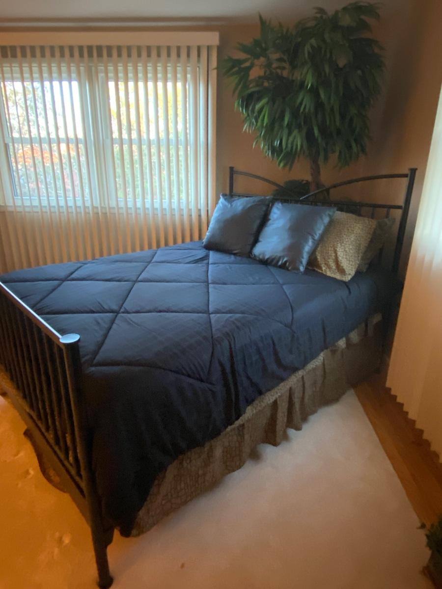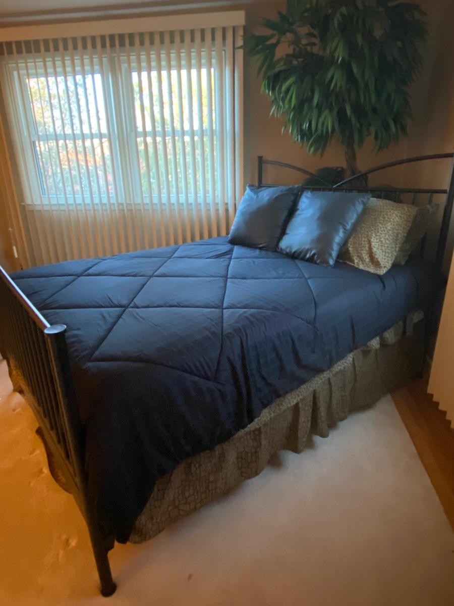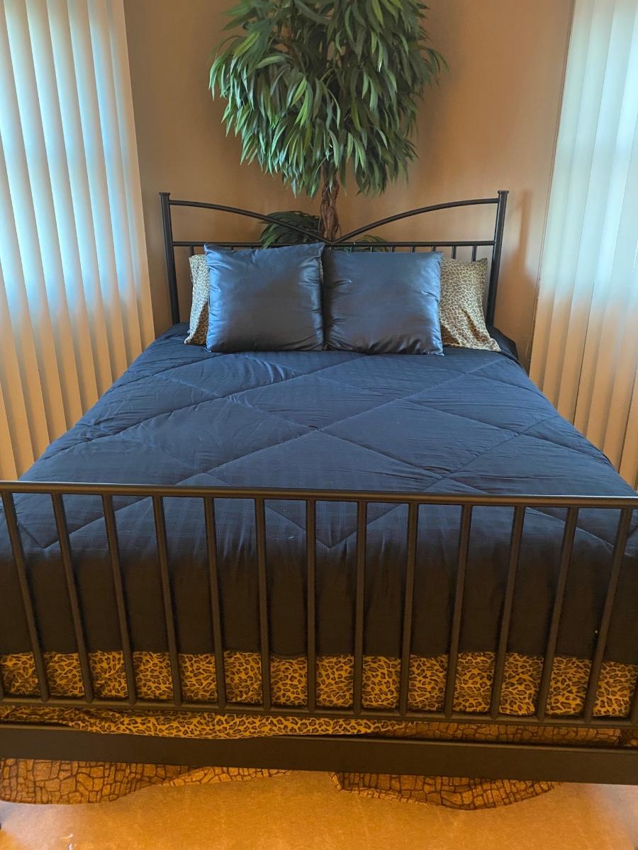 Queen size bed, metal frame and bedding. Mattress, Topper, and box spring is included or can will be donated to buyer upon request. Please see all pictures as they are the best representation of the items. The pictures show condition, measurements if taken, and what is included in the lot. Due to the large amount that we photograph and the time frame, we are not always able to take measurements. All items unless noted, are pre-owned and have been used. If you purchased furniture, you must bring help. We do not allow one person to carry large furniture out on their own. Bring help, tools and a truck for the safety of our client’s homes, and your personal safety. Company policy. Thank you.