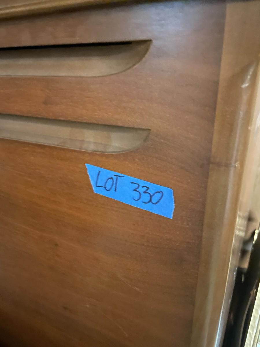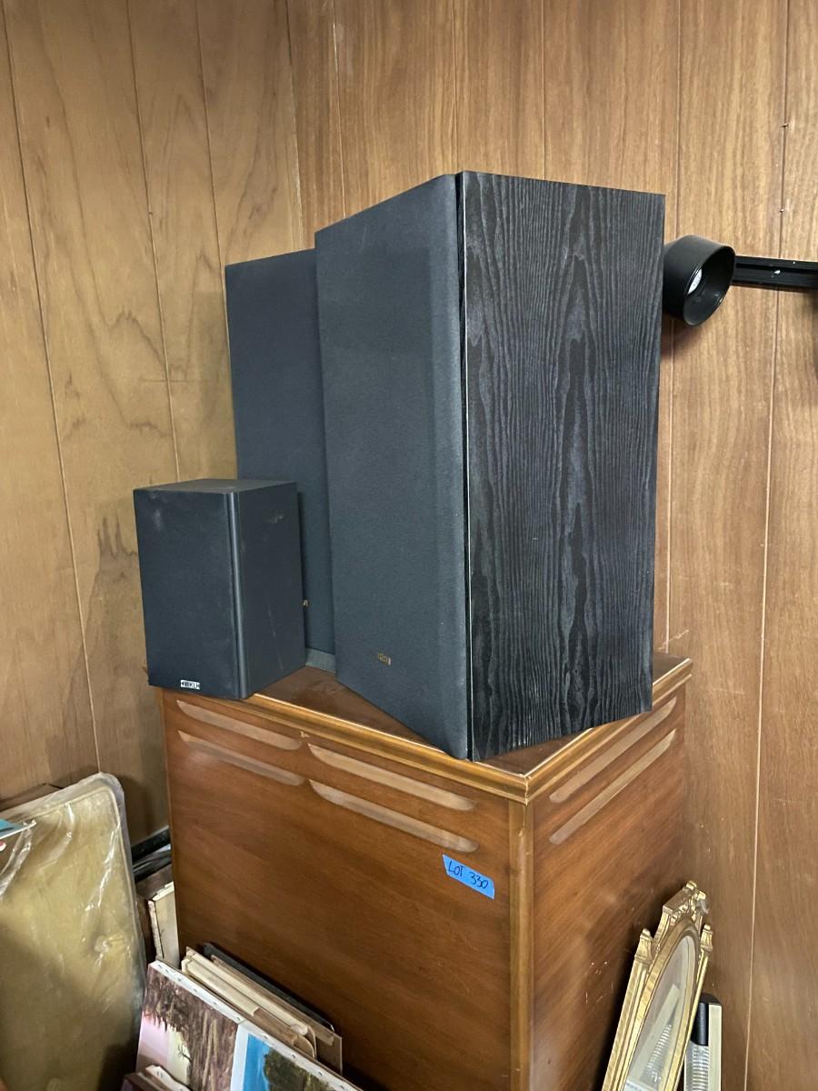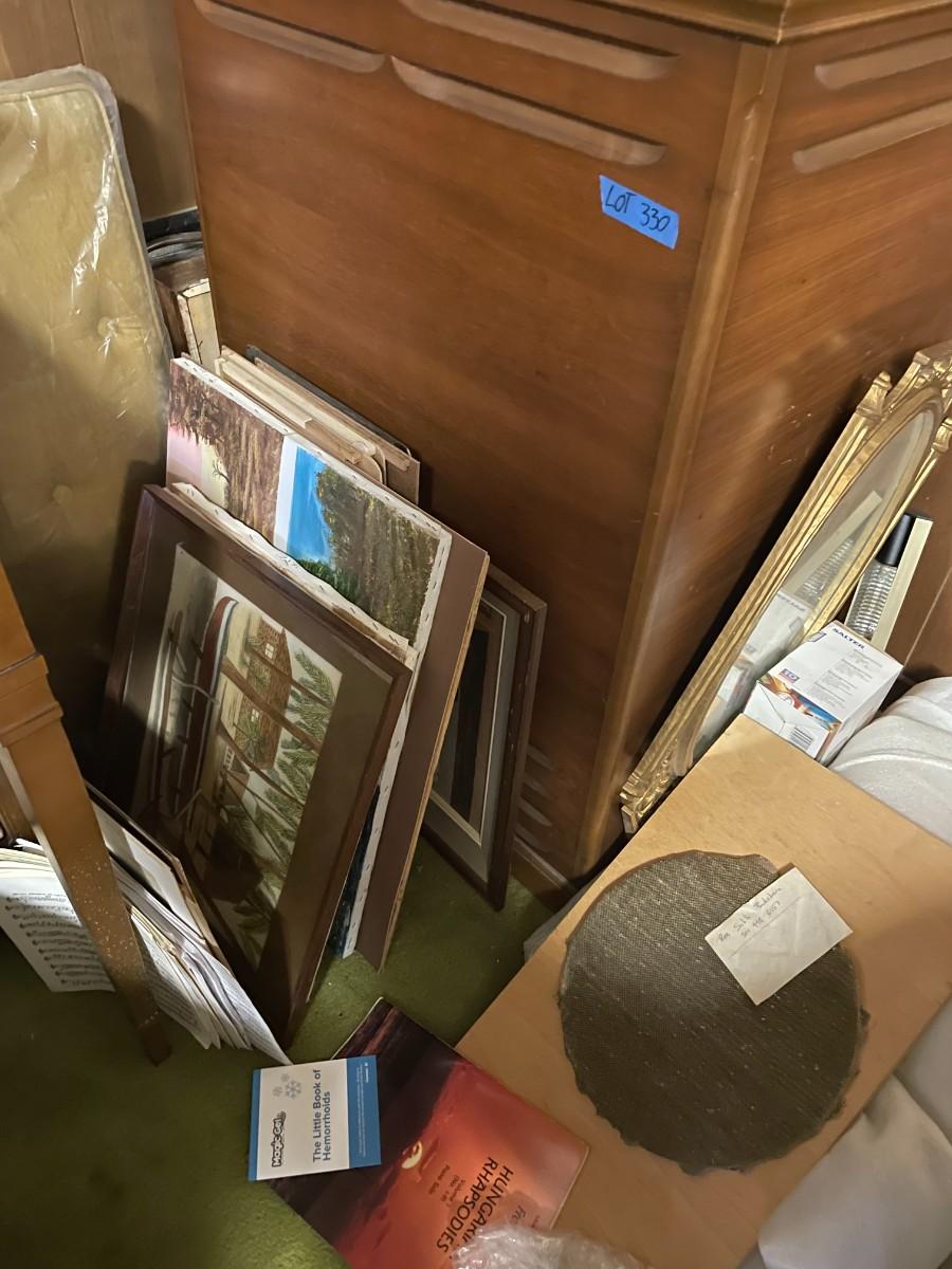lot 330- large cabinet, speakers, lights, misc. frames and pictures