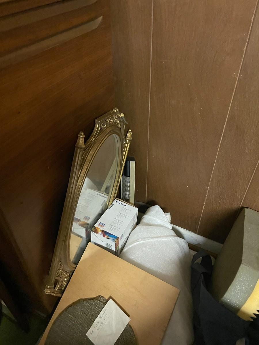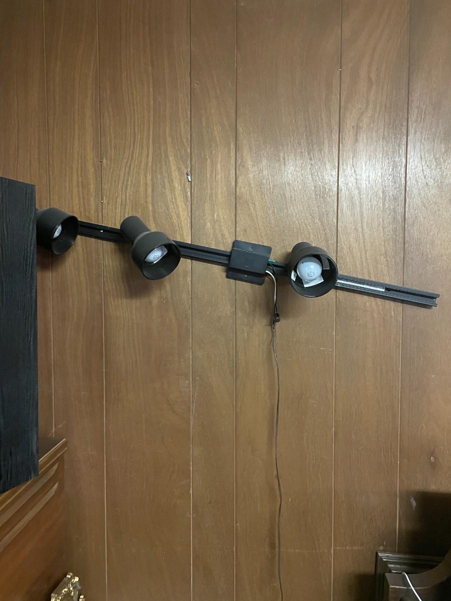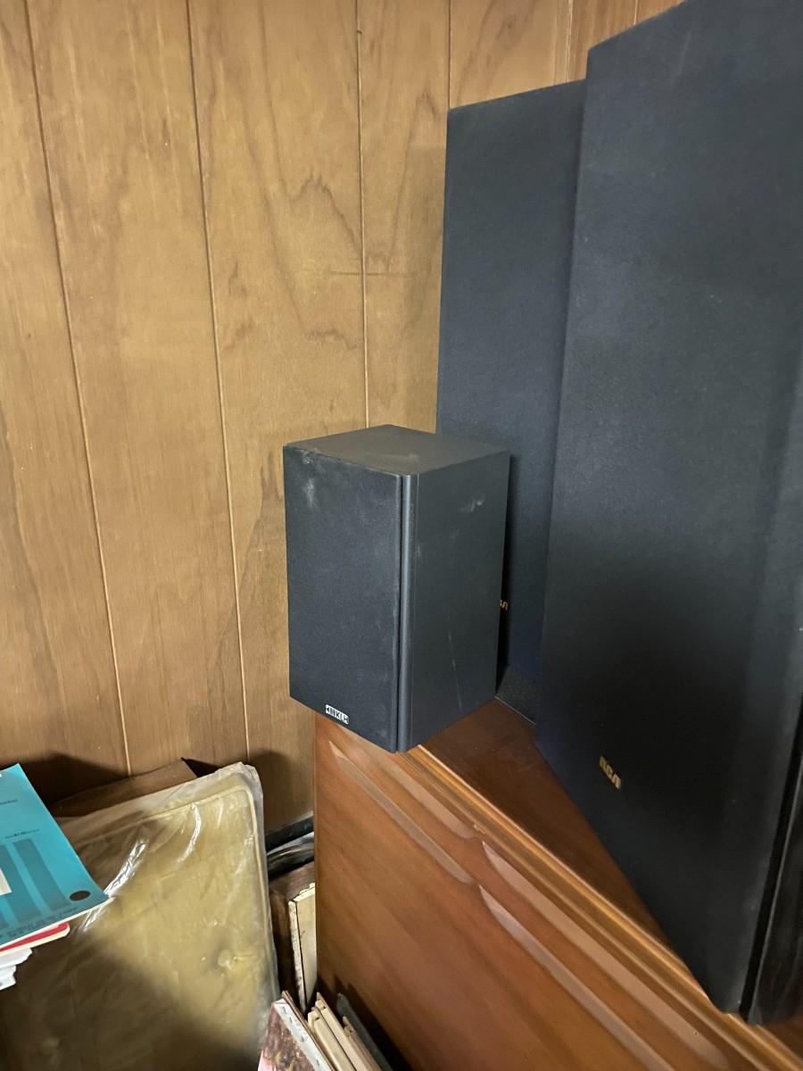 large cabinet, speakers, lights, misc. frames and pictures.