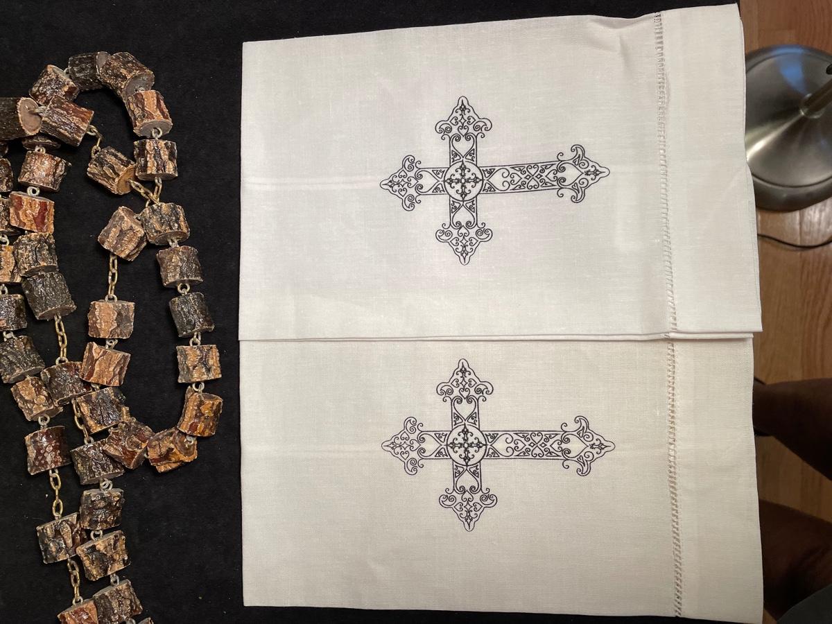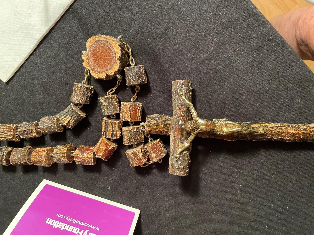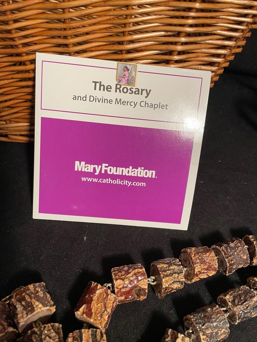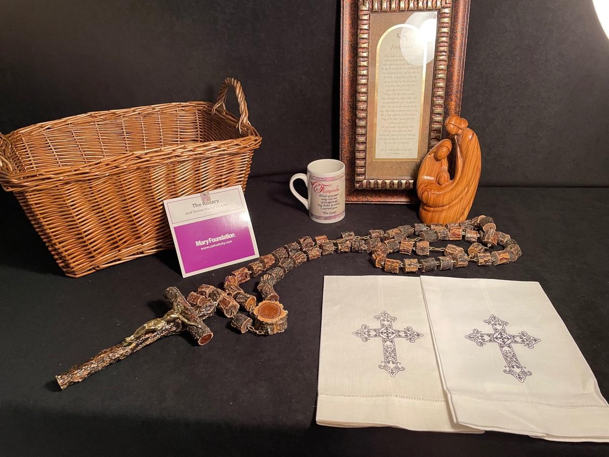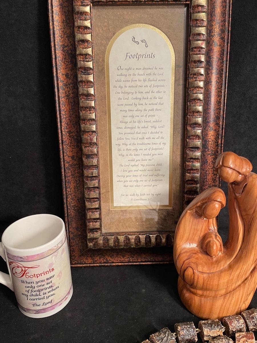Lot 330 Oversized Wooden Rosary, Wooden Carving of Holy Family from Israel, "Footprints" Wall Hanging, Mug, and 2 Hand Towels