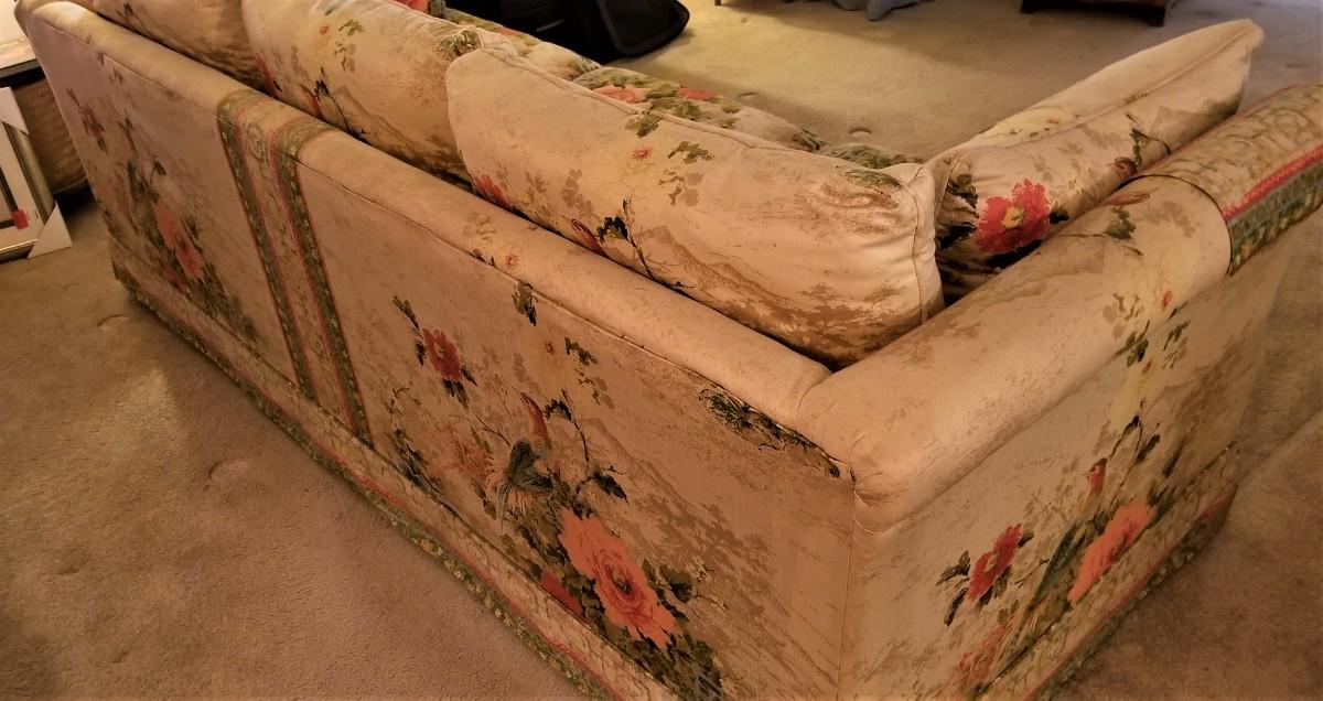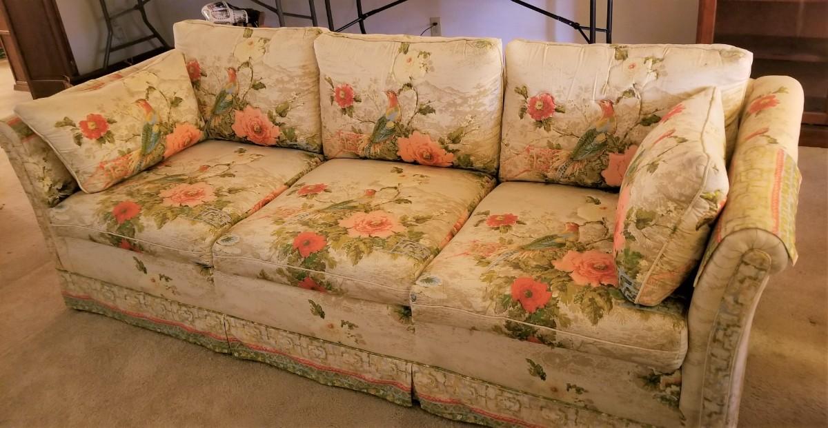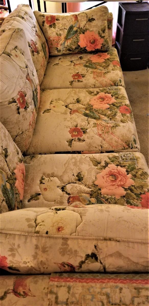 Bird of Paradise motif sofa - matches chair in earlier lot - by the Pem-Key Furniture Company, late 1970's. Vintage condition - comfy. 35" deep, 87" long, 34" tall. Finished all the way around.