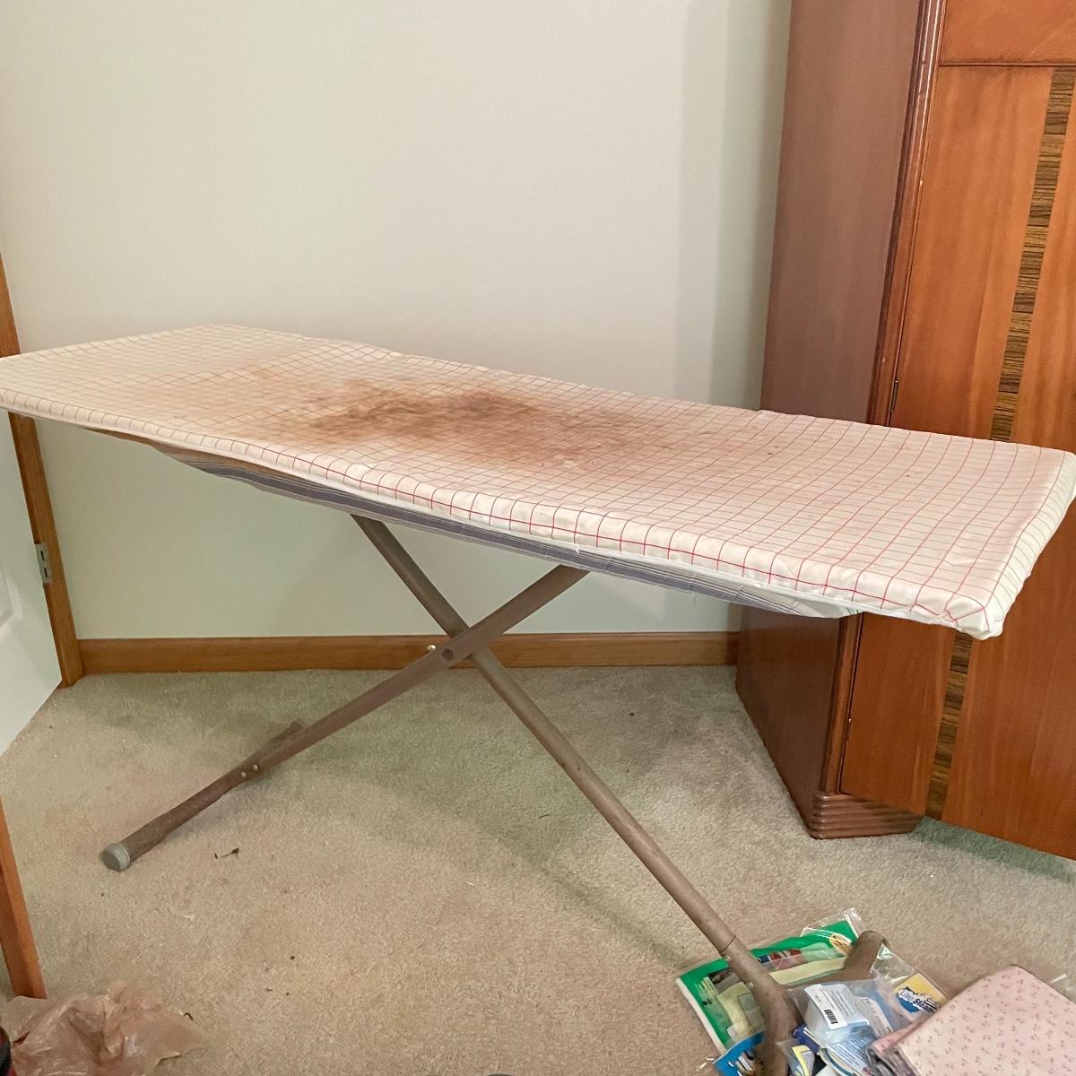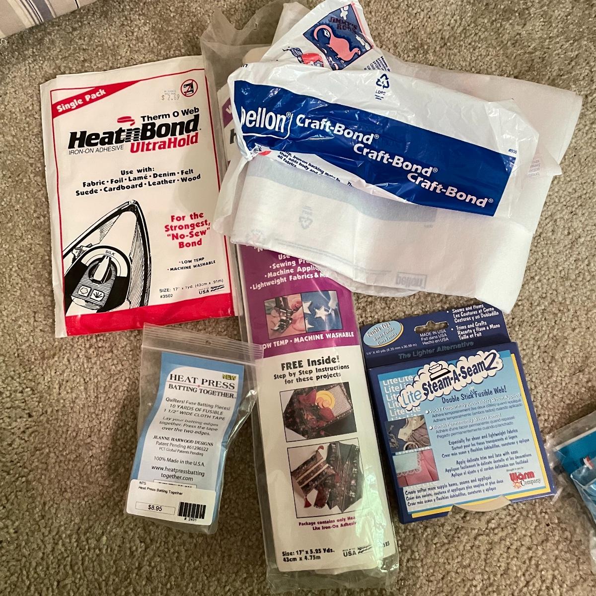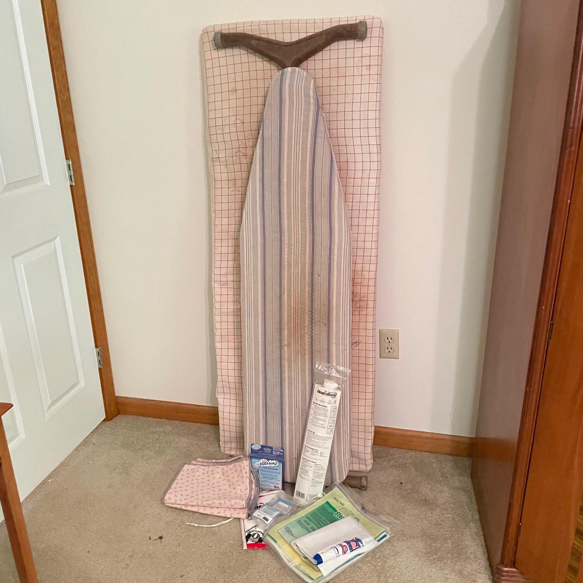 Sturdy vintage metal ironing board with a custom fit pressed wood sewing board. Both covers have been well loved and need some cleaning or replacing. Lot also contains Heat Press Batting Together, HeatnBond UltraHold, Steam-a-Seam, and more. See images. Board measures 59” x 22.5”. Ironing board has some blemishes on its legs, but it doesn’t change its sturdy feel. Local pick up only.