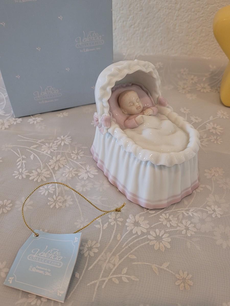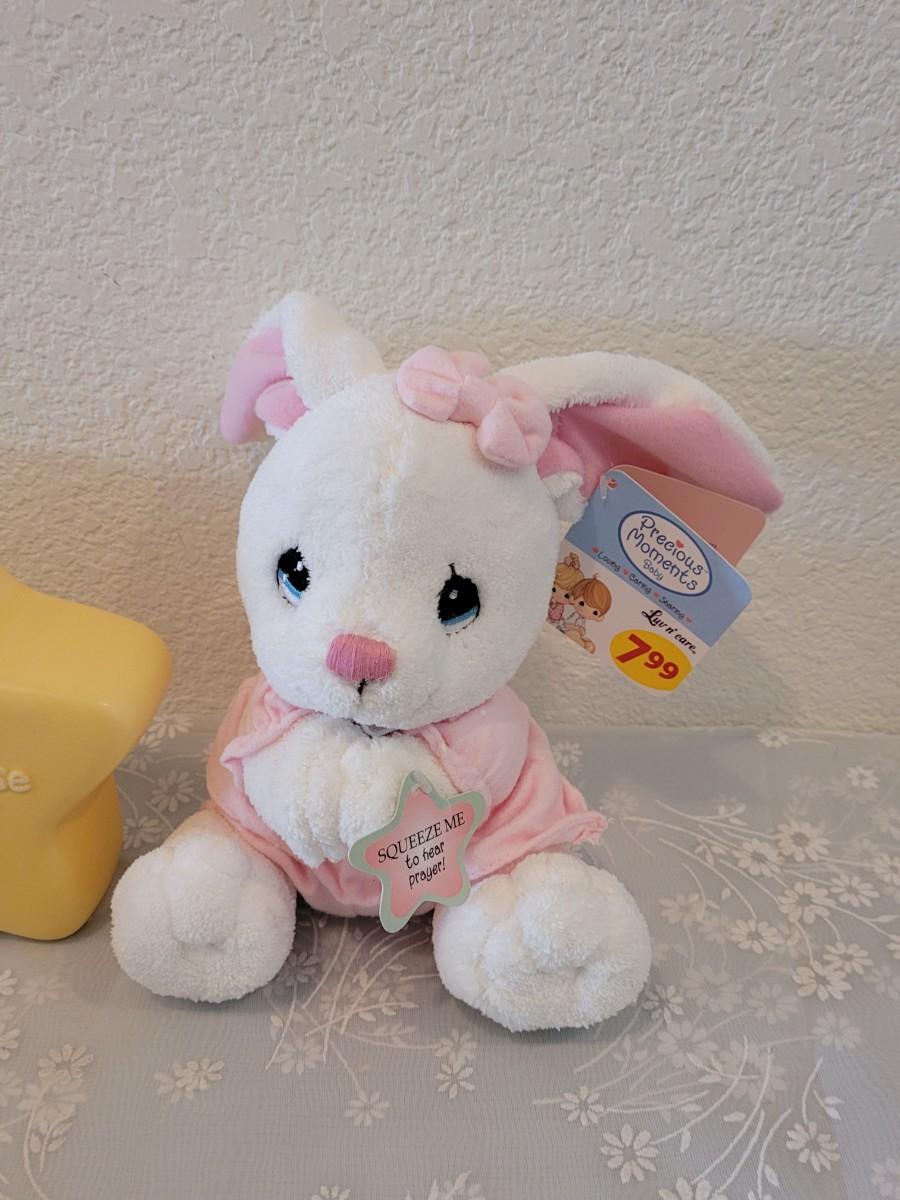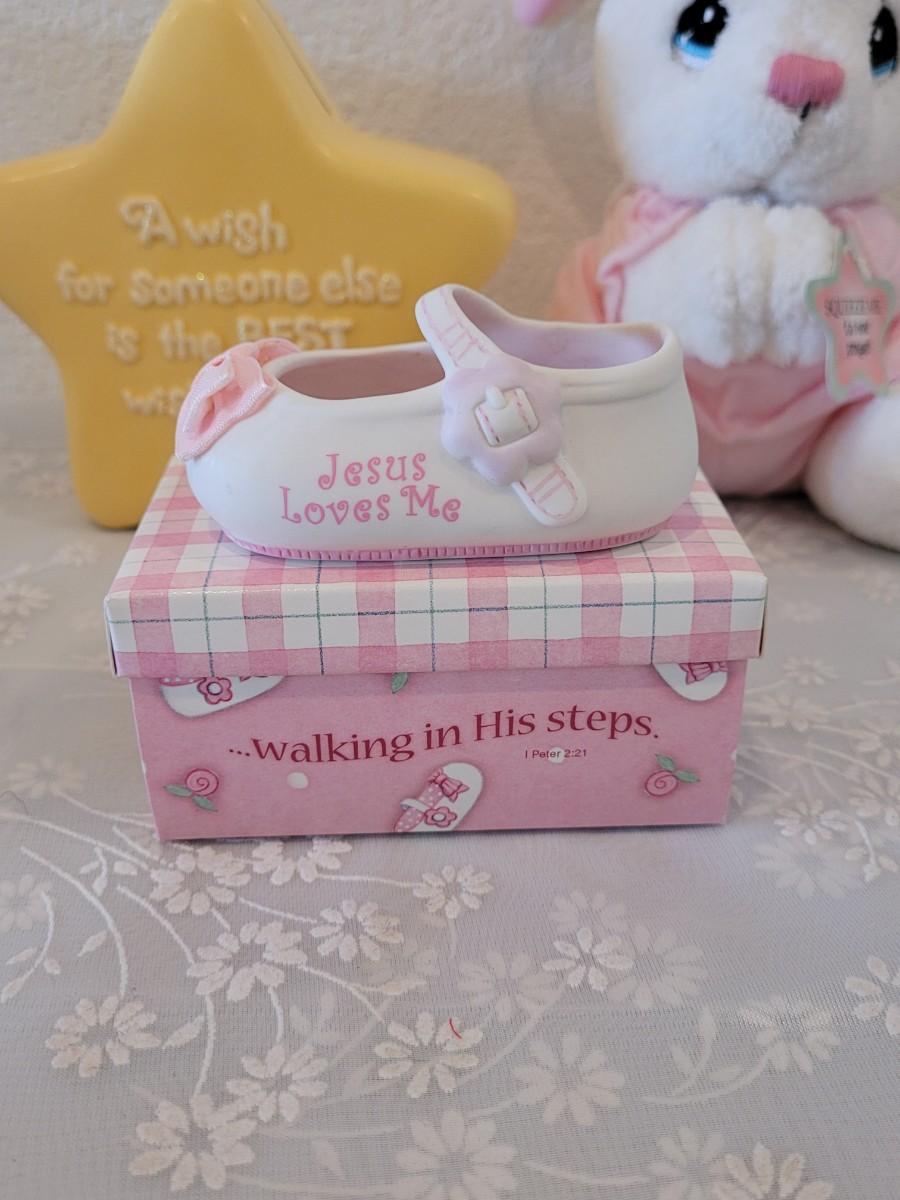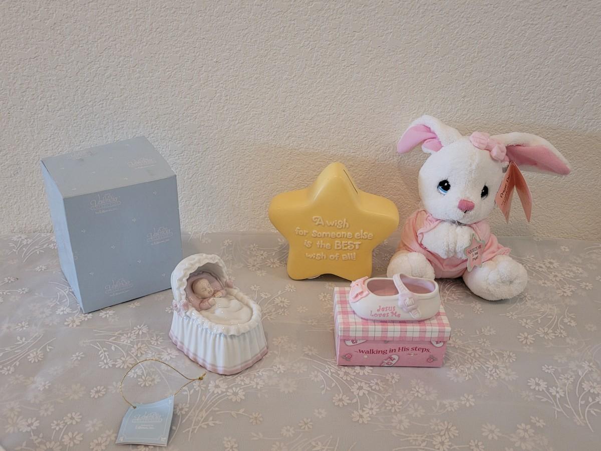Lot 331: Precious Moments Prayer Bunny, Star Bank, Decorative Shoe and Musiacel Baby in Bassinet