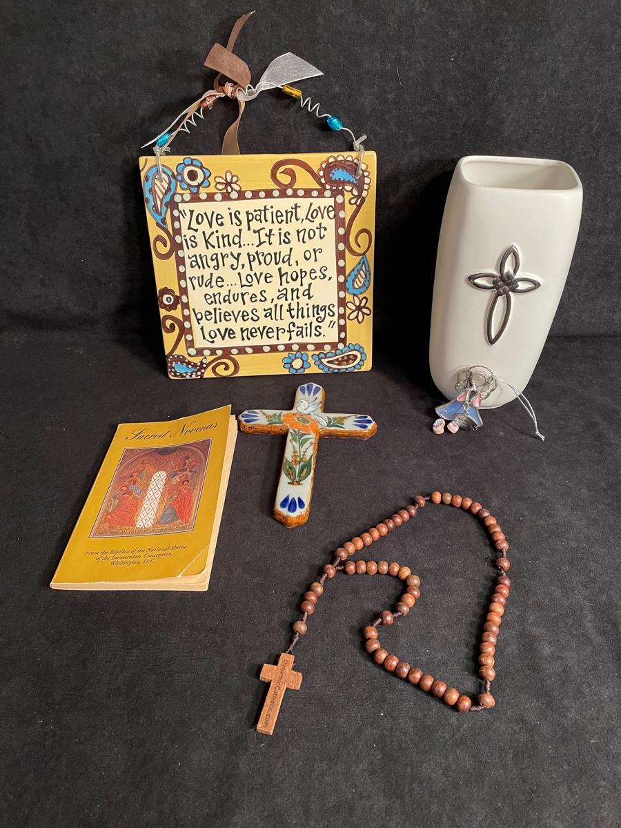Lot 331  Lovely Ceramic Vase, Novena Booklet, Hand Painted Ceramic Cross, Wood Rosary, I Corinthians 13 Ceramic Plaque, Tiny Angel Ornament