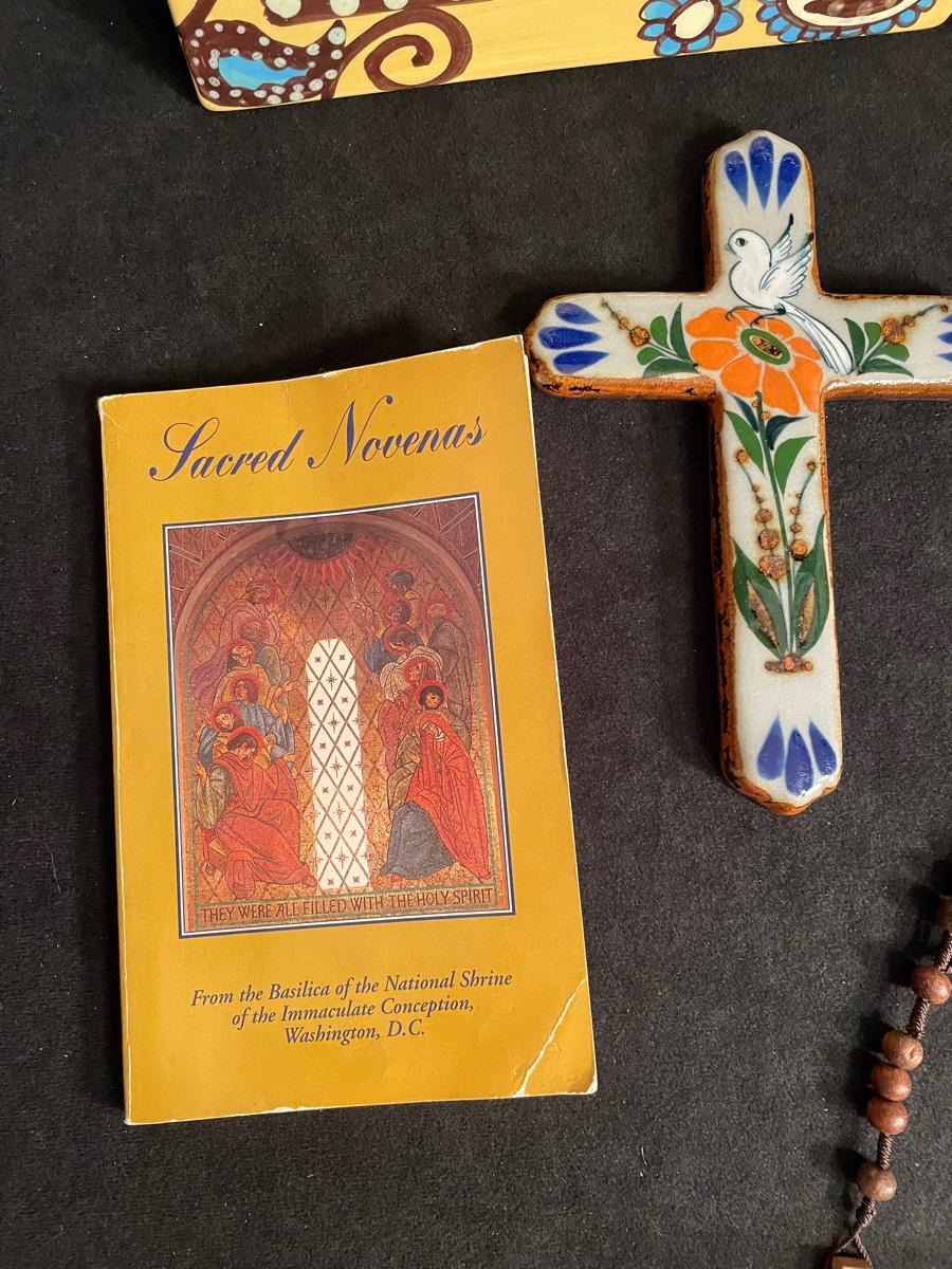 Lot 331 Lovely Ceramic Vase, Novena Booklet, Hand Painted Ceramic Cross, Wood Rosary, I Corinthians 13 Ceramic Plaque, Tiny Angel Ornament