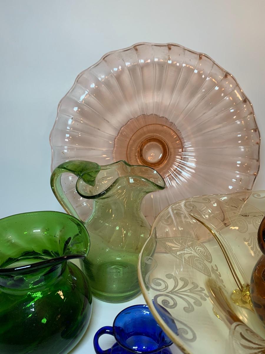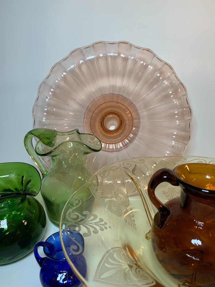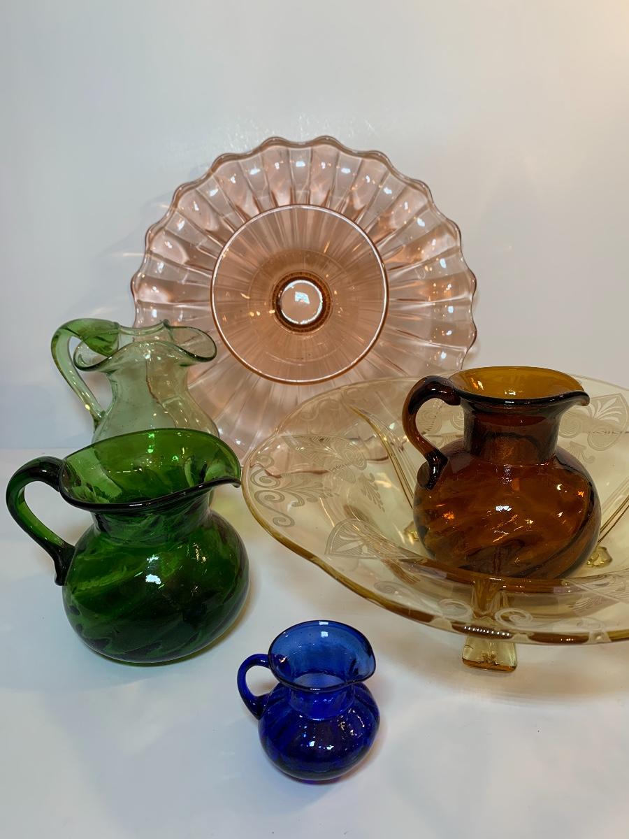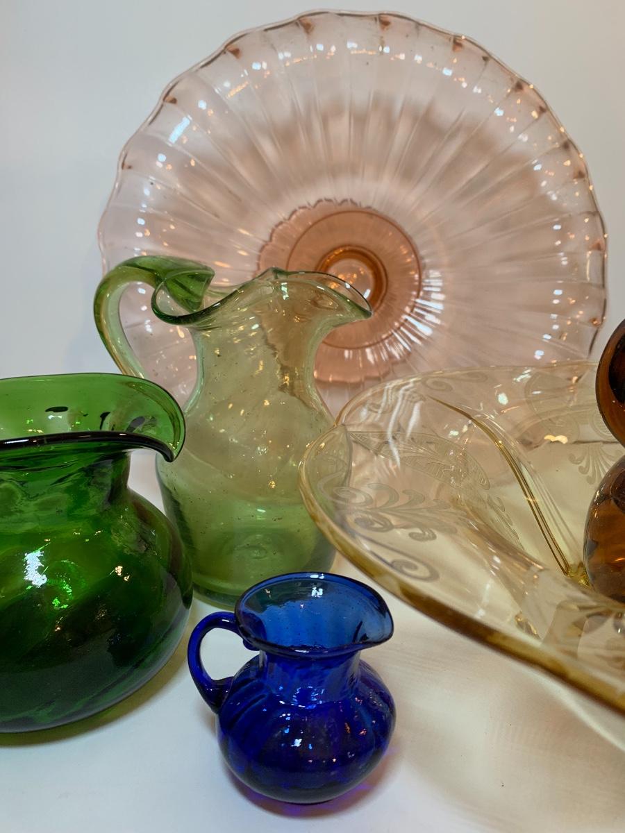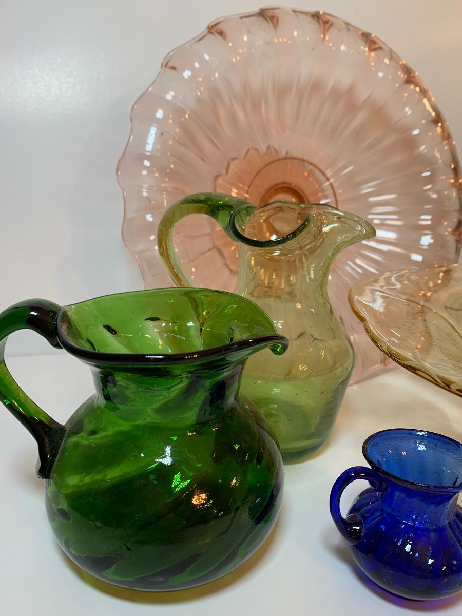 Beautiful glassware ware including hand blown pitchers in green, brown and blue along with a pink pedestal bowl and yellow etched bowl.