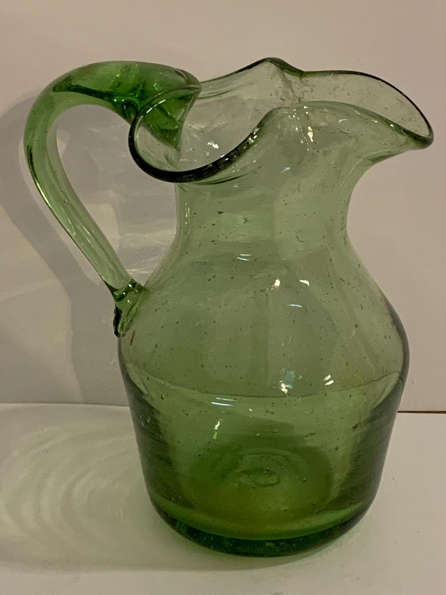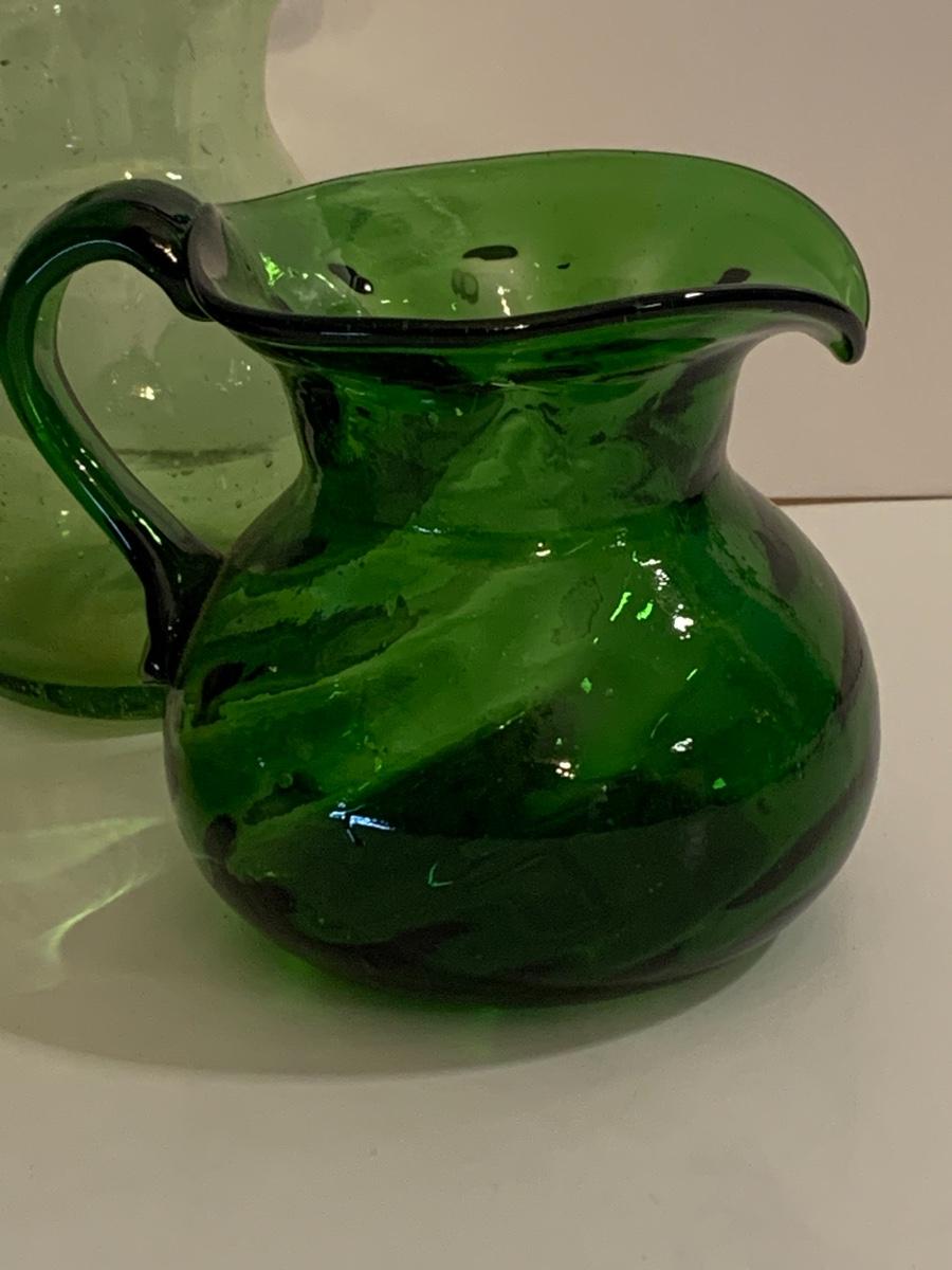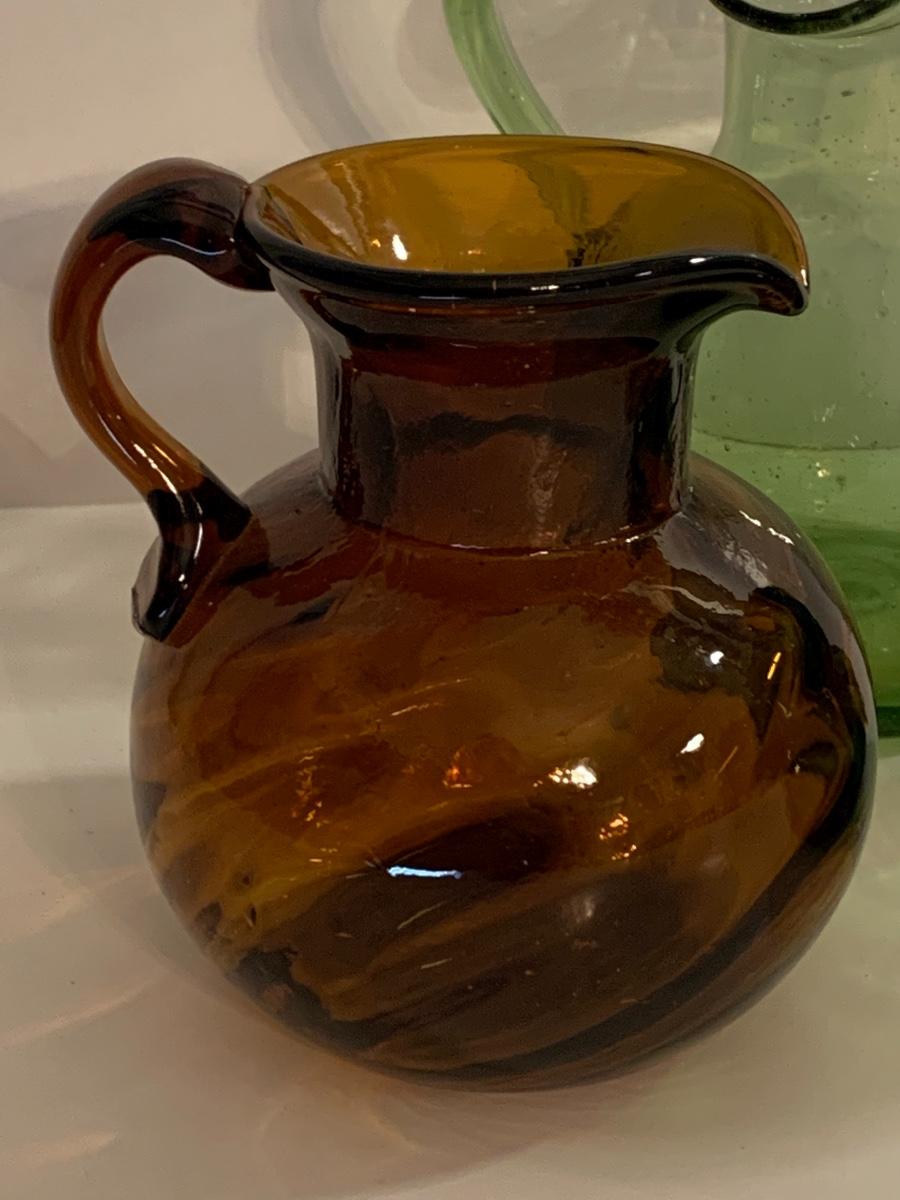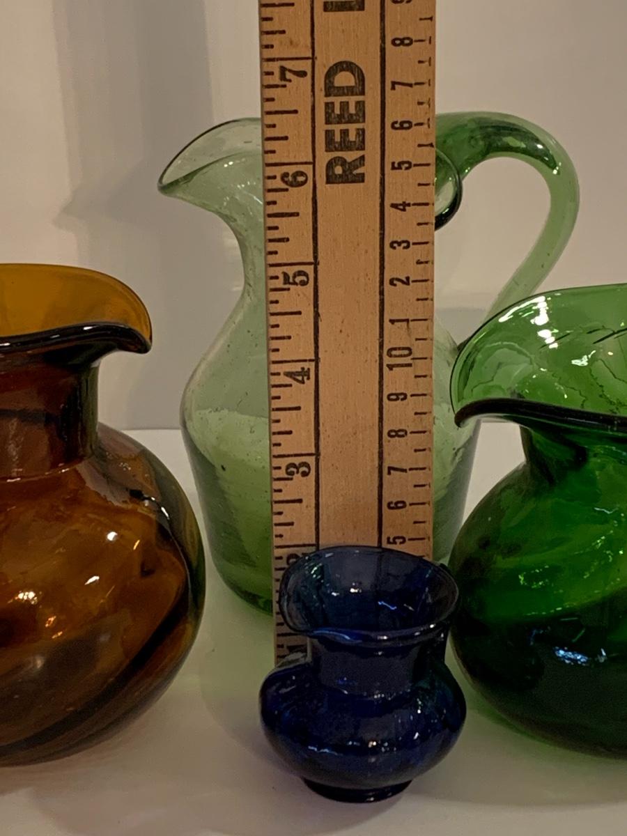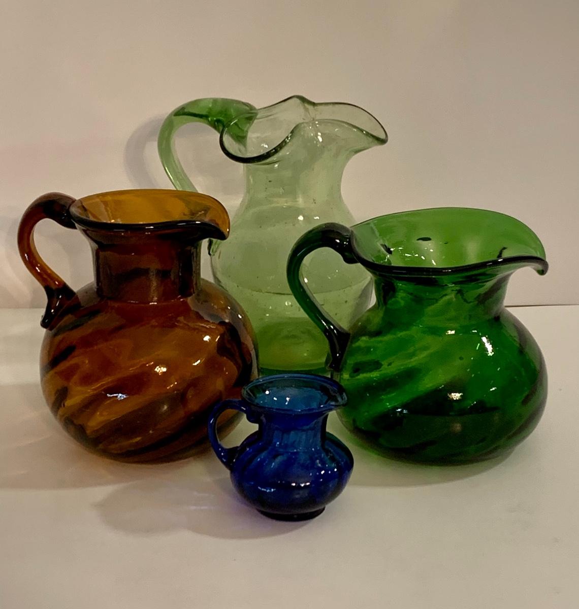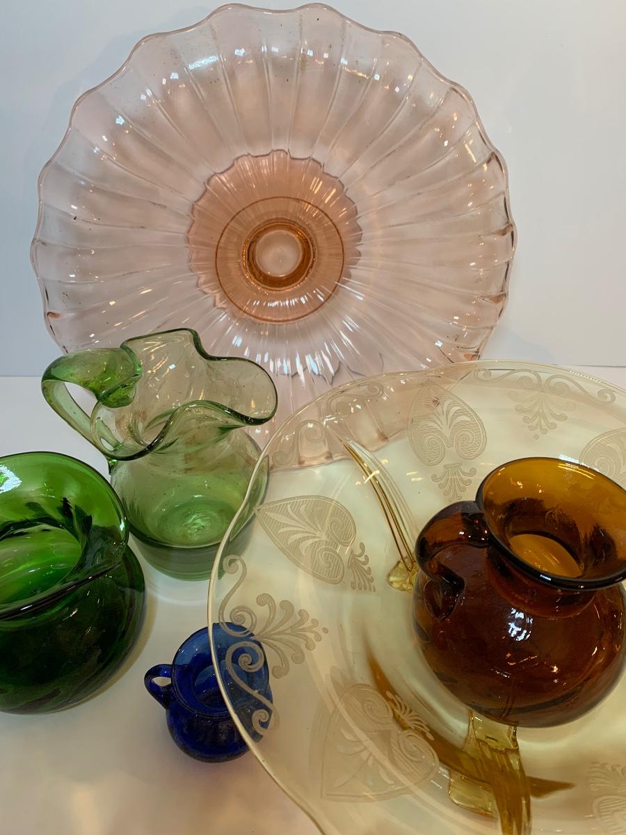 Beautiful glassware ware including hand blown pitchers in green, brown and blue along with a pink pedestal bowl and yellow etched bowl.