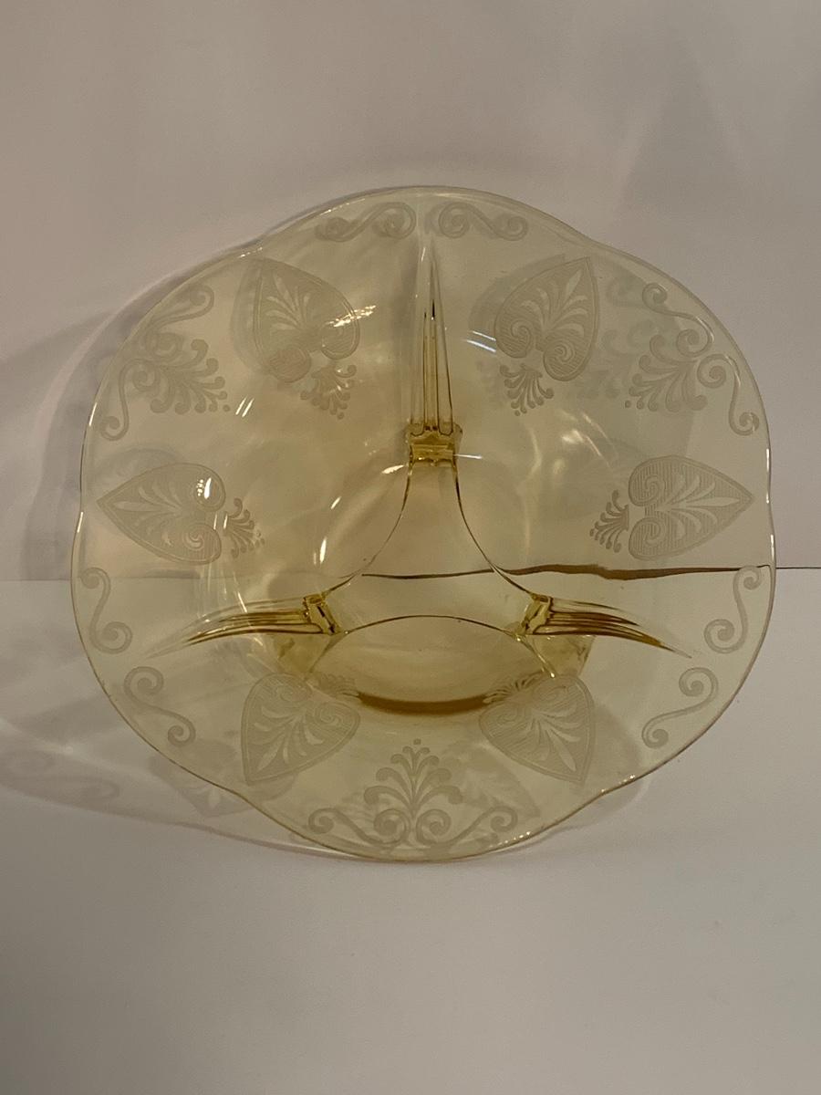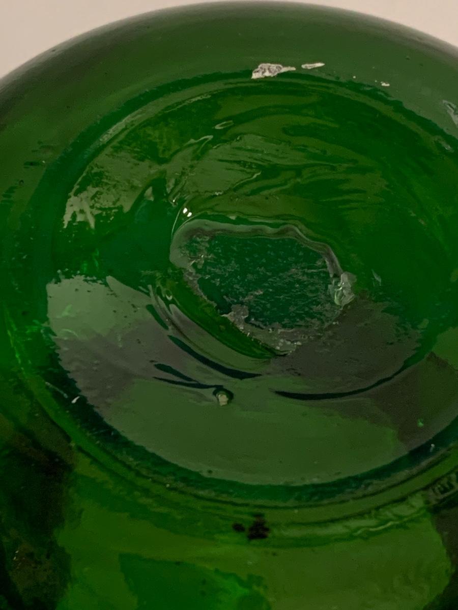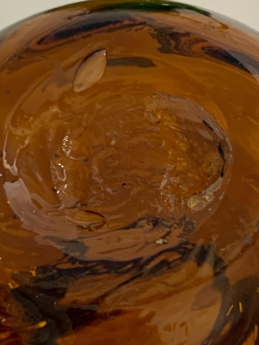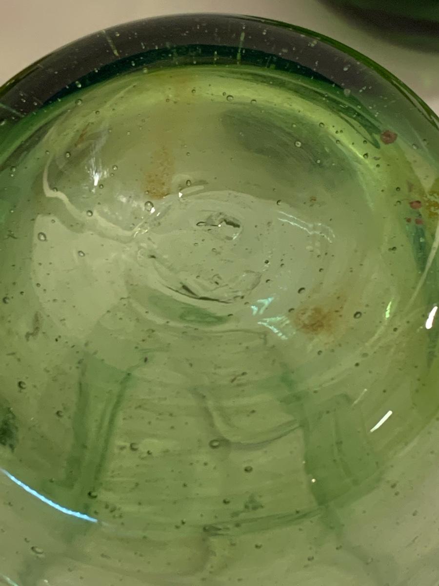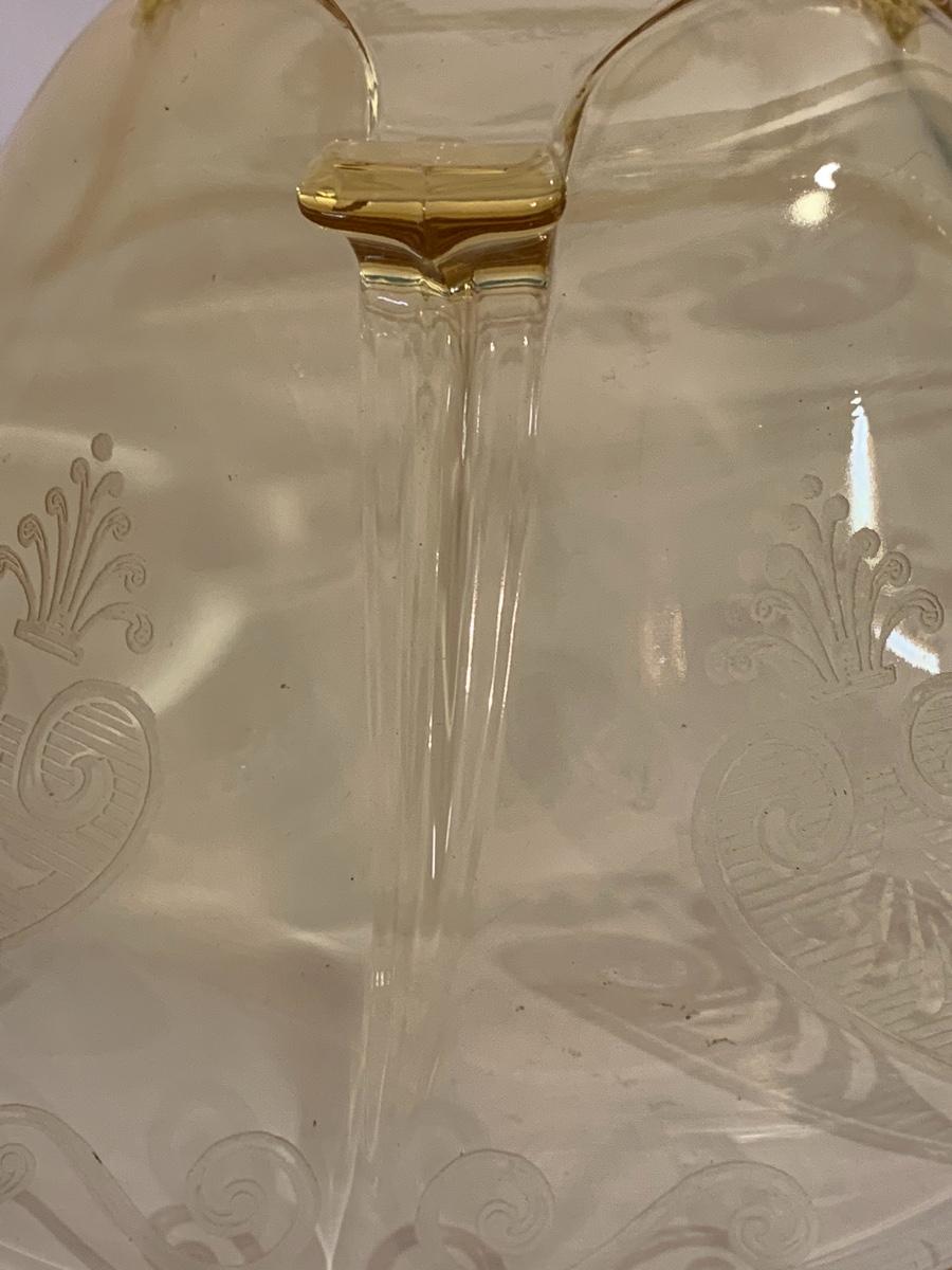 Beautiful glassware ware including hand blown pitchers in green, brown and blue along with a pink pedestal bowl and yellow etched bowl.