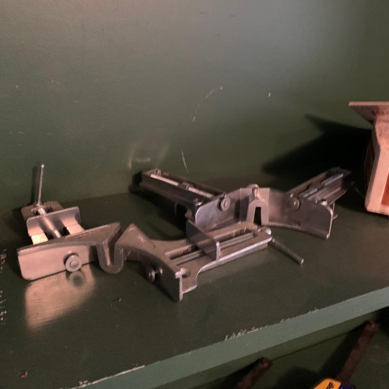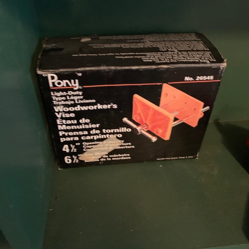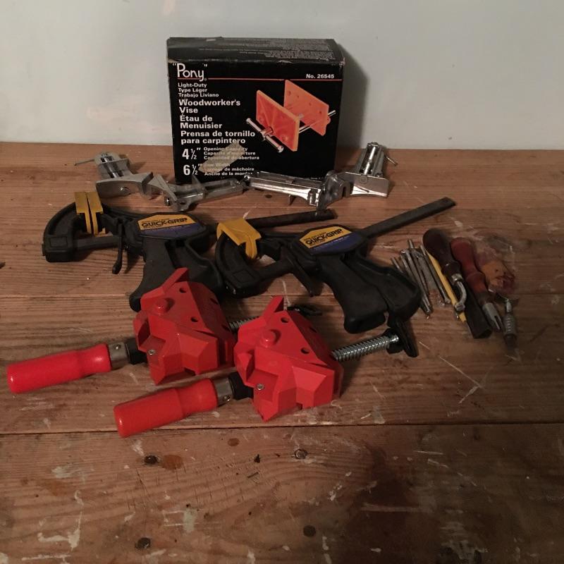 Pony woodworkers vise, Bessey hand corner vise, pair of quick grips, aluminum corner vise along with some wood working tools and two books make up this lot for the wood worker. Local pick up.