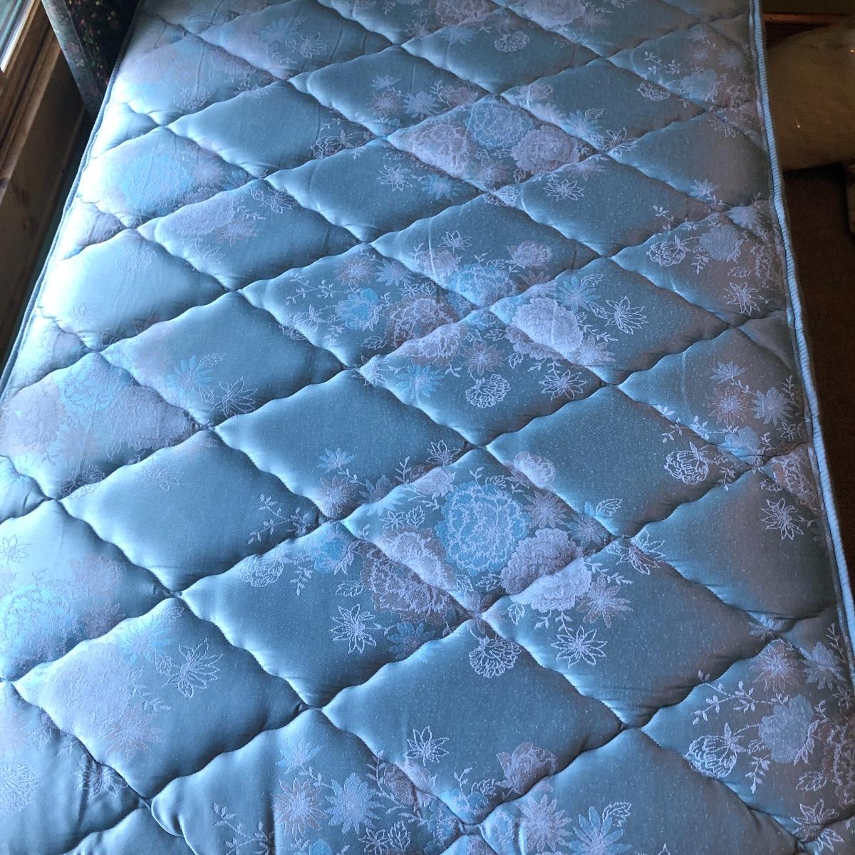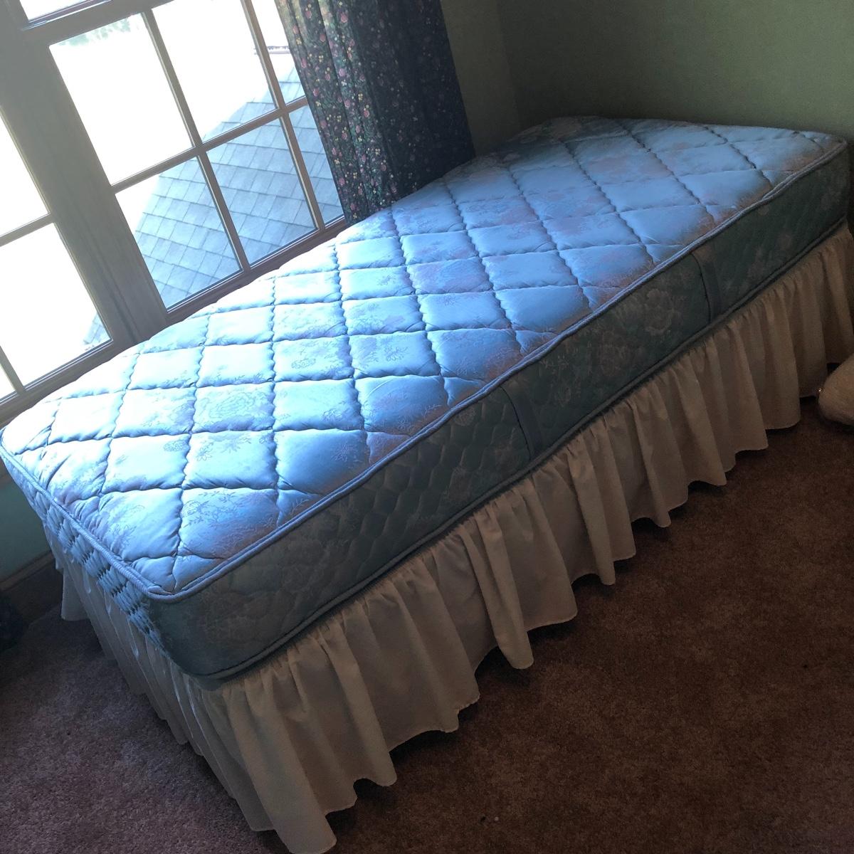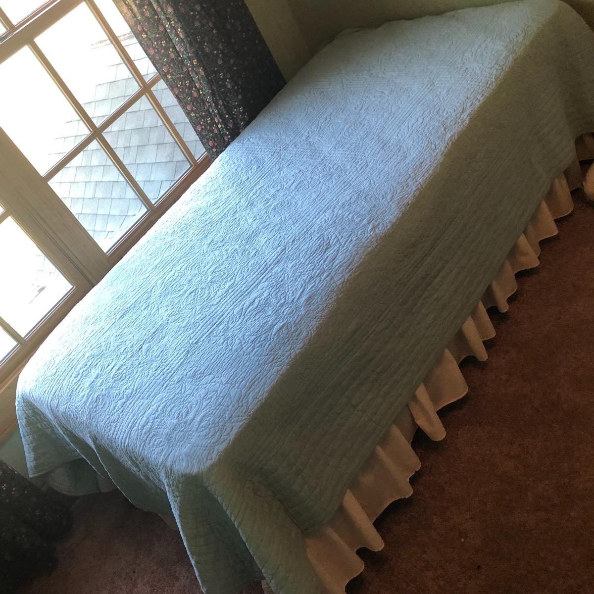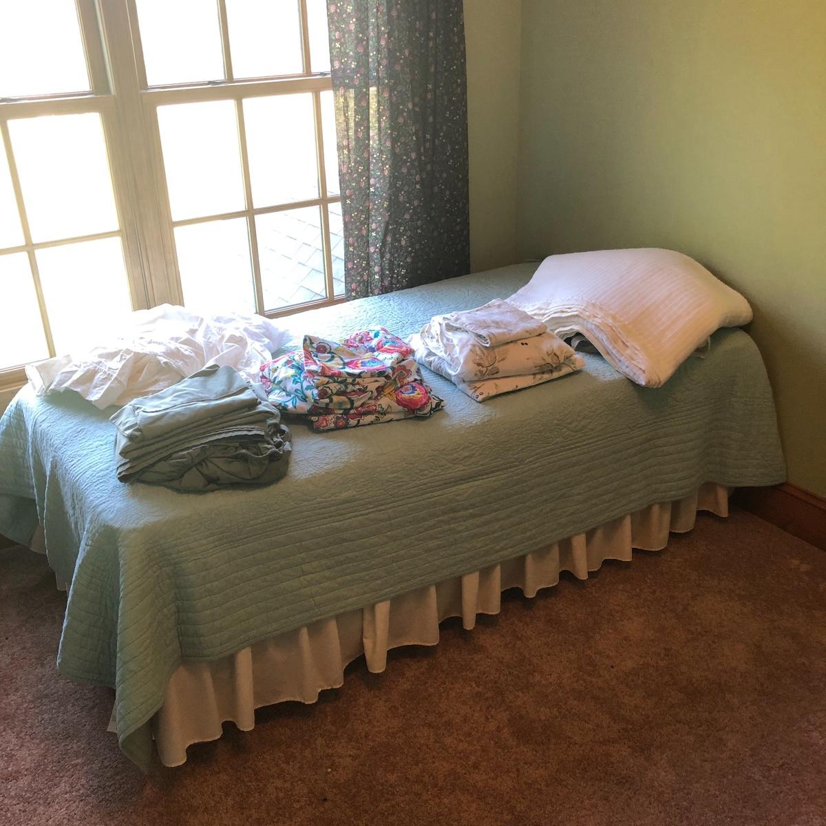 This lot has a nice assortment of twin bedding that include three sets that each have a flat and fitted sheet and pillowcase. Also included is a pretty pale blue 100% cotton bedspread, two bed skirts and two blankets (note the stains shown in images of the one). The mattress, box spring and frame are available for the winning bidder.