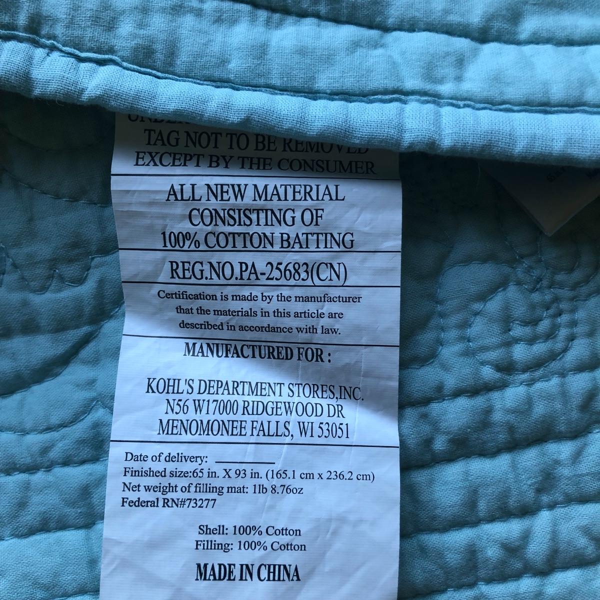 Blue bedspread measures 64” x 94”.