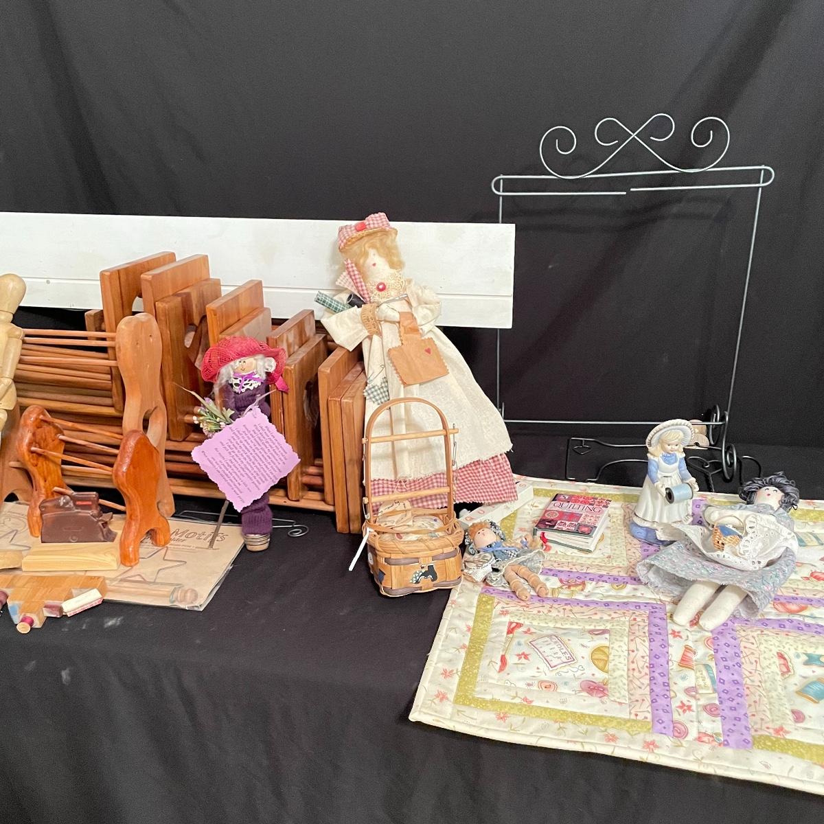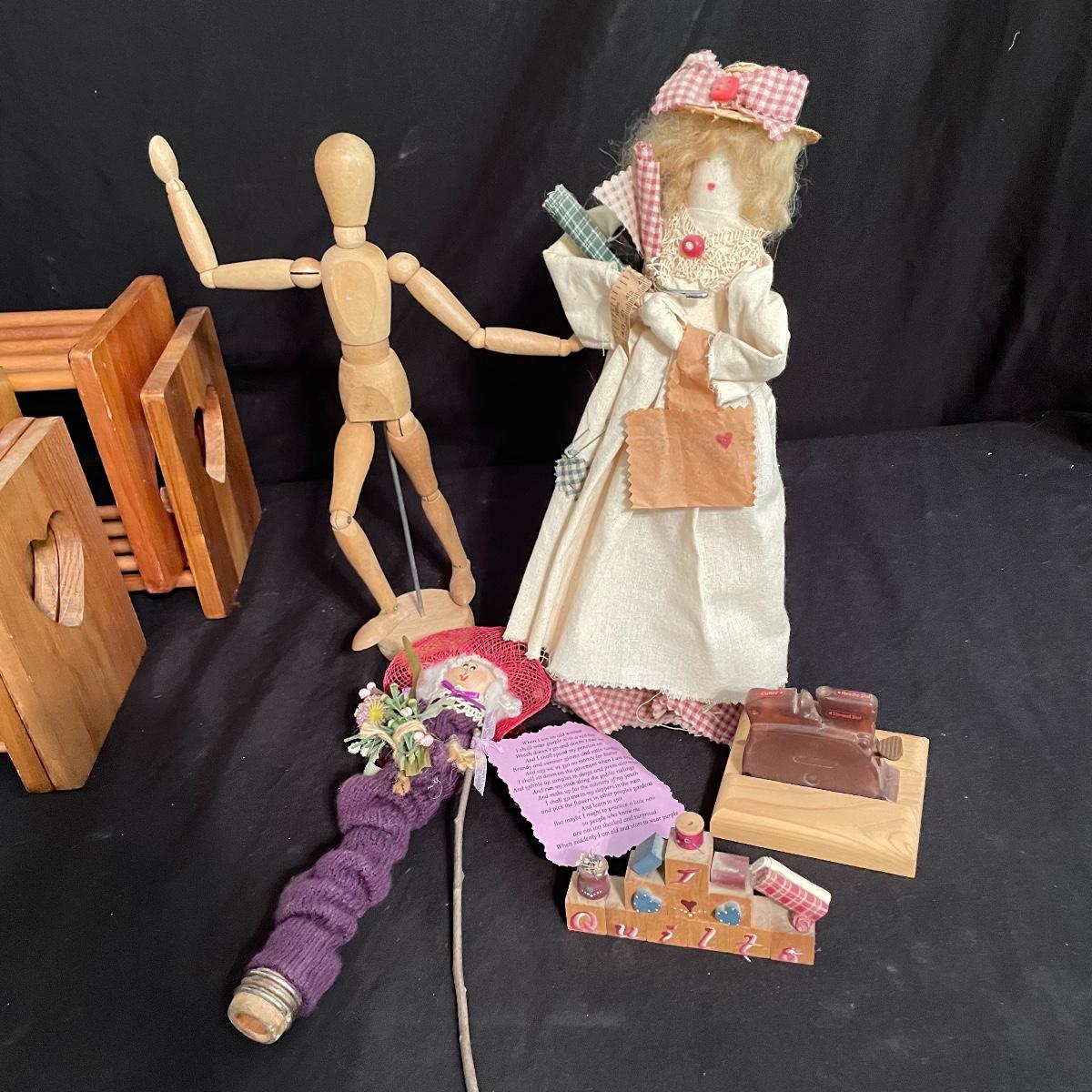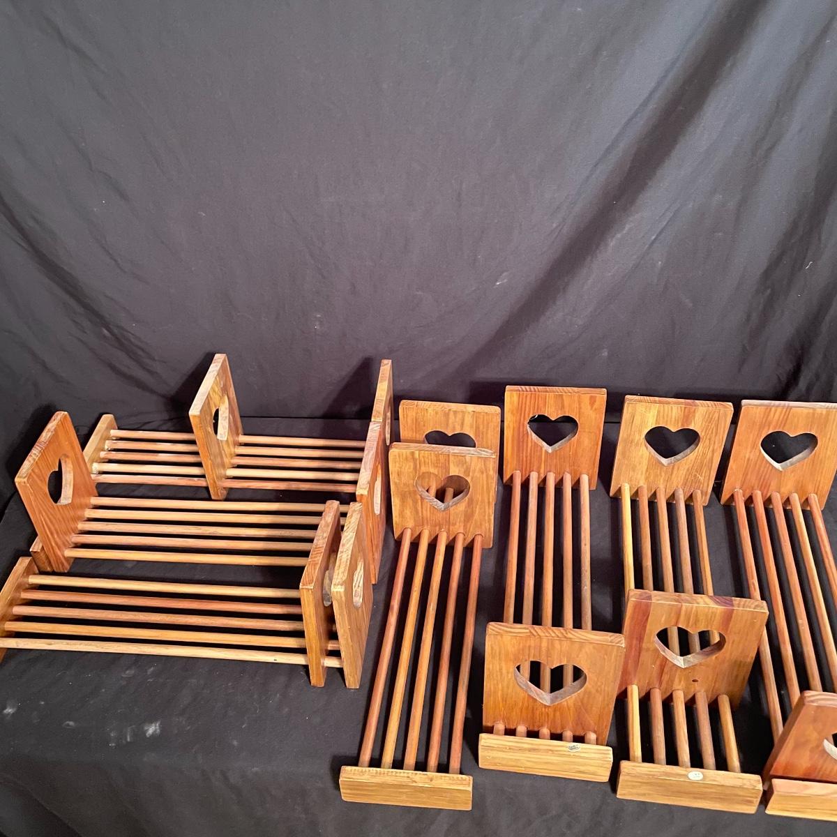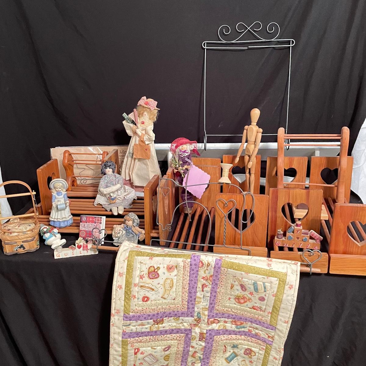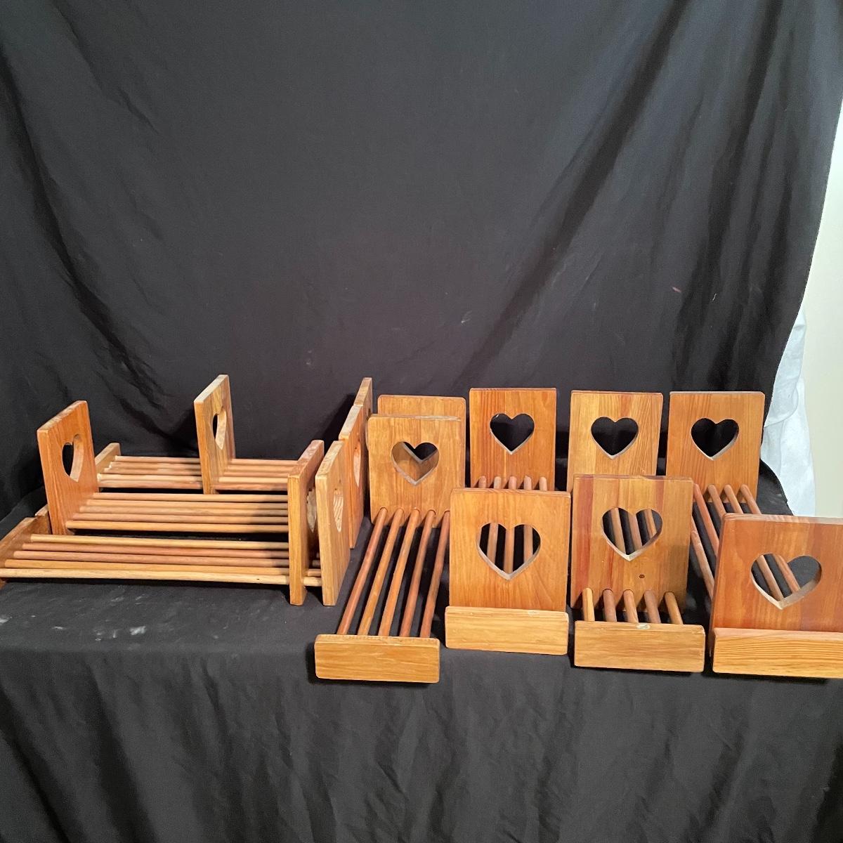 Seven heart shaped wooden racks with sliding ends to organize books, CDs, fabric, yarn or more! Fully extended at 18” x 5.5” x 7”. Lot also features metal racks for displaying art such as quilts or needle work. Dolls, figurines, a signed basket pin cushion and more! The bobbin doll is about 10”. See images. Note that the shelf has a small stain. Local pick up only.